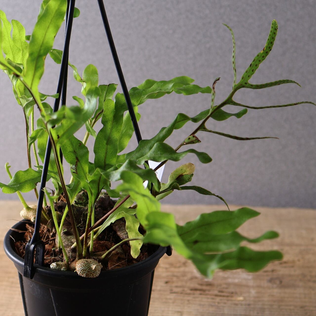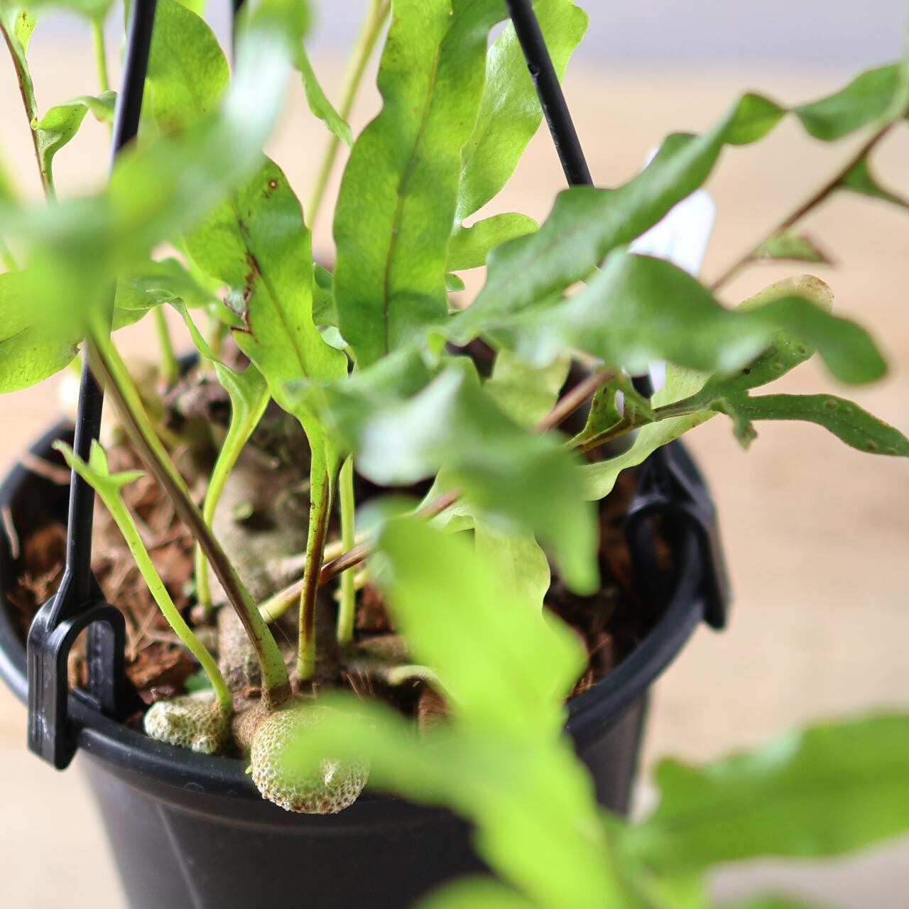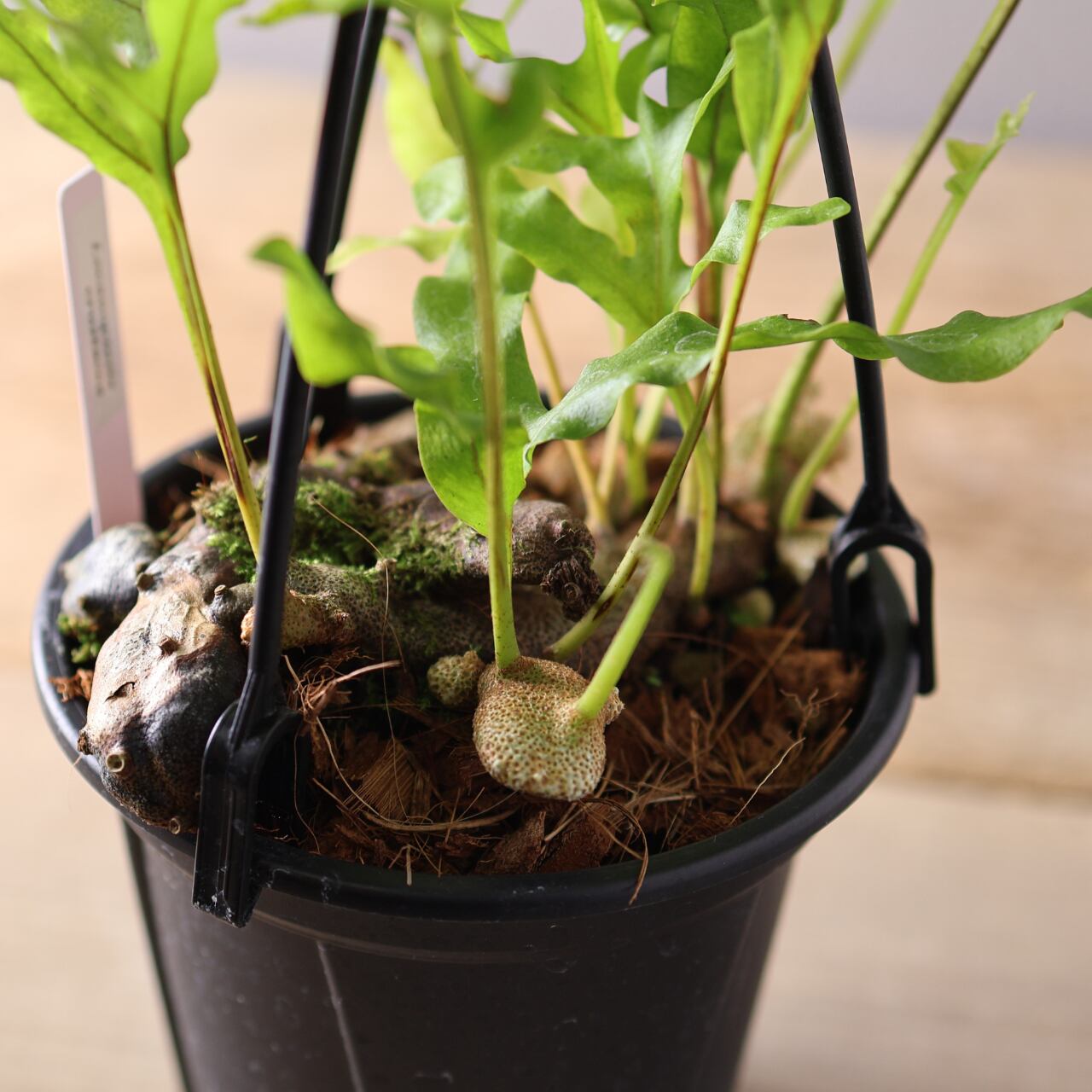 レカノプテリス・クルスタセアは、東南アジア原産の着生シダで、独特な塊状の根茎と厚みのある硬めの葉を持つのが特徴です。シダとしては珍しく、塊茎がやや多肉質でコロッとした質感を持ち、アリ植物(myrmecophyte)としてアリと共生することが知られています。