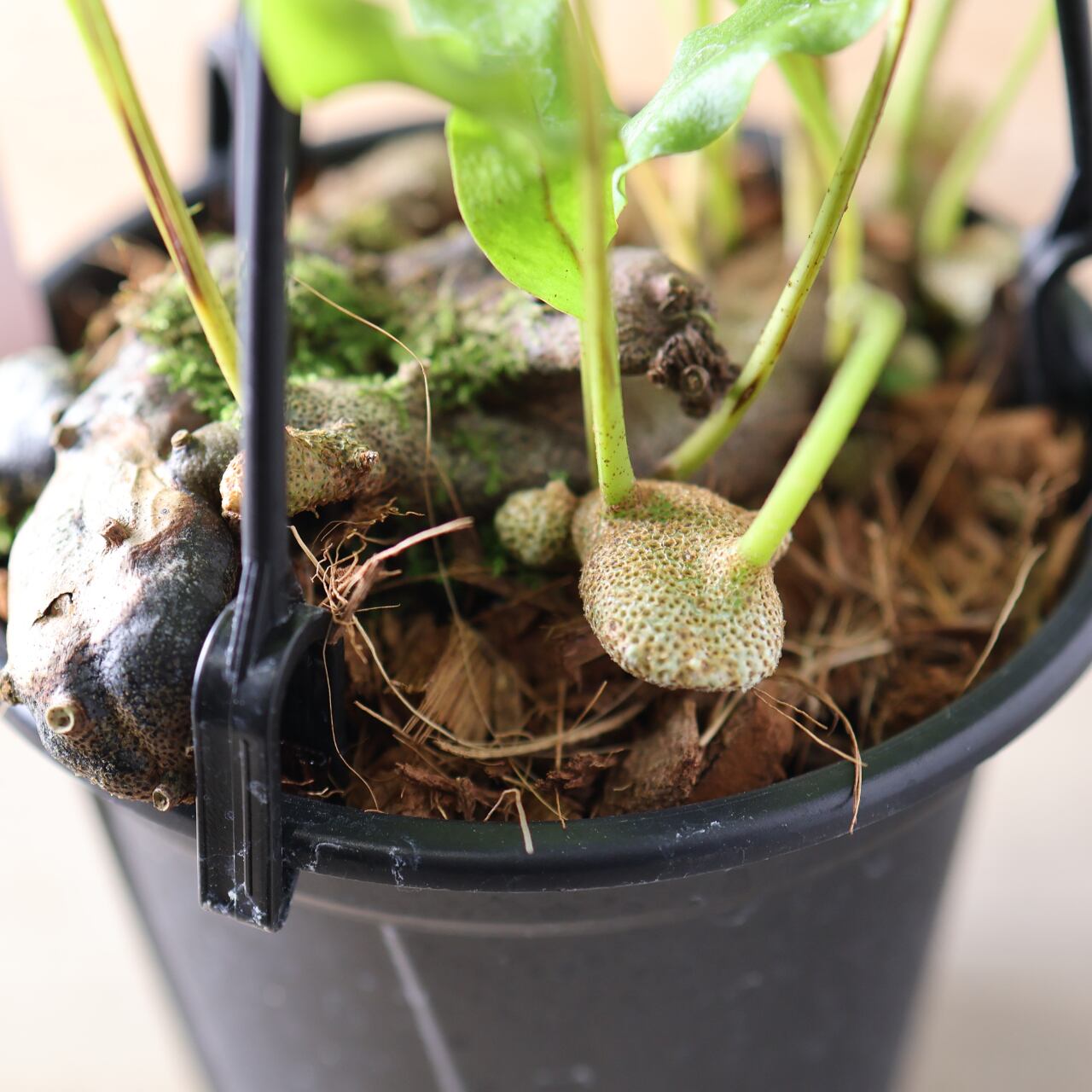 明るい日陰〜半日陰を好み、直射日光は避けます。高湿度を好むため、霧吹きで葉や塊茎を湿らせると元気に育ちます。