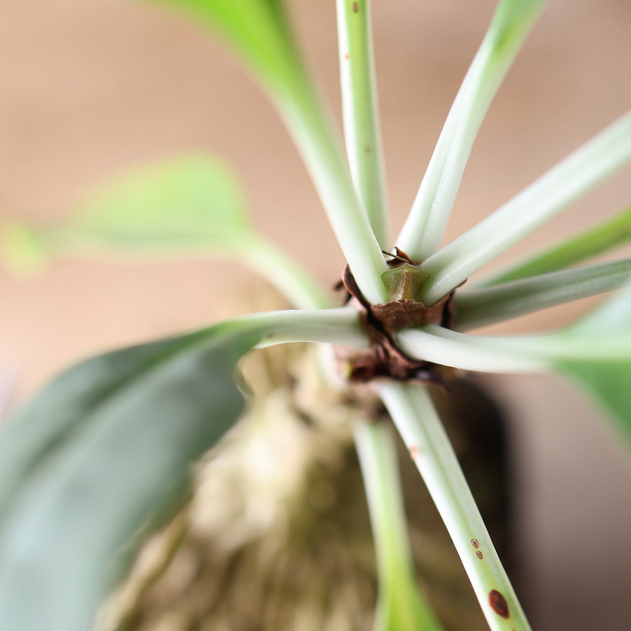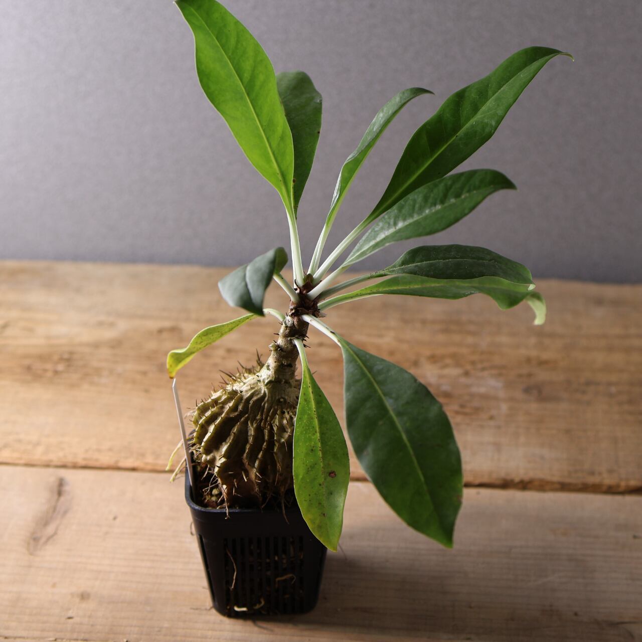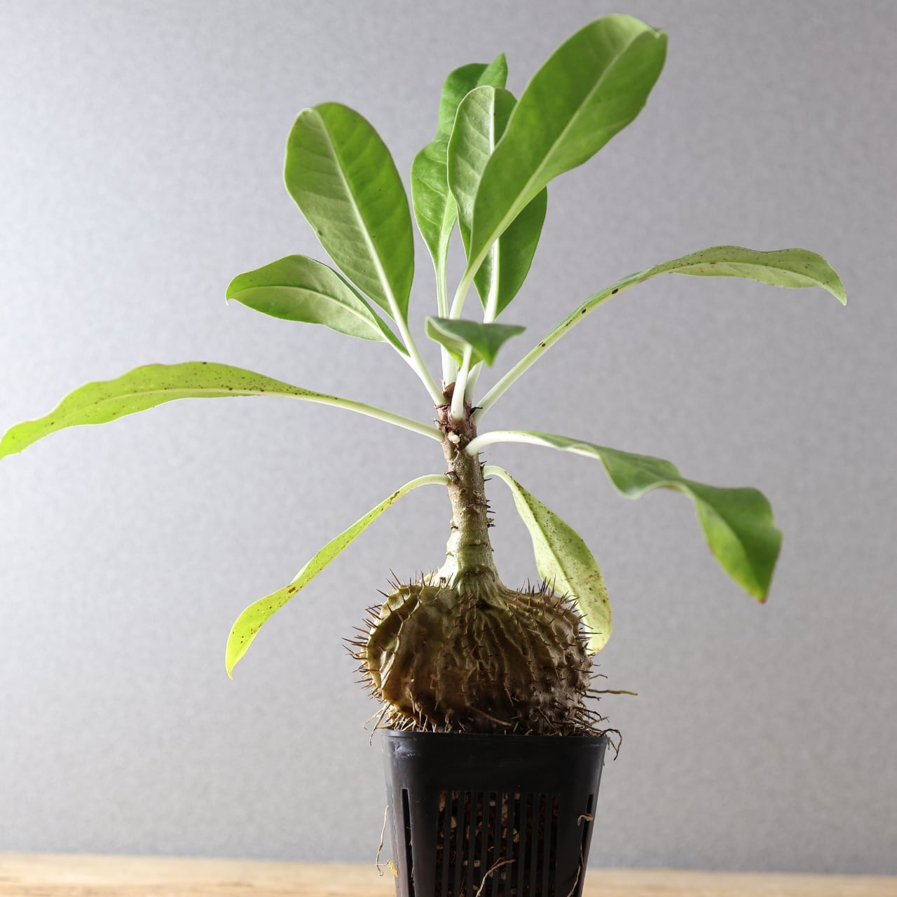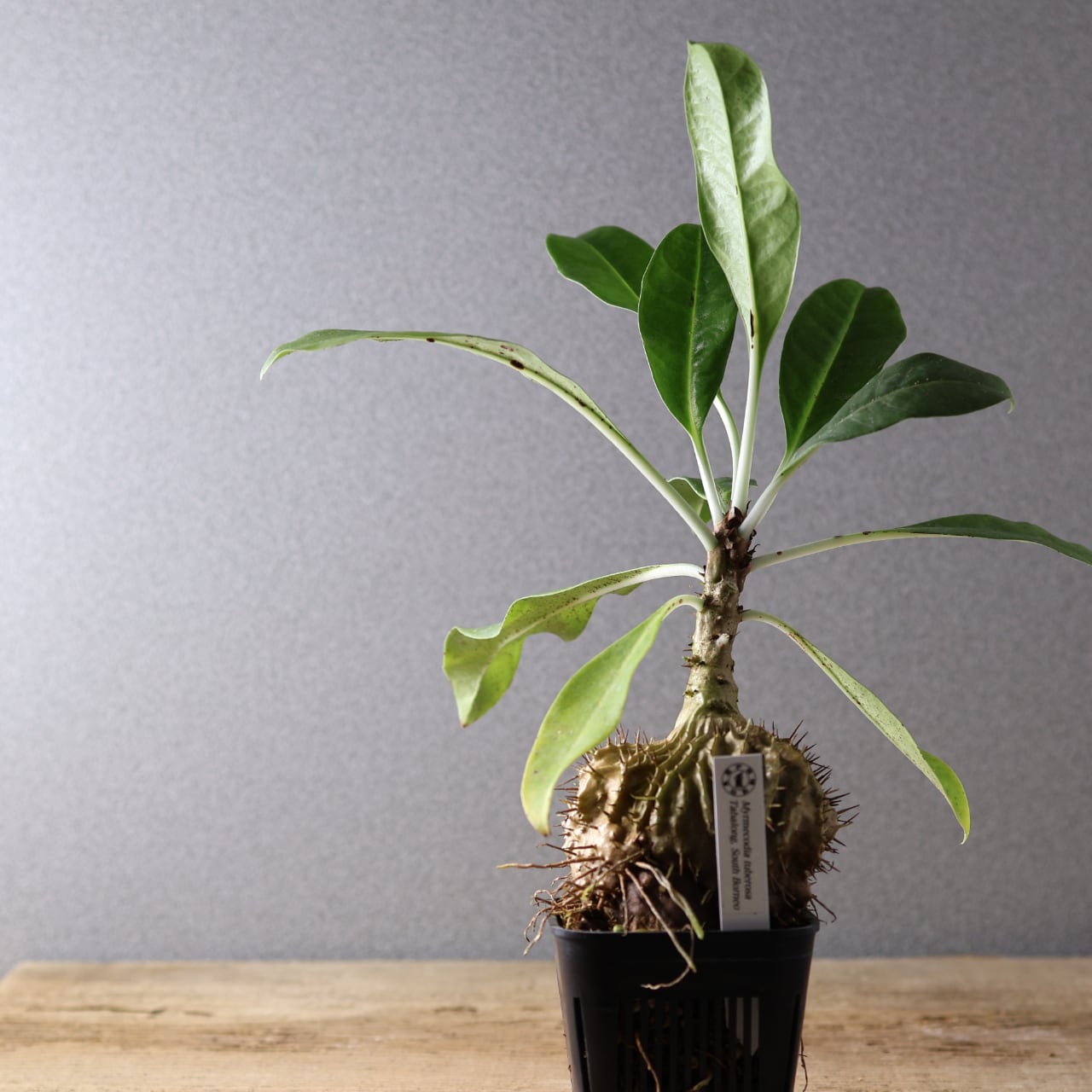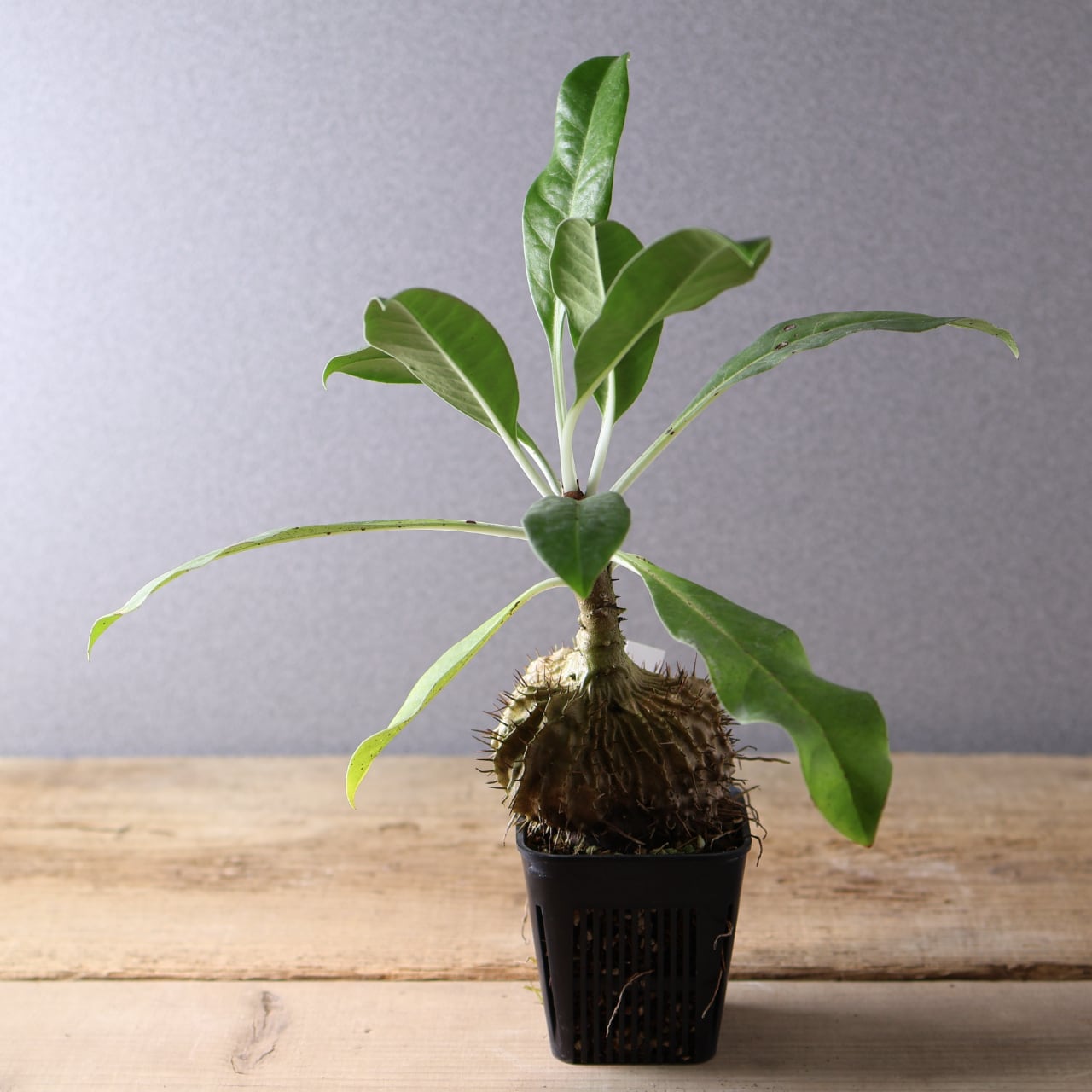 葉は小さく、光沢のある濃緑色で、塊茎の存在感とあいまってインテリアにも独特のアクセントを与えます。塊茎の形状は個体ごとに異なり、自然の造形美を楽しむことができるため、コレクターや着生植物ファンに人気です