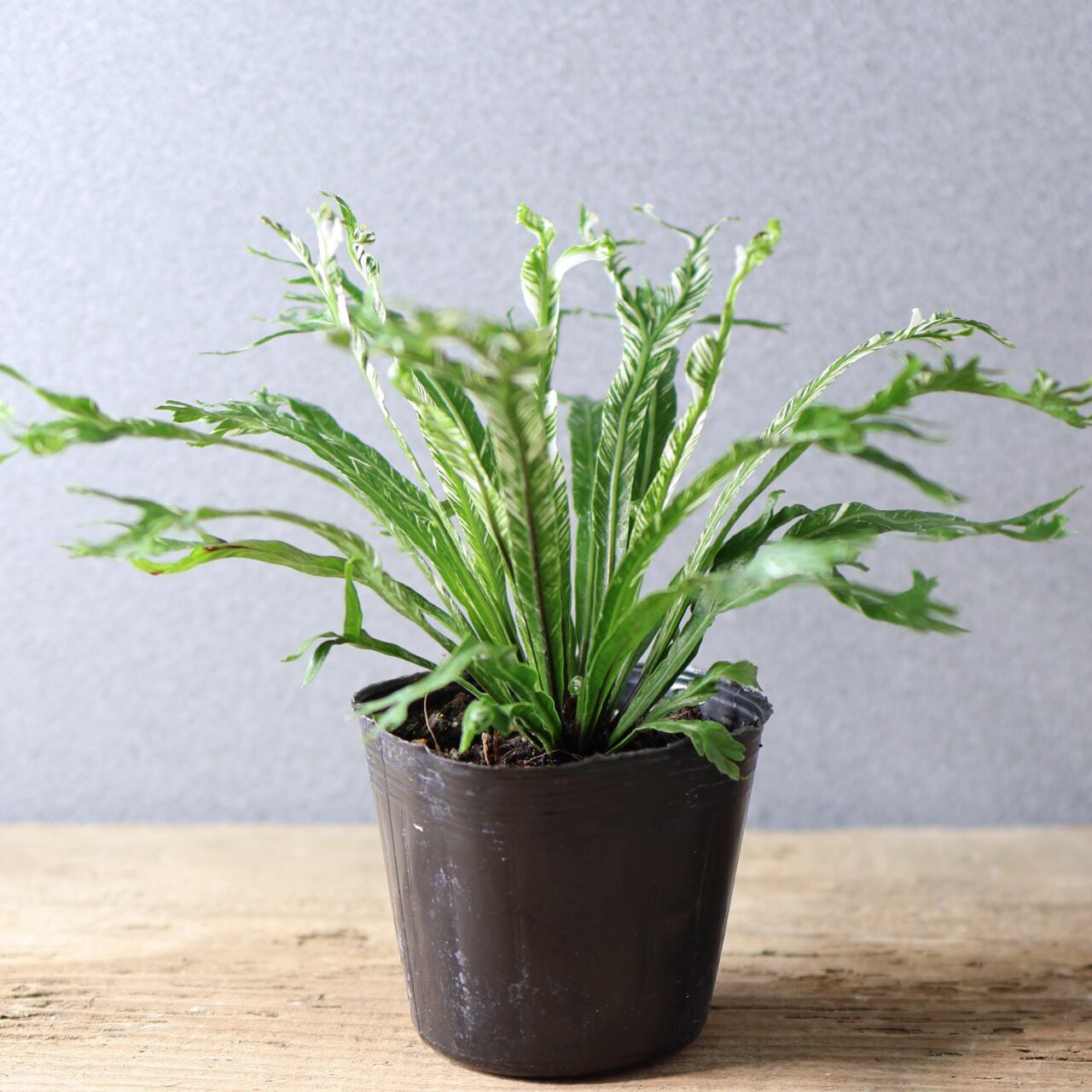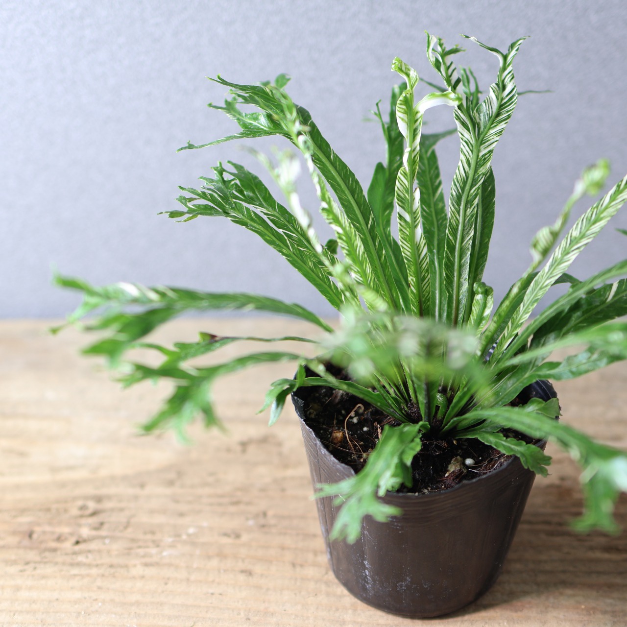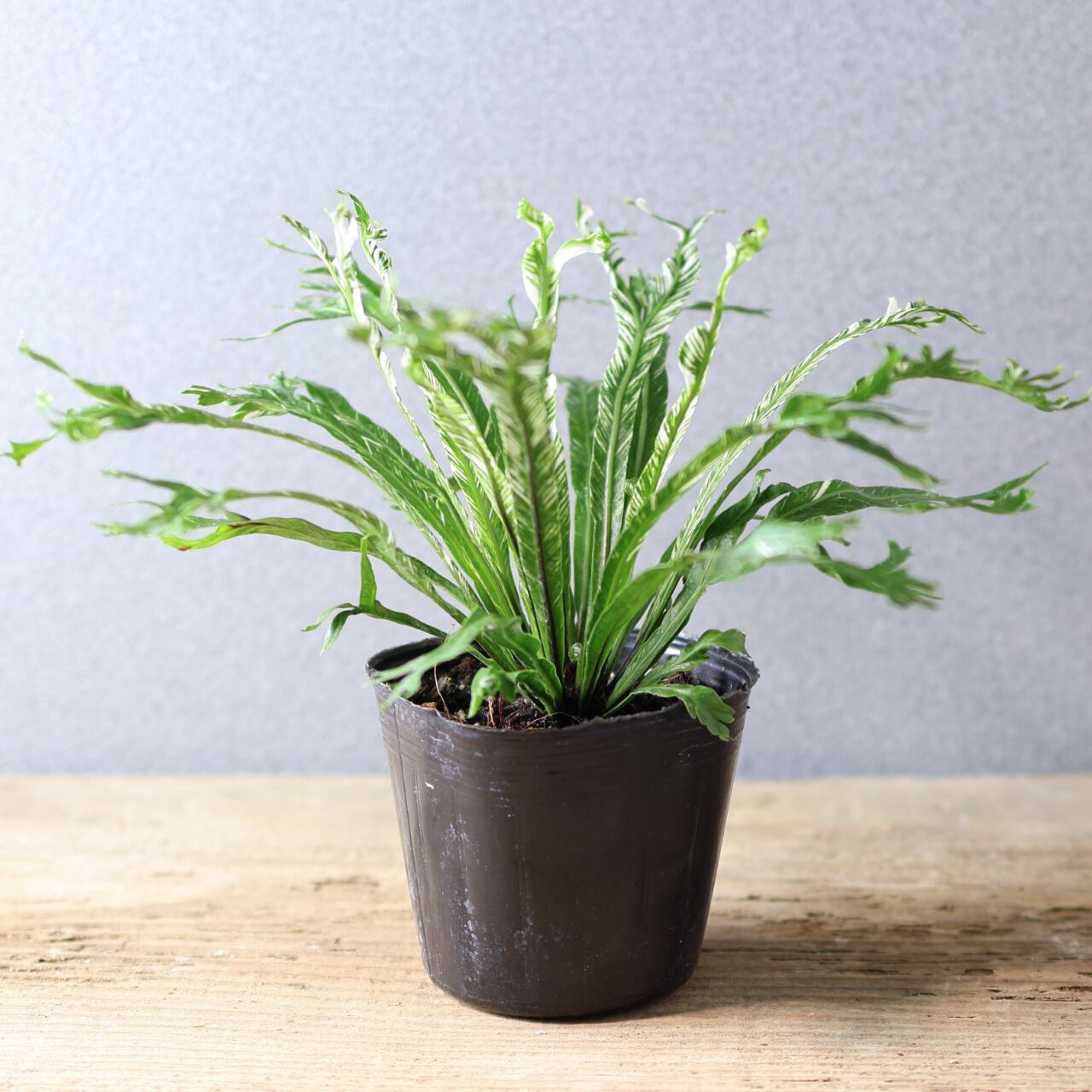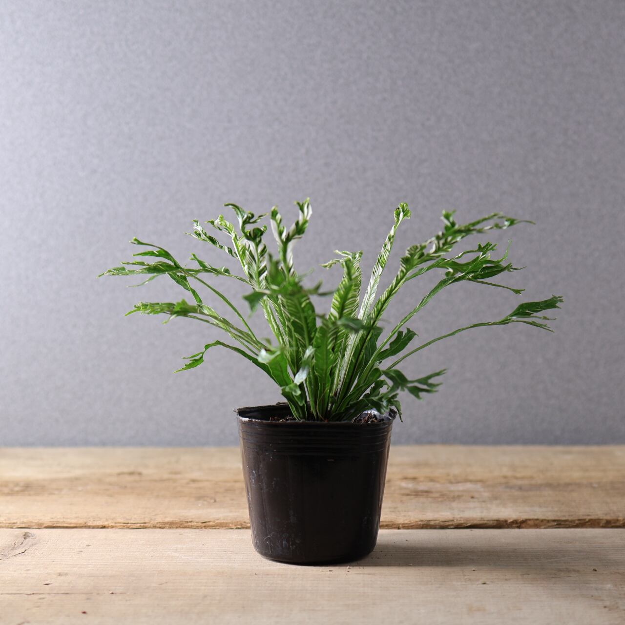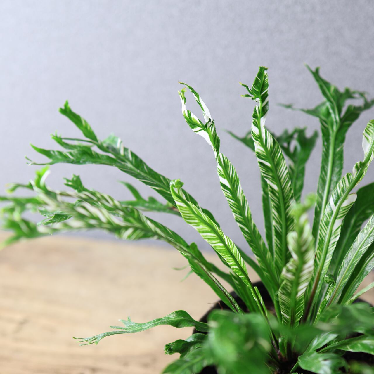 熱帯アジア原産のシダ、アスプレニウム・ニダスの斑入り品種です。大きく広がる葉は、中央から放射状に伸び、光沢のある濃緑の葉にクリーム色や淡緑色の斑が入るのが特徴です。