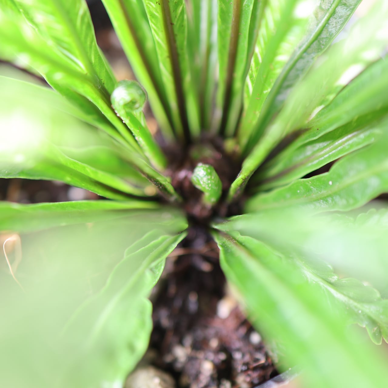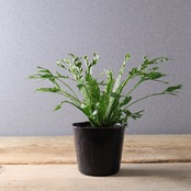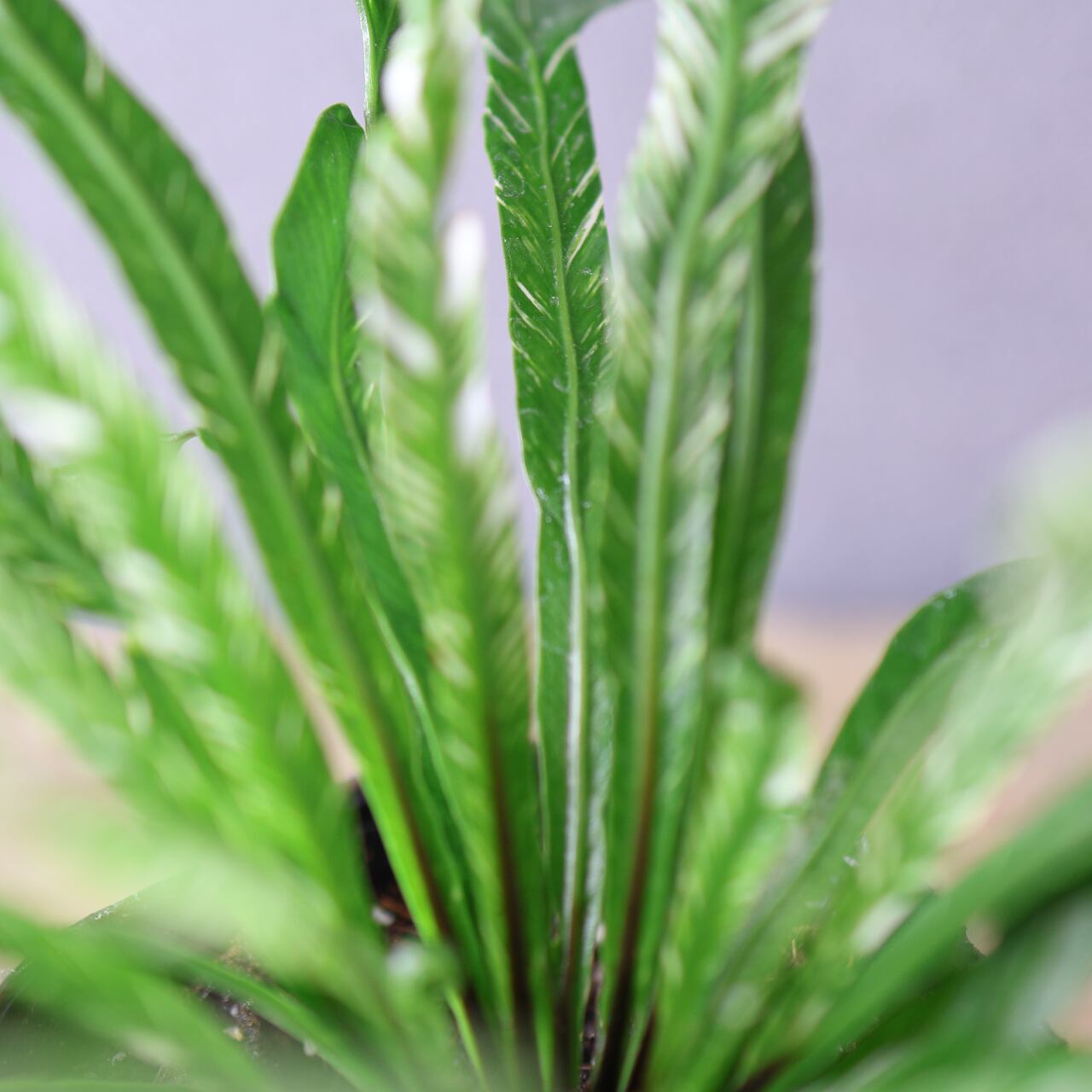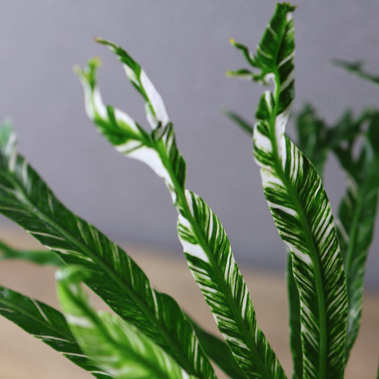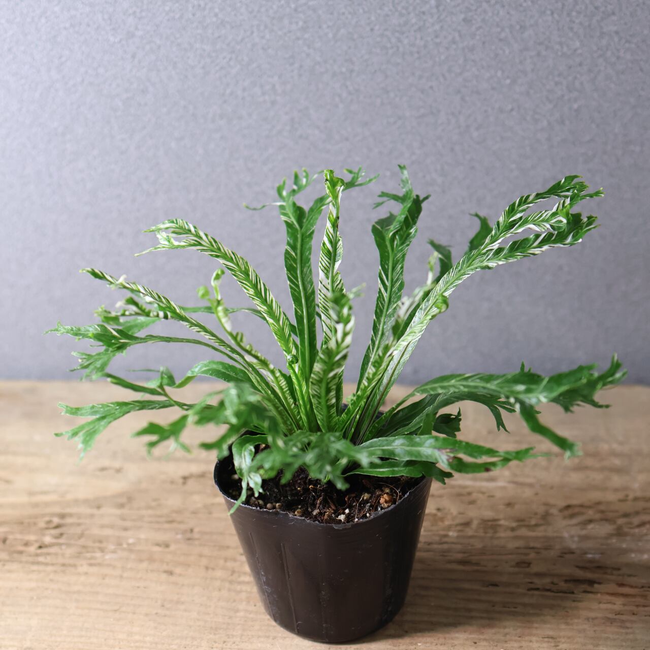 熱帯アジア原産のシダ、アスプレニウム・ニダスの斑入り品種です。大きく広がる葉は、中央から放射状に伸び、光沢のある濃緑の葉にクリーム色や淡緑色の斑が入るのが特徴です。