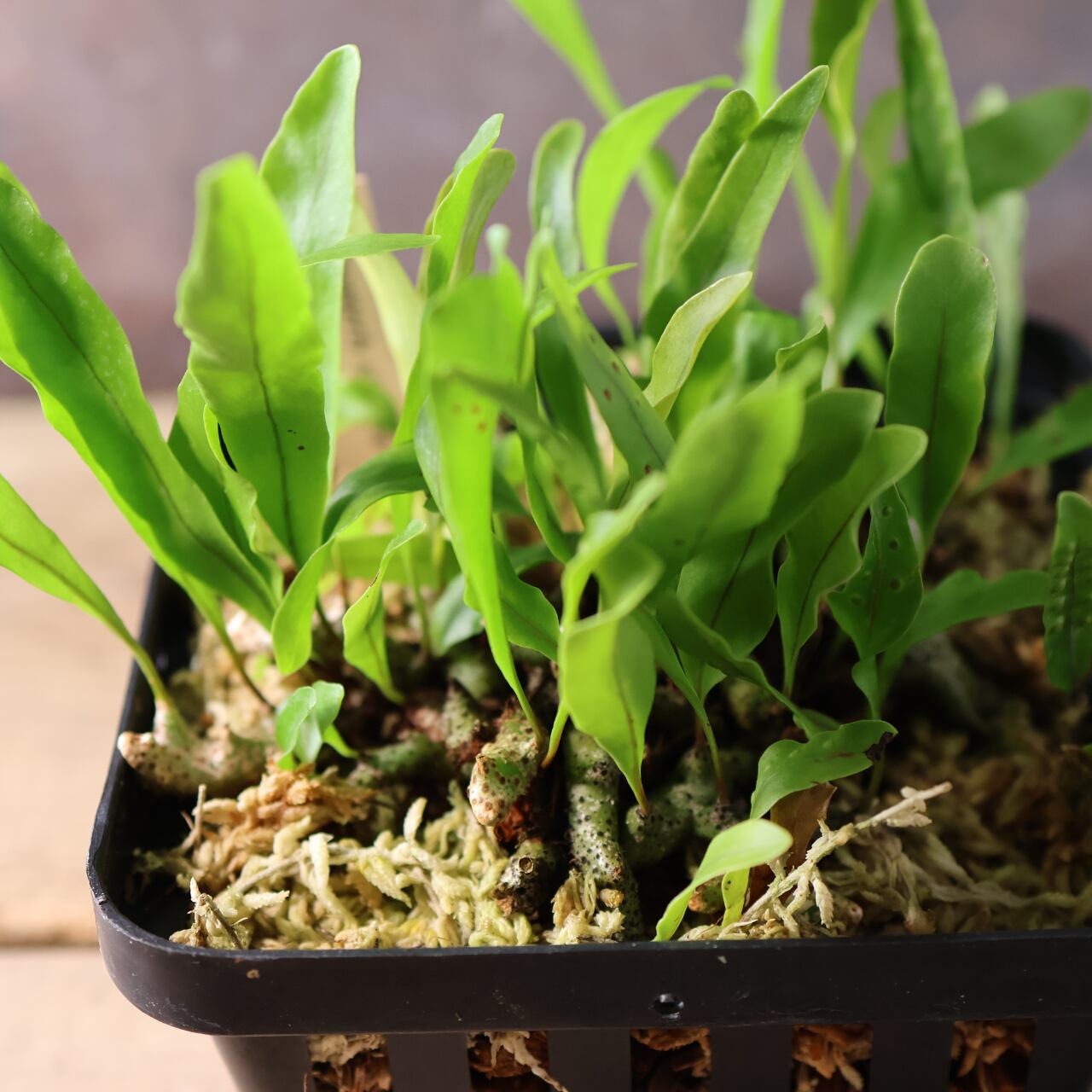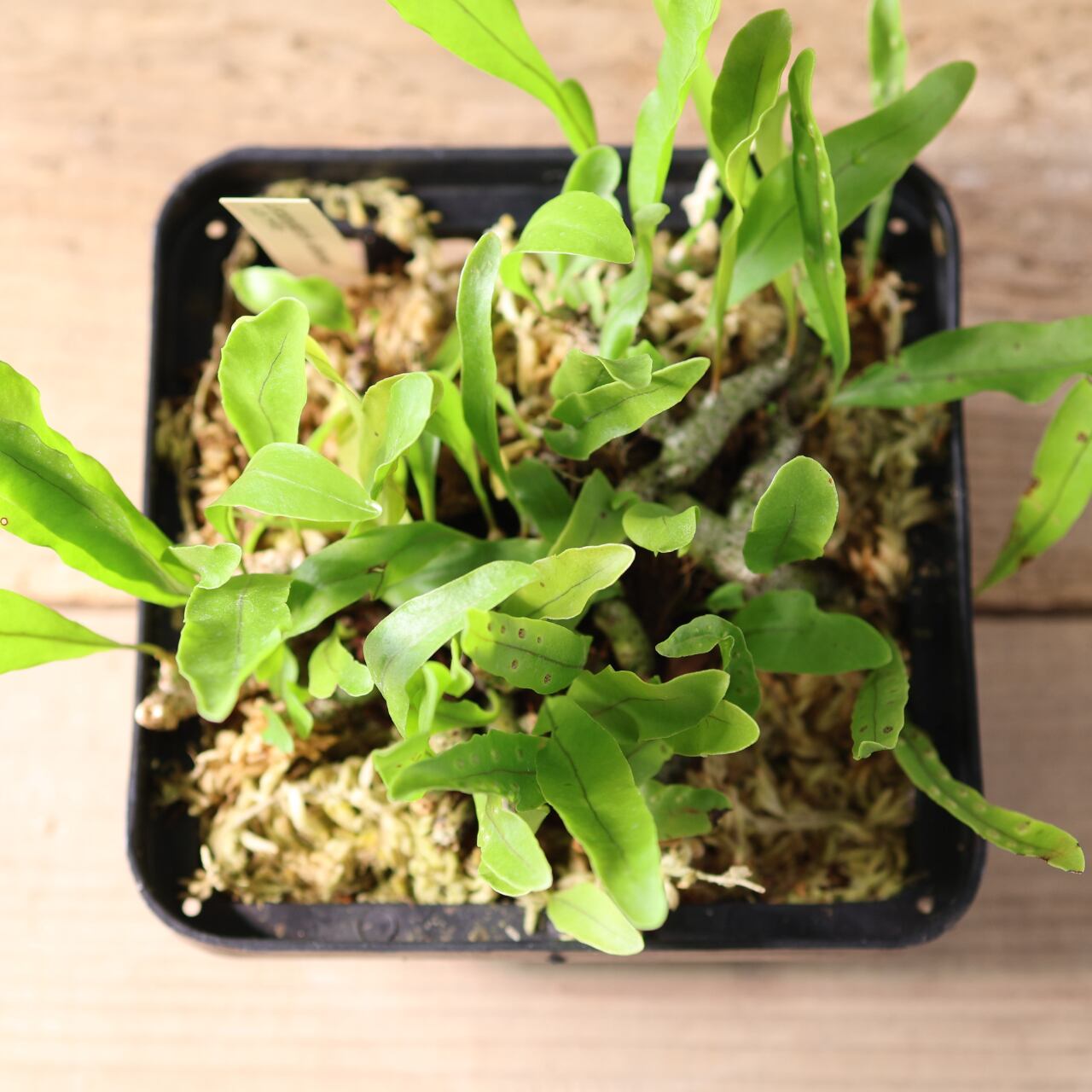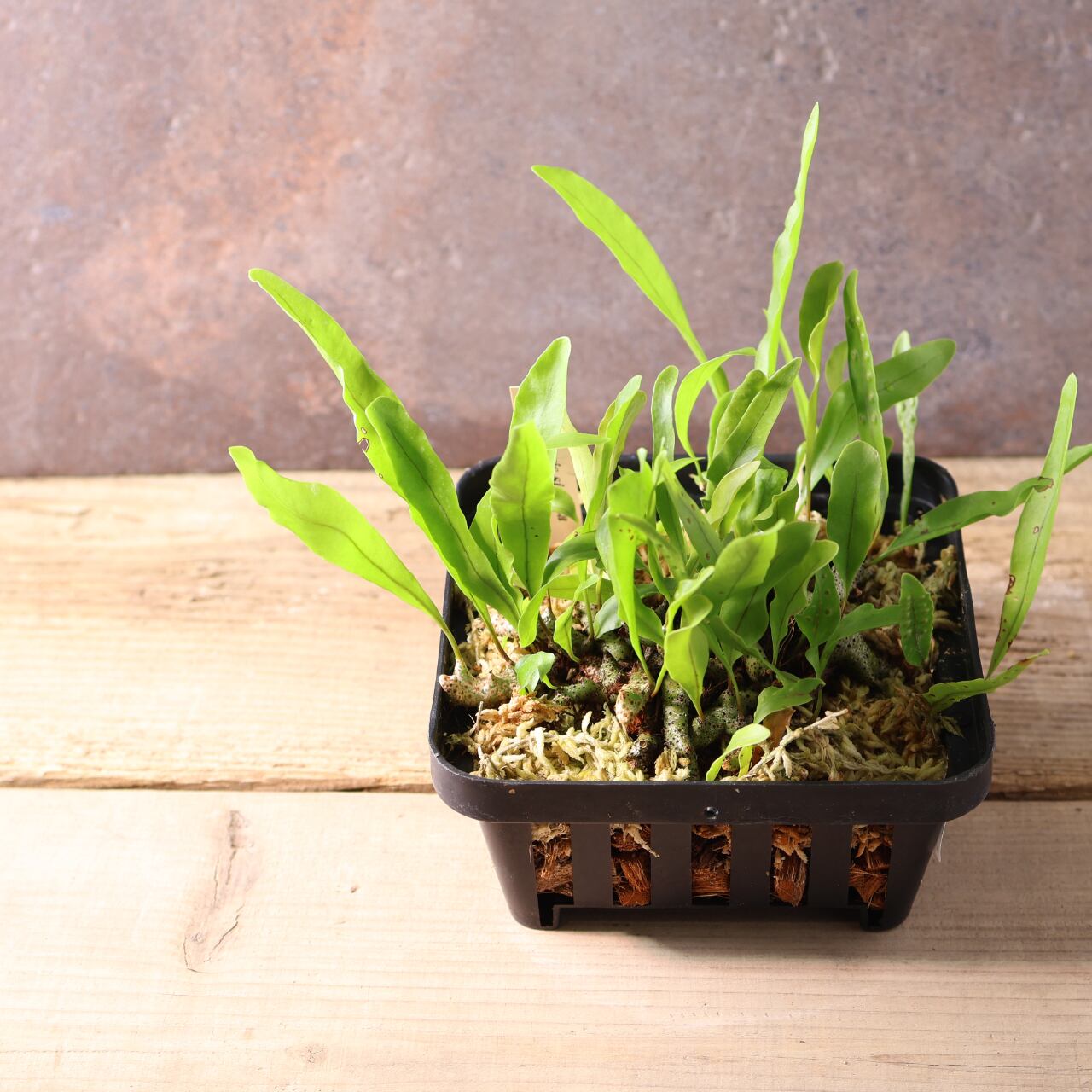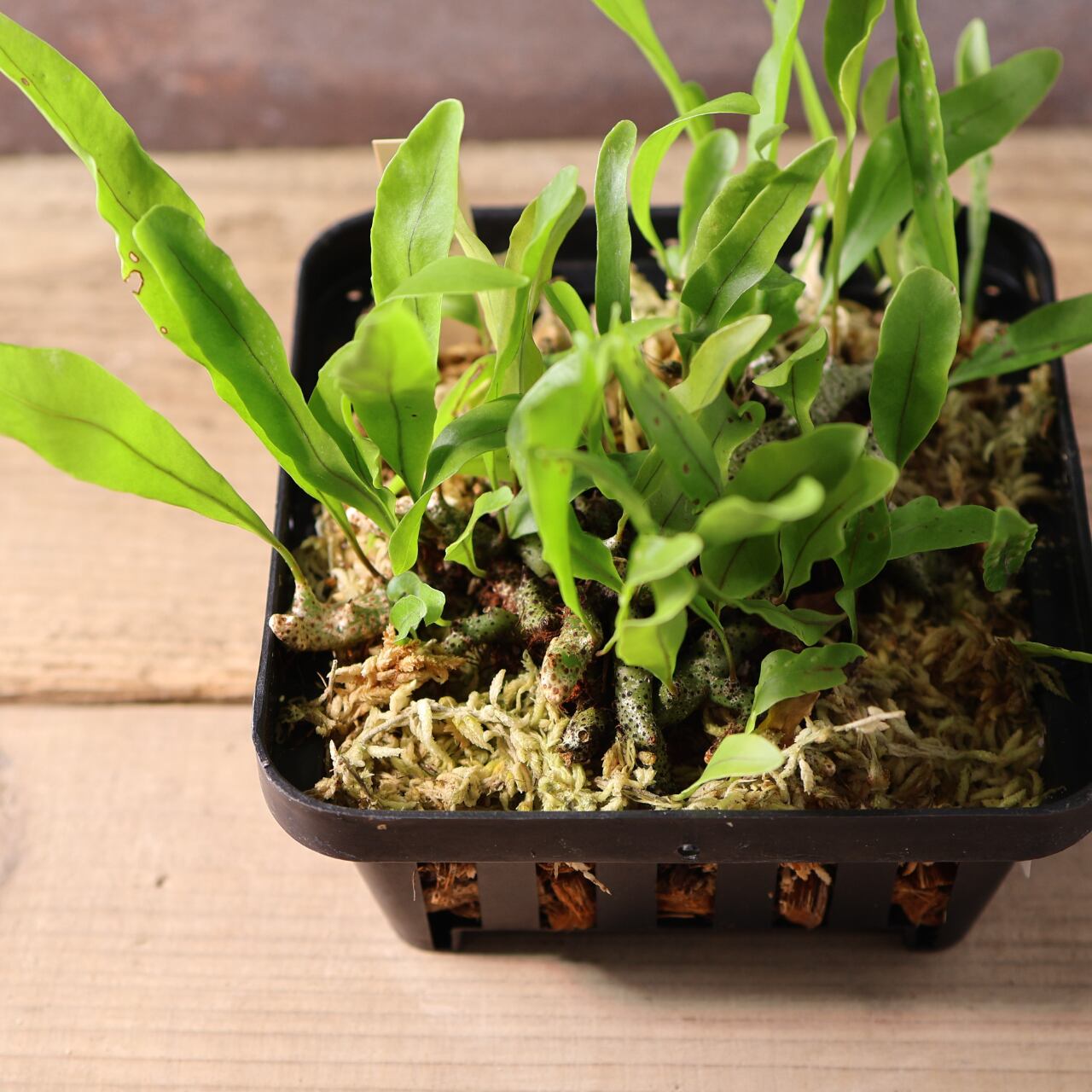 インドネシアやマレーシアなどの熱帯雨林に自生するアリ植物のシダ。コルク質の太い根茎(リゾーム)の内部に空洞をもち、そこにアリが巣を作ることで共生関係を築くという、非常にユニークな生態を持ちます。根茎は年月を重ねるごとにコブのように肥大し、個性的で力強い姿に成長。苔むした流木や樹皮に着生させると、まるで森の一部を切り取ったような景観を楽しめます。