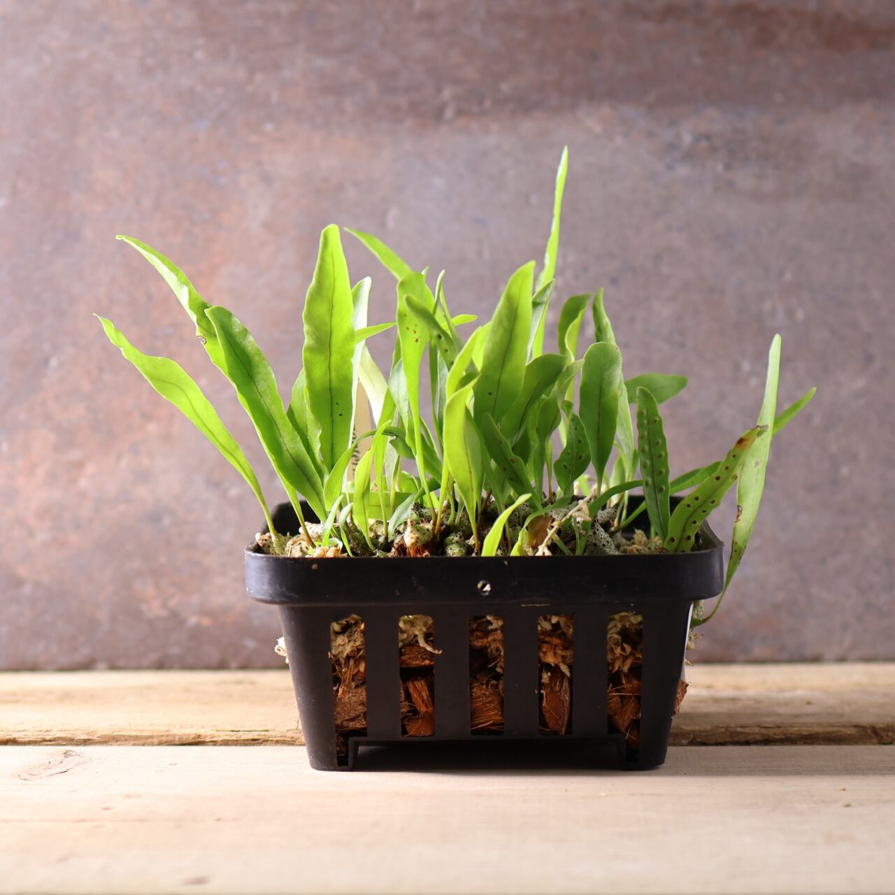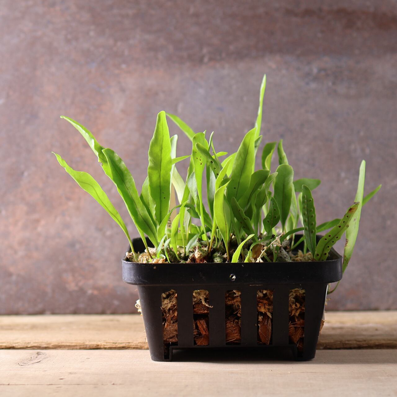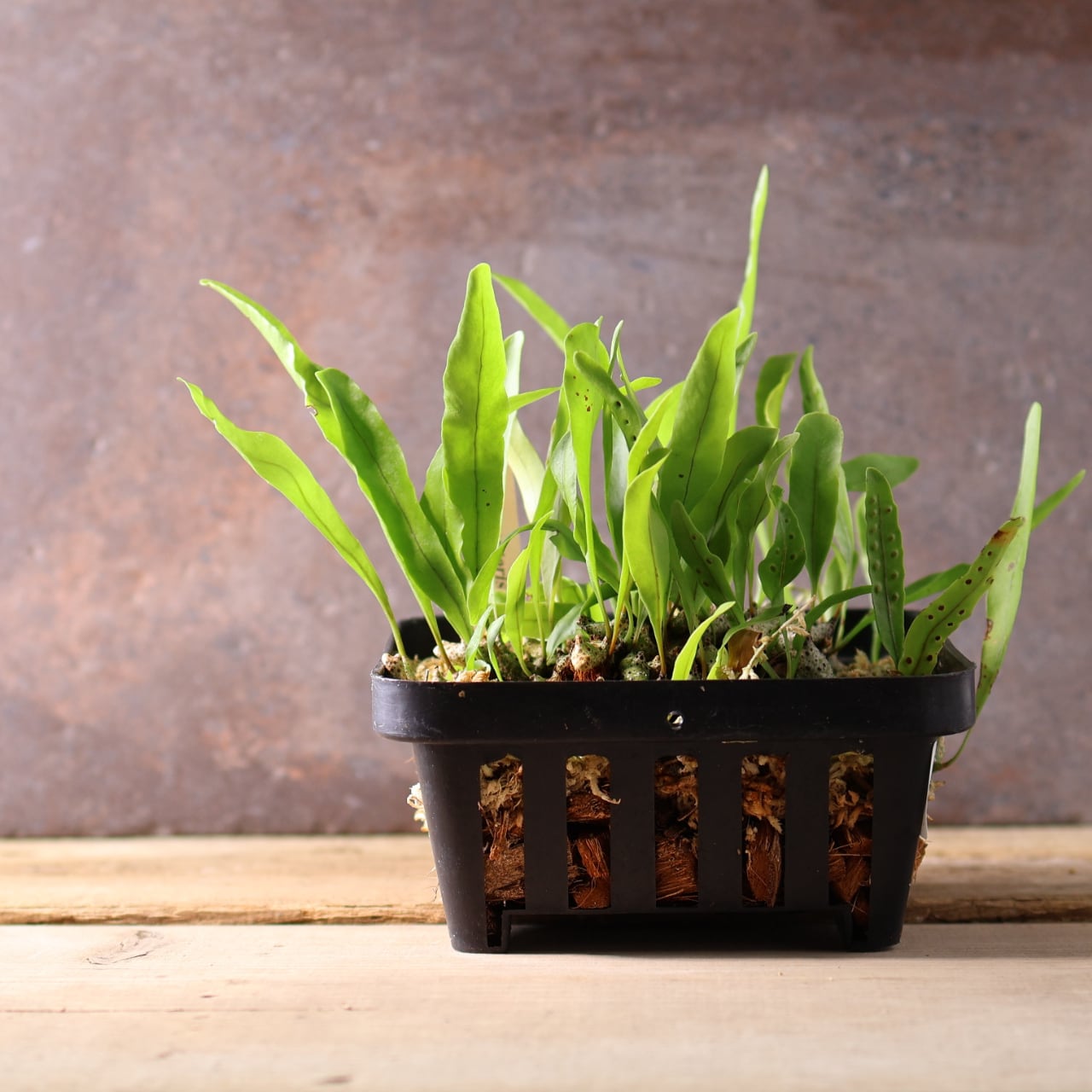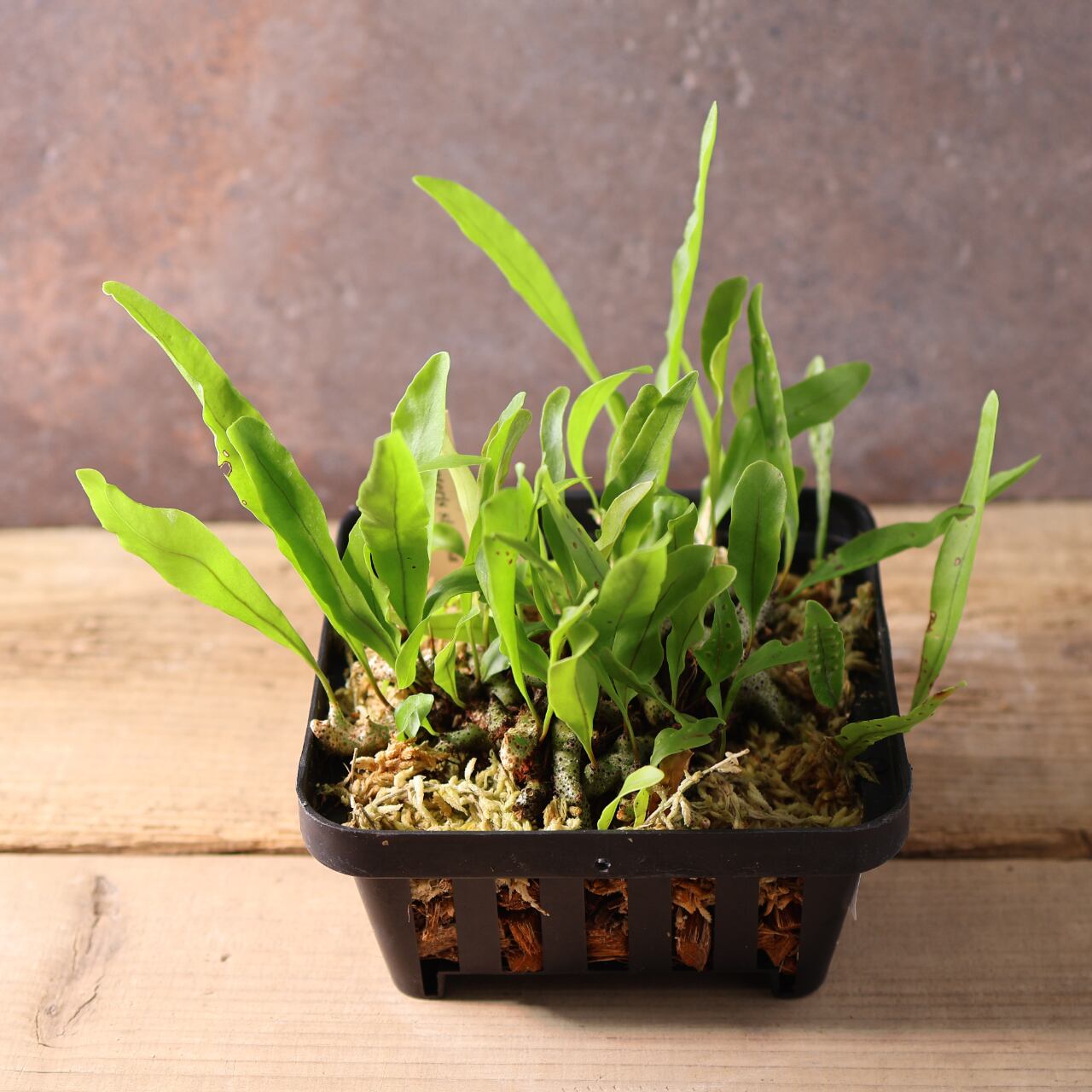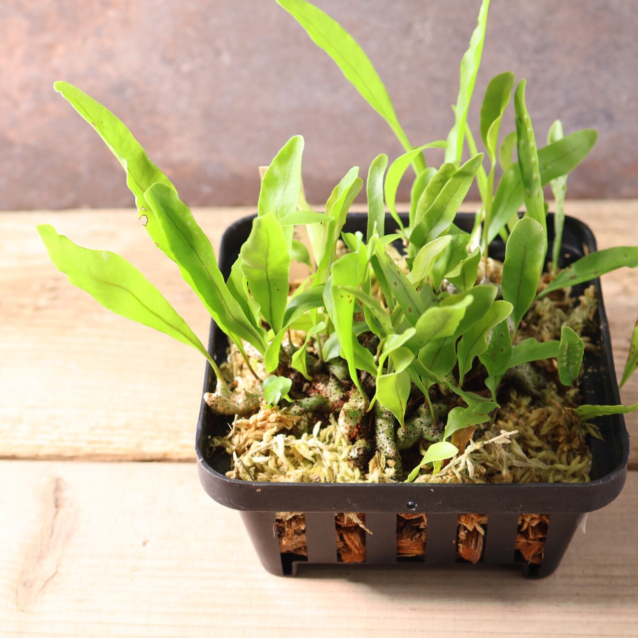 インドネシアやマレーシアなどの熱帯雨林に自生するアリ植物のシダ。コルク質の太い根茎(リゾーム)の内部に空洞をもち、そこにアリが巣を作ることで共生関係を築くという、非常にユニークな生態を持ちます。根茎は年月を重ねるごとにコブのように肥大し、個性的で力強い姿に成長。苔むした流木や樹皮に着生させると、まるで森の一部を切り取ったような景観を楽しめます。