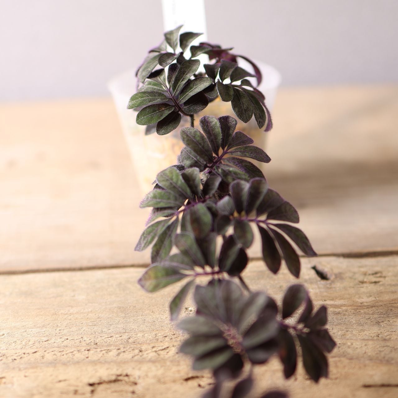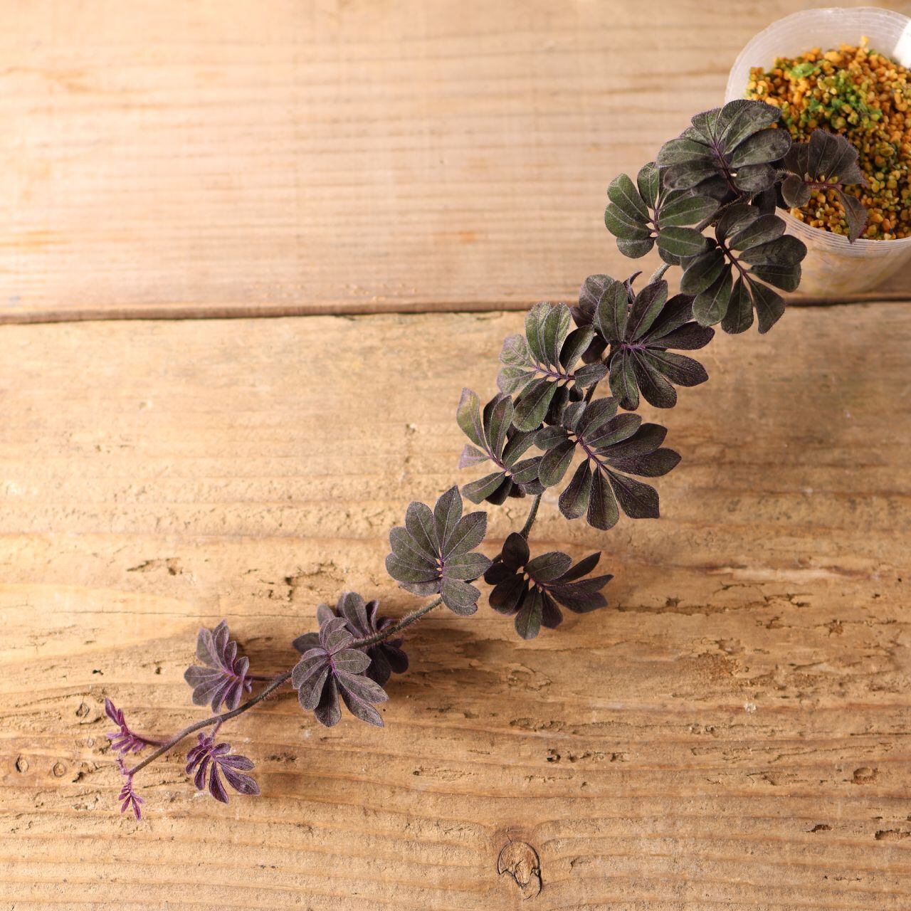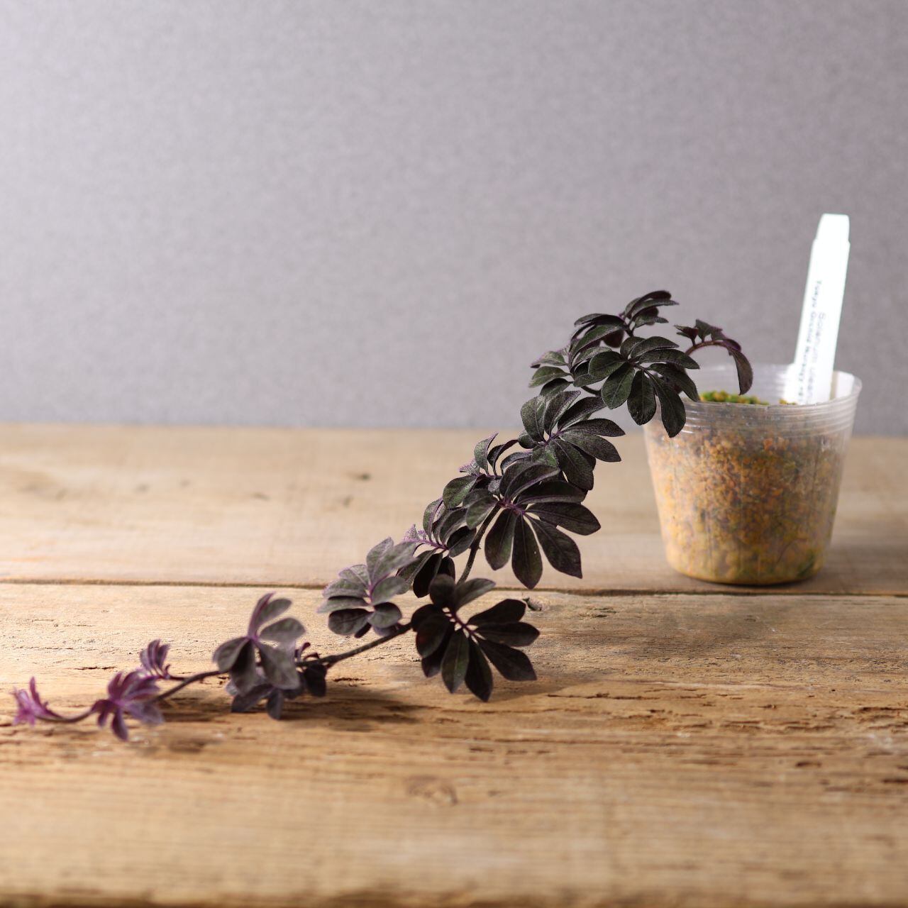 緑の葉に紫色の毛が生えた独特な色味は水槽で熱帯雨林を再現する際に締め色になります。