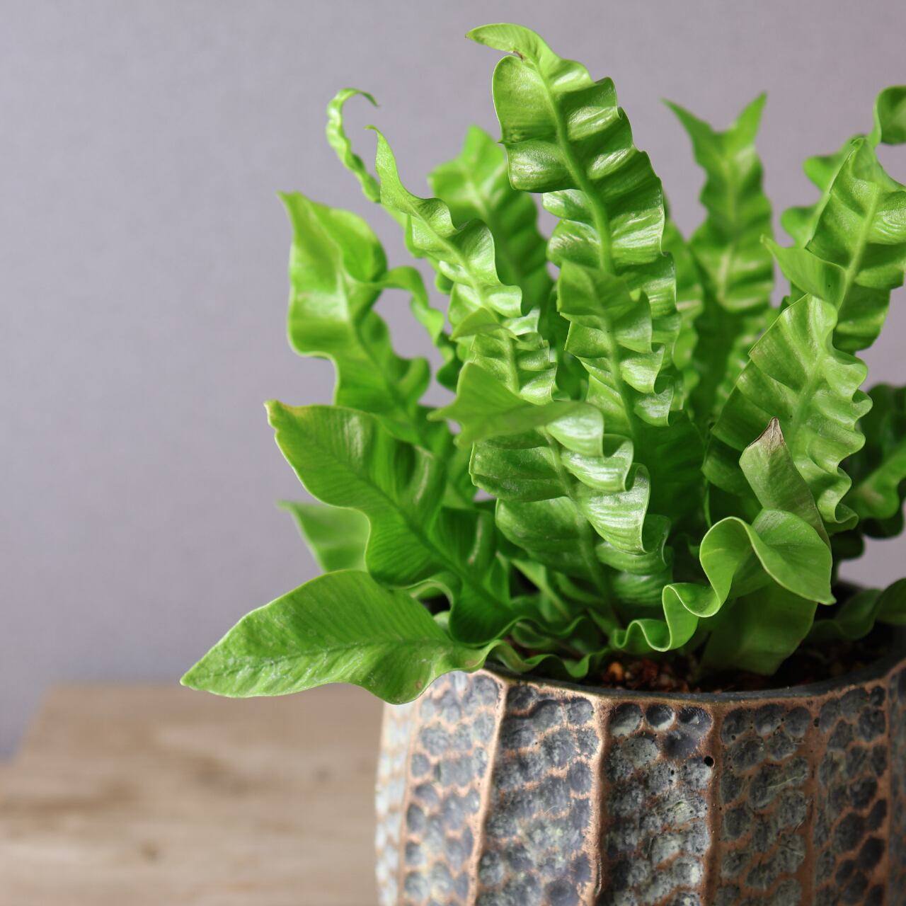 シダ植物の中でも比較的丈夫で、明るい日陰でもよく育ちます。湿度を保ちつつ、直射日光を避けることで、美しい葉色とつやを長く保つことができます。リビングや玄関、浴室のグリーンとしても人気の品種です。