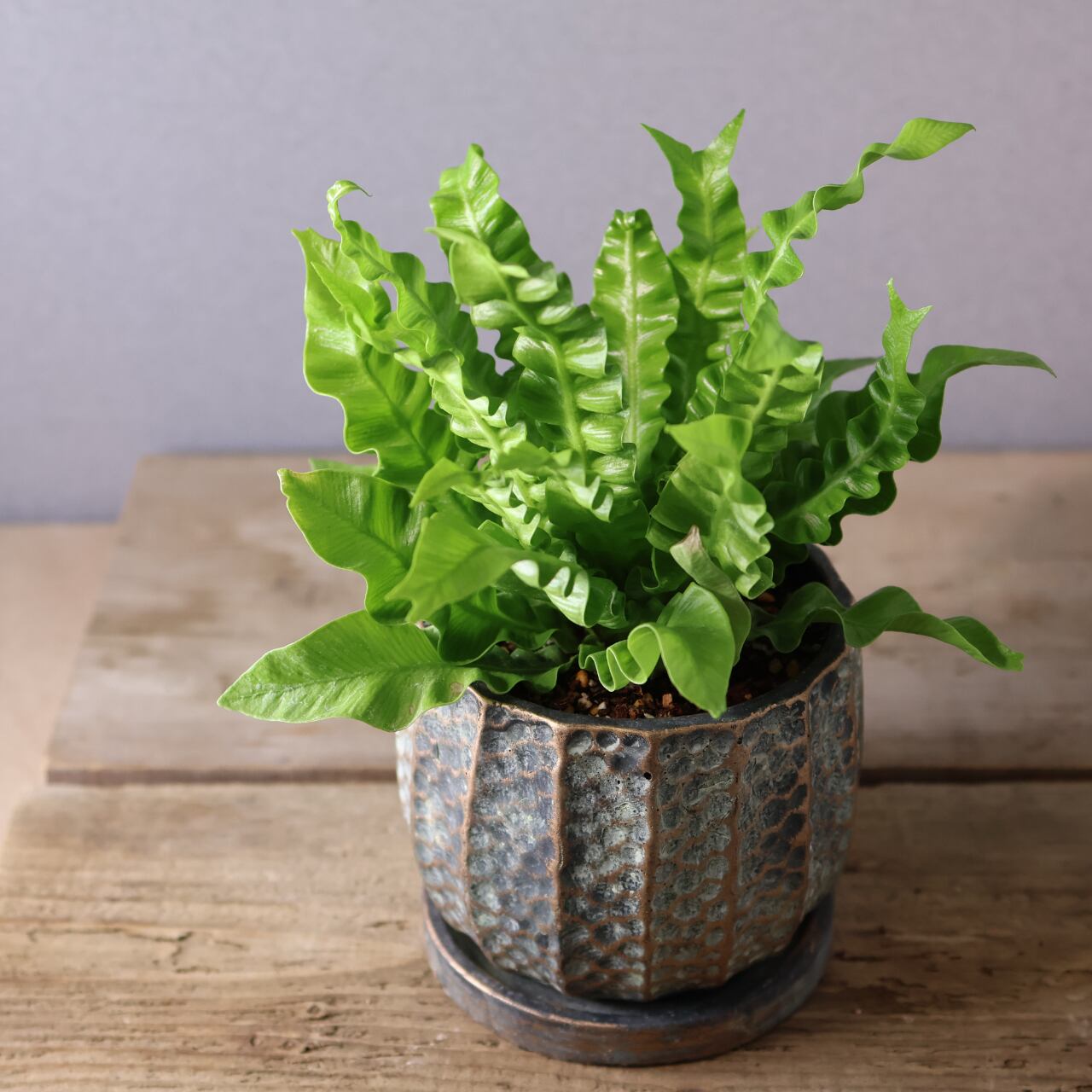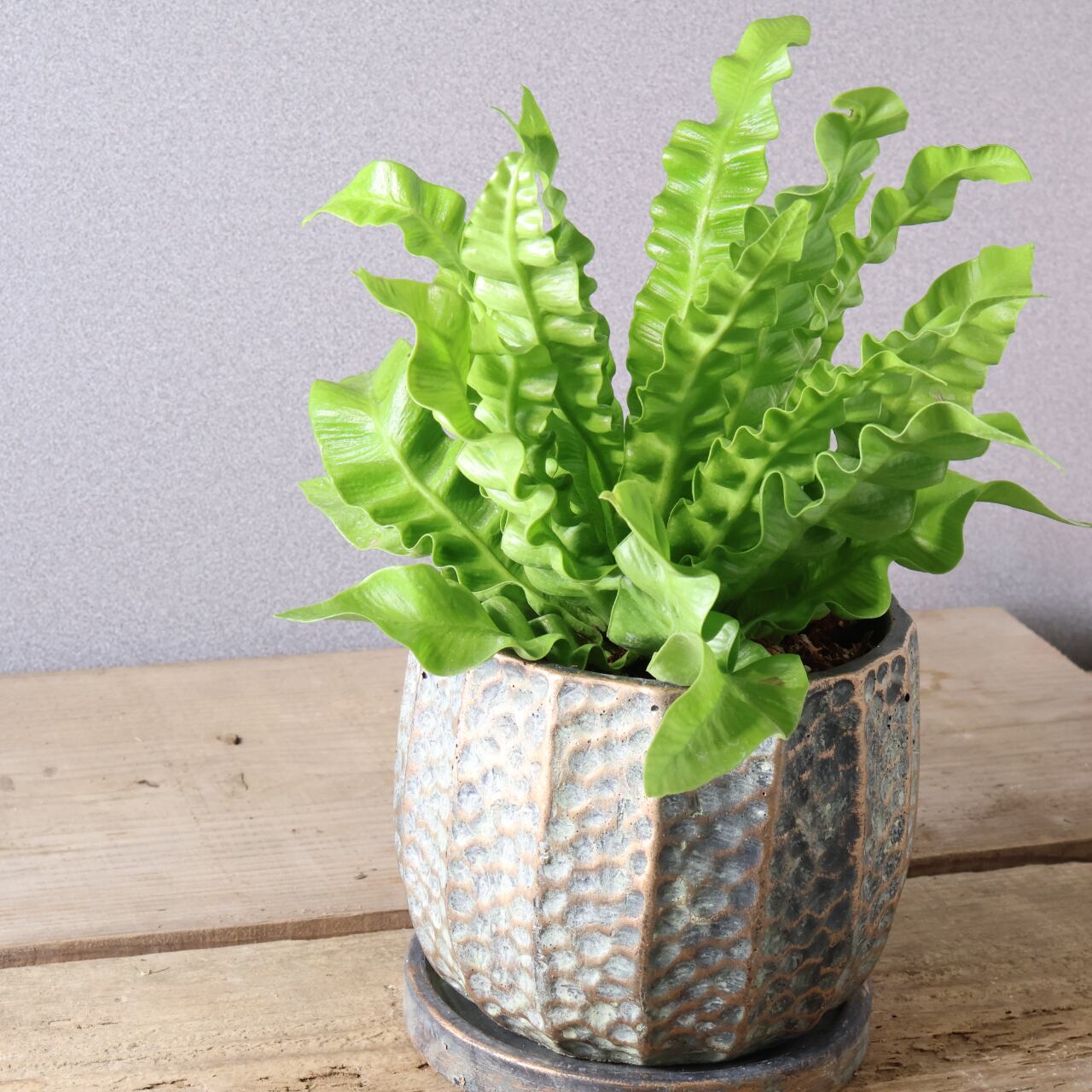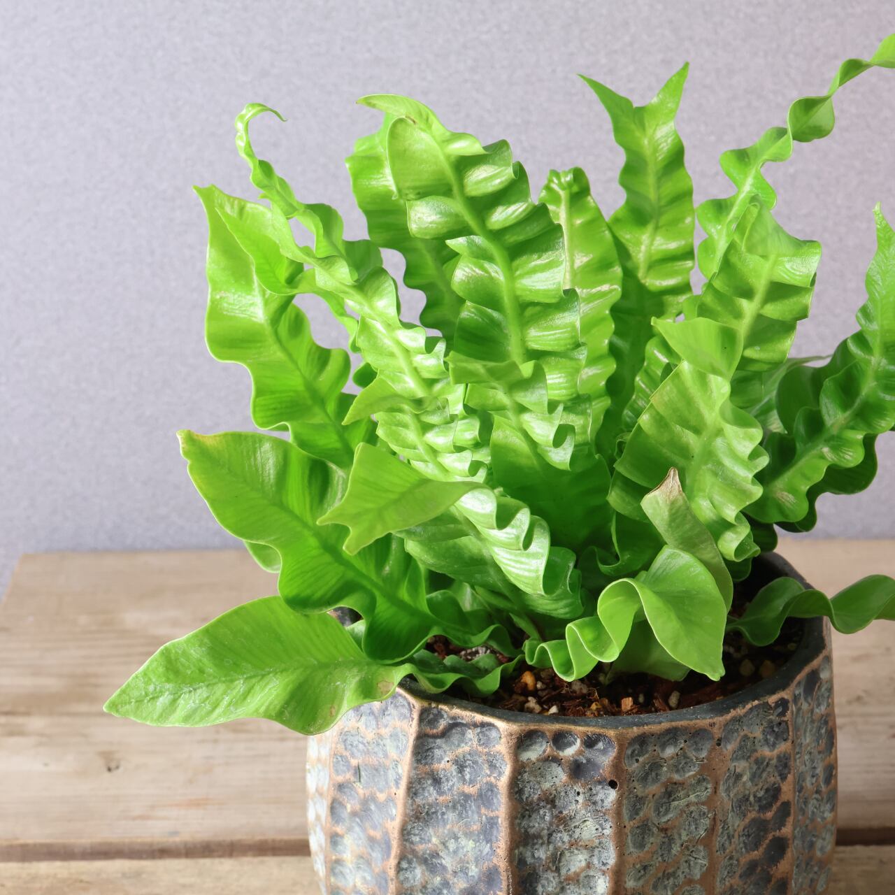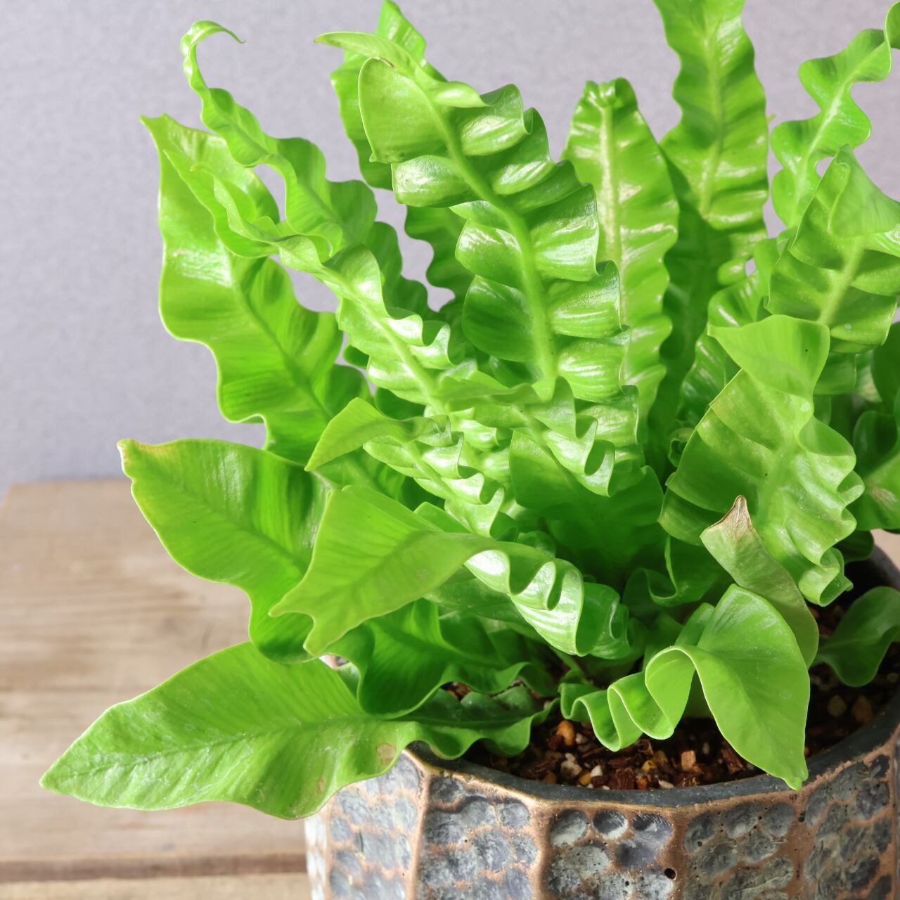 鮮やかなエメラルドグリーンの葉が波打つように広がる、人気のシダ植物。深い緑と艶やかな質感が魅力で、名前の通りまるで“緑の波”が流れるような姿を楽しめます。葉の中心から規則的に放射状に広がる姿はとても美しく、インテリアに取り入れるだけで空間がぐっと爽やかに。