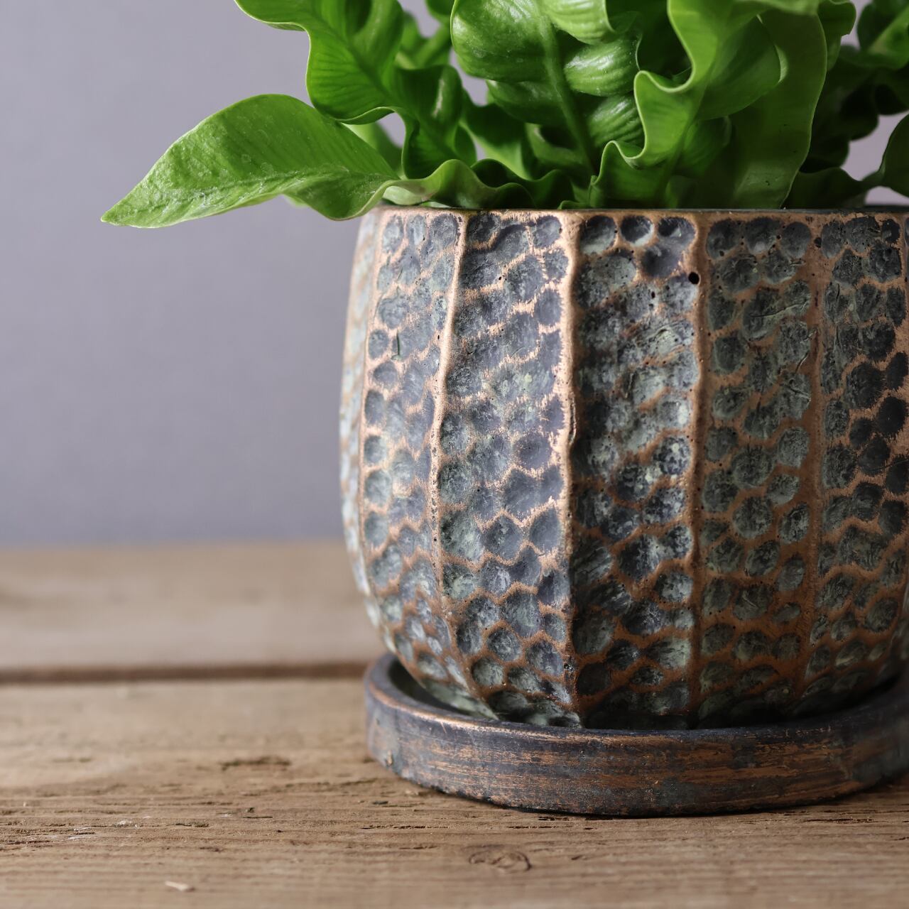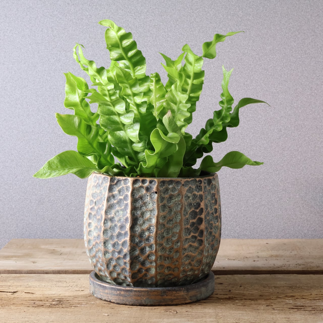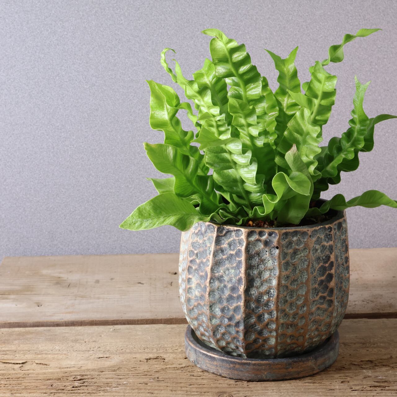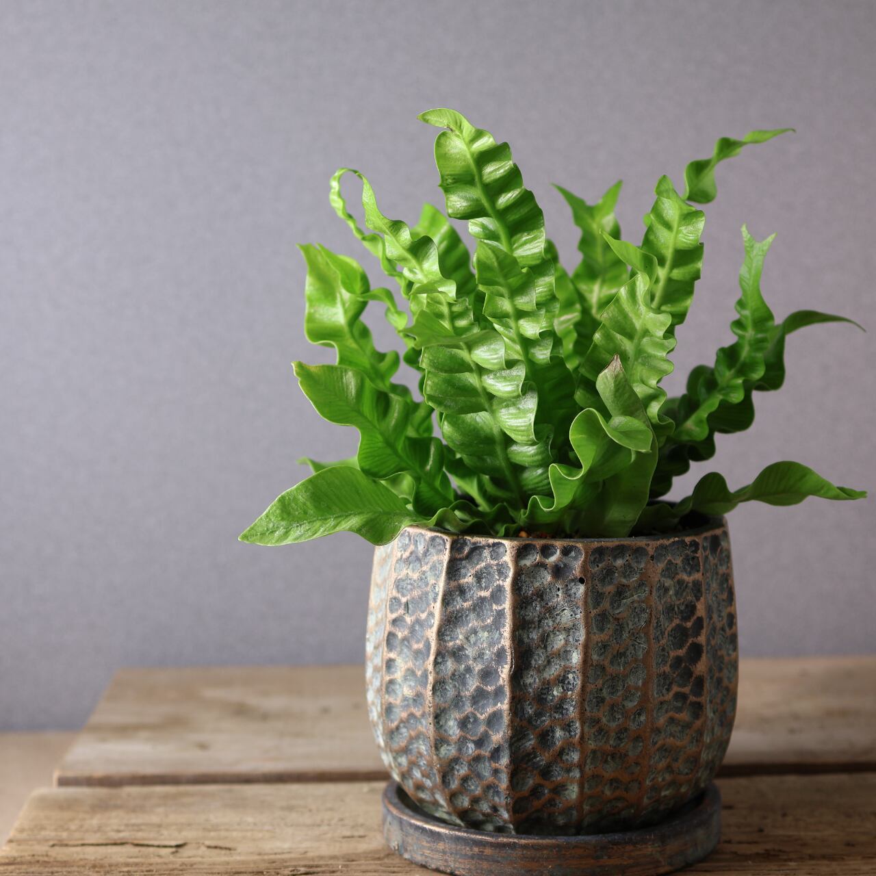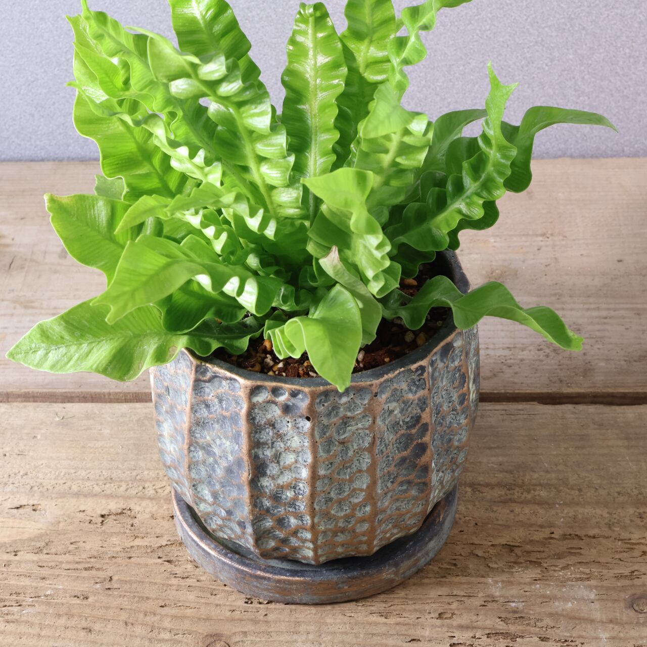 鮮やかなエメラルドグリーンの葉が波打つように広がる、人気のシダ植物。深い緑と艶やかな質感が魅力で、名前の通りまるで“緑の波”が流れるような姿を楽しめます。葉の中心から規則的に放射状に広がる姿はとても美しく、インテリアに取り入れるだけで空間がぐっと爽やかに。