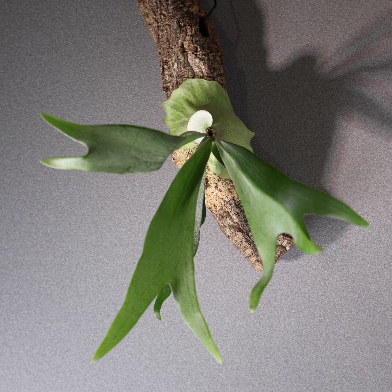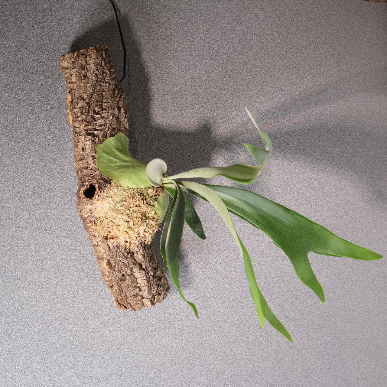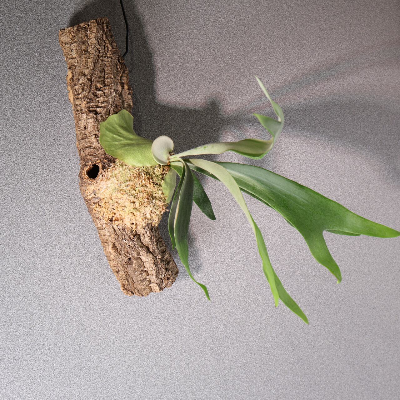 コルク付けにすることで、自然の樹上着生に近い姿を楽しめ、通気性がよく根張りも健やかに。壁面に飾ると存在感がありながらも落ち着いた雰囲気を演出してくれます。インテリアグリーンとしてはもちろん、植物好きにも人気の高い上級品種です。