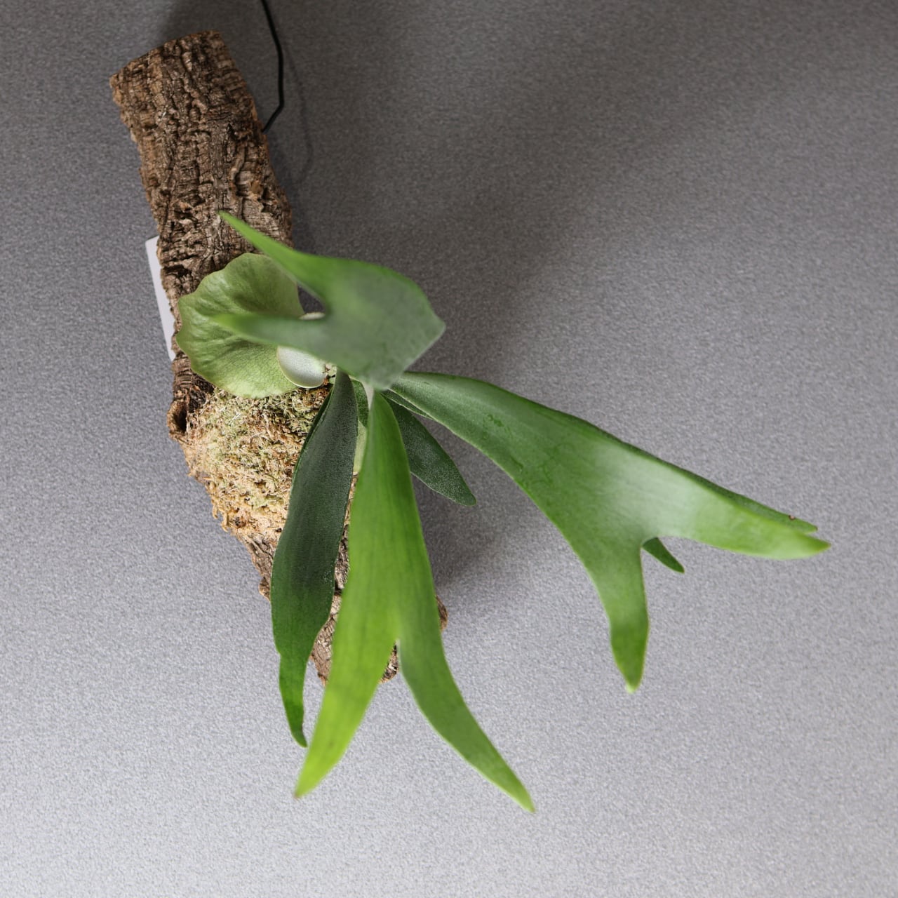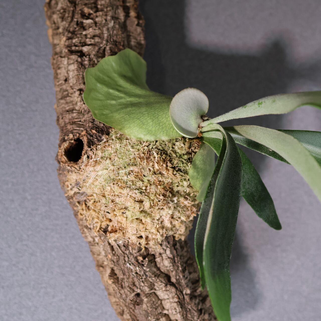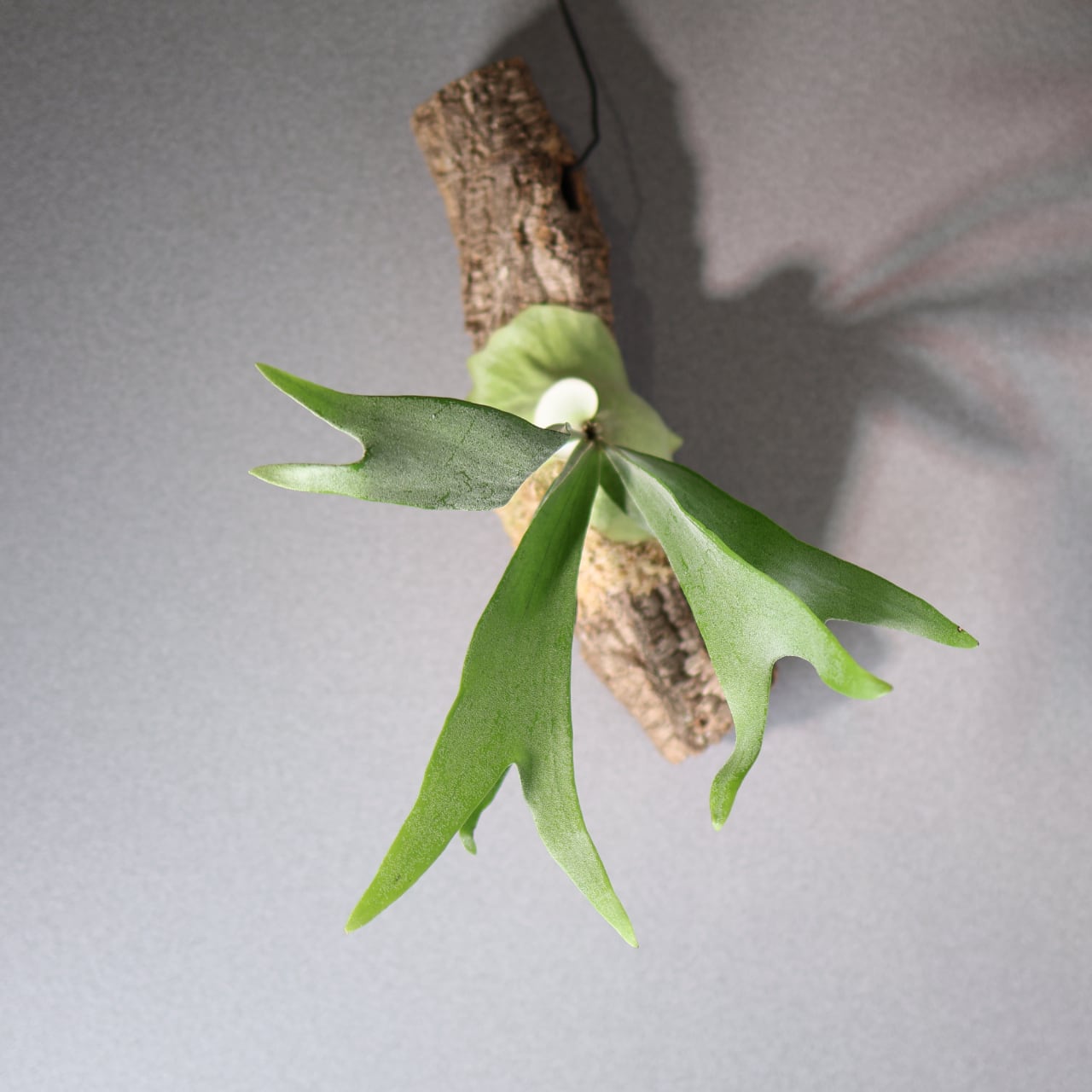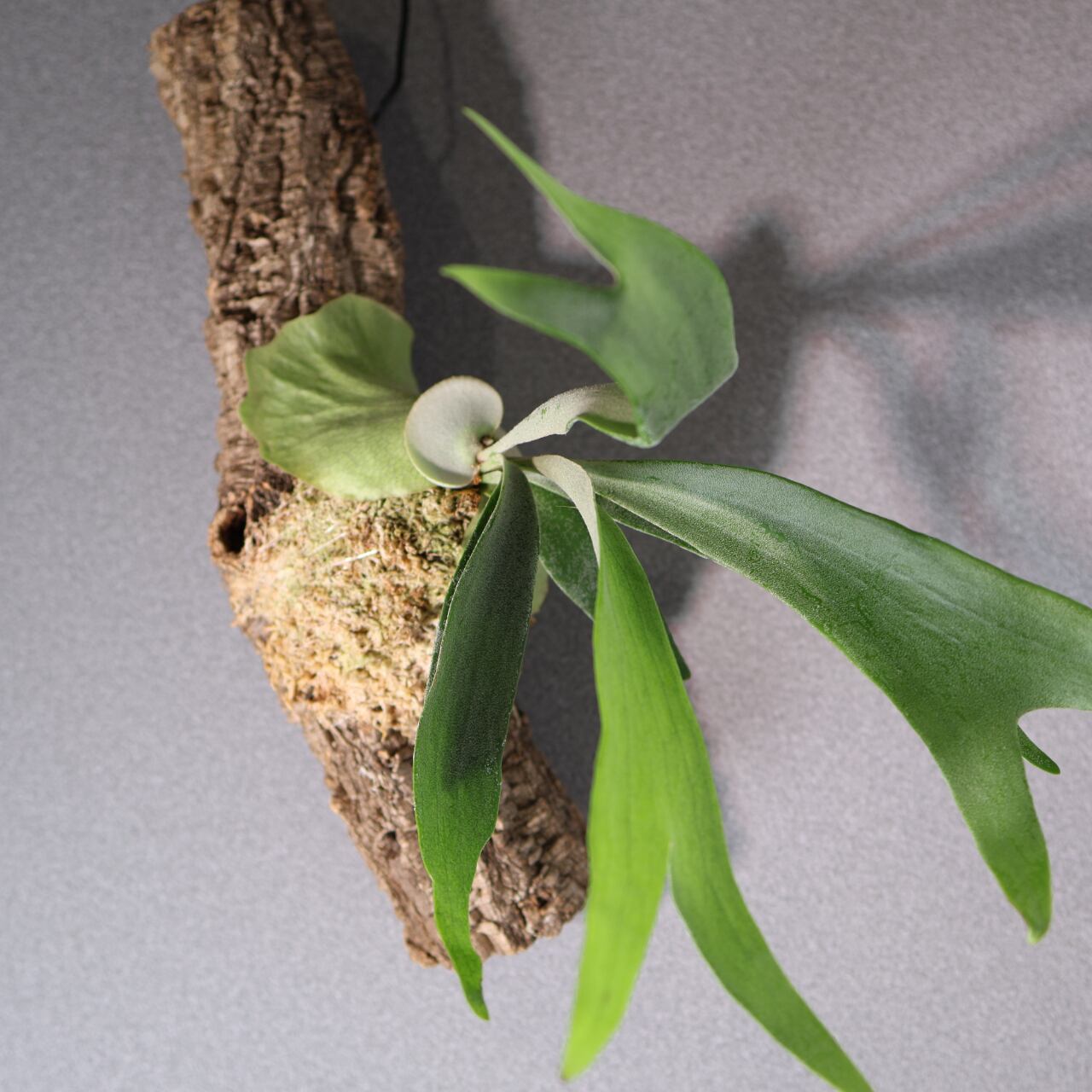 コルク付けにすることで、自然の樹上着生に近い姿を楽しめ、通気性がよく根張りも健やかに。壁面に飾ると存在感がありながらも落ち着いた雰囲気を演出してくれます。インテリアグリーンとしてはもちろん、植物好きにも人気の高い上級品種です。