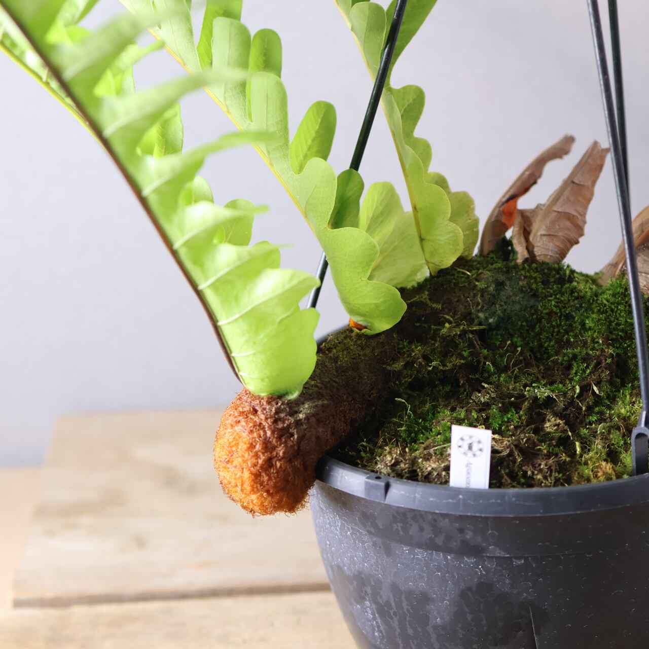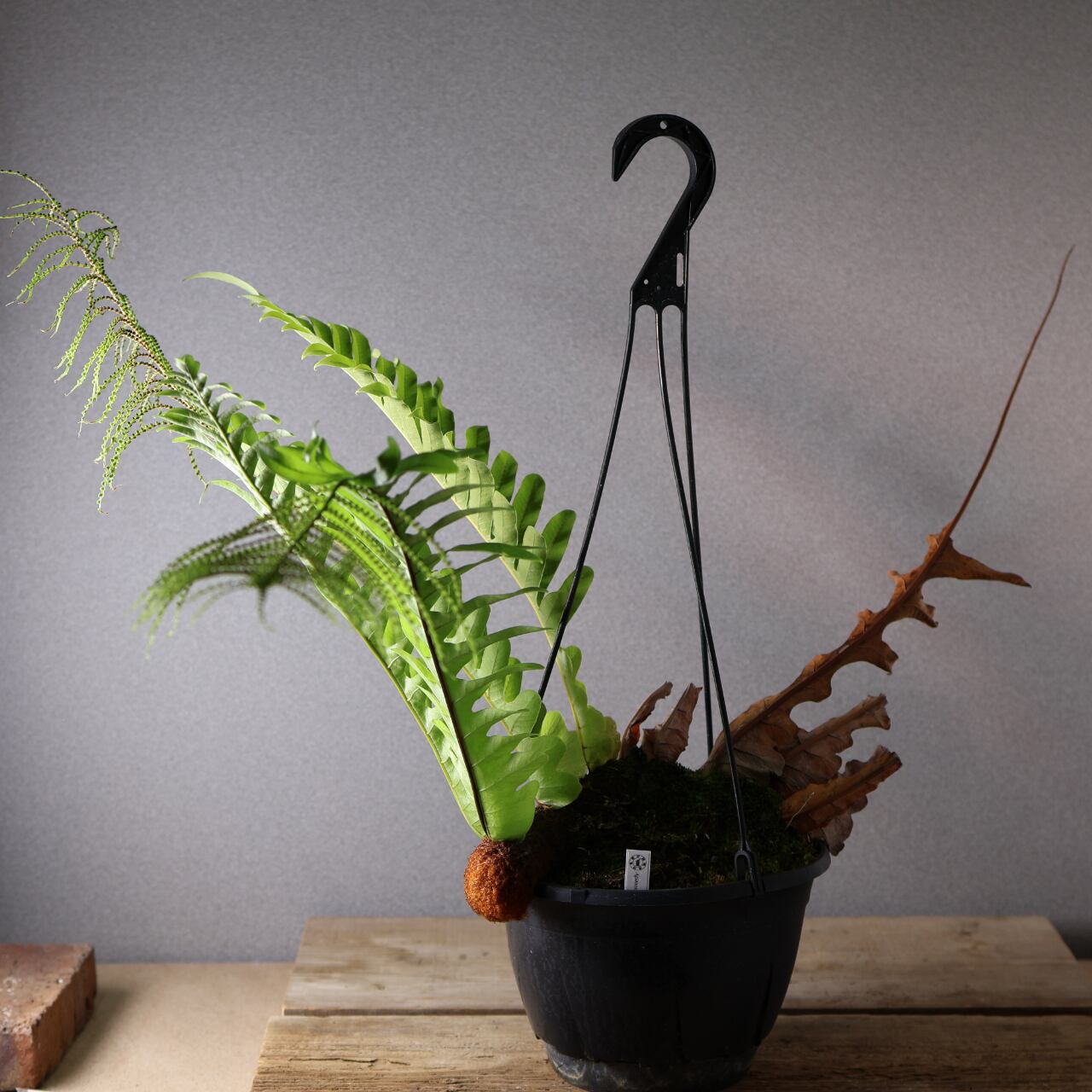 まるで苔むした樹上の森の一部を切り取ったような佇まいで、ハンギングがよく映えます。