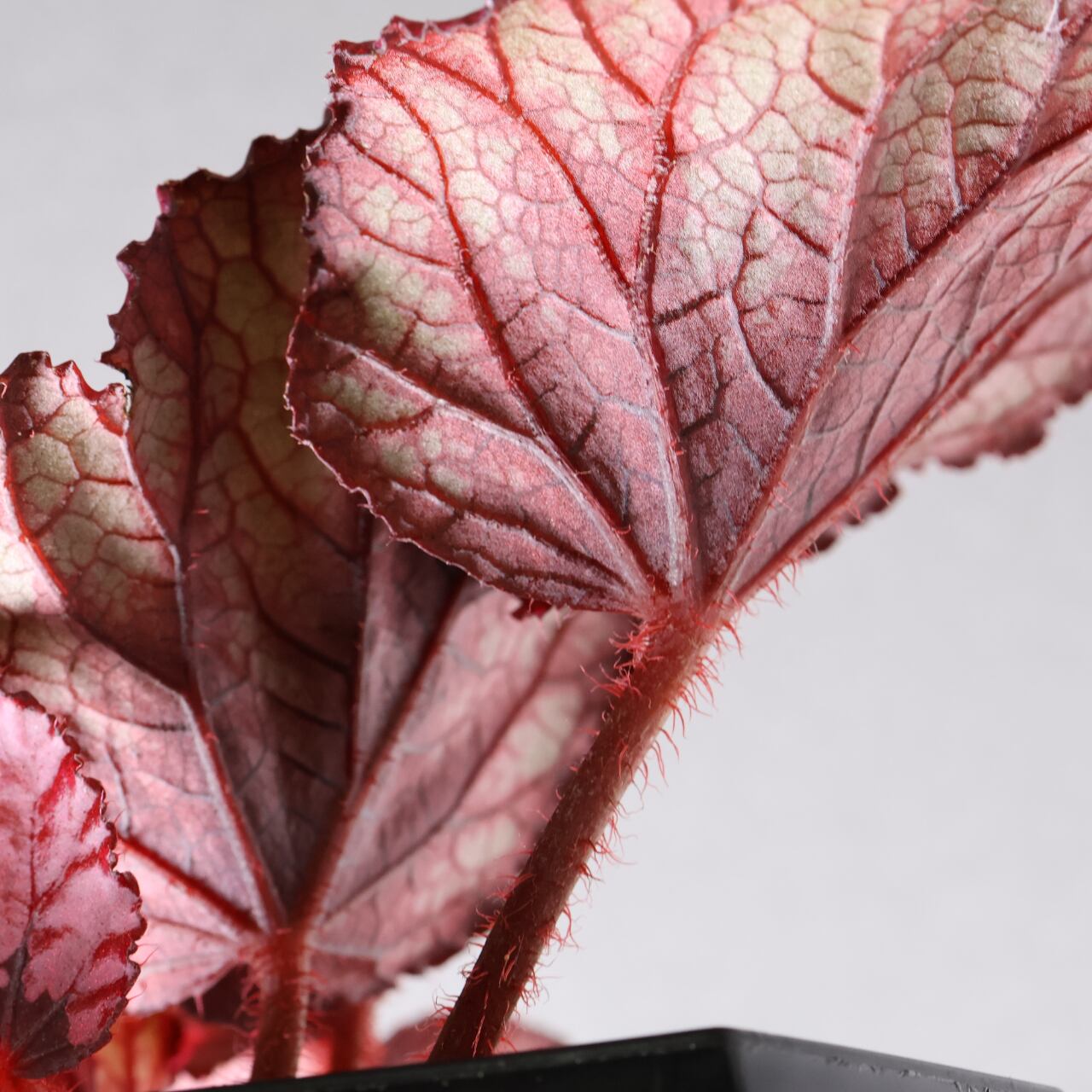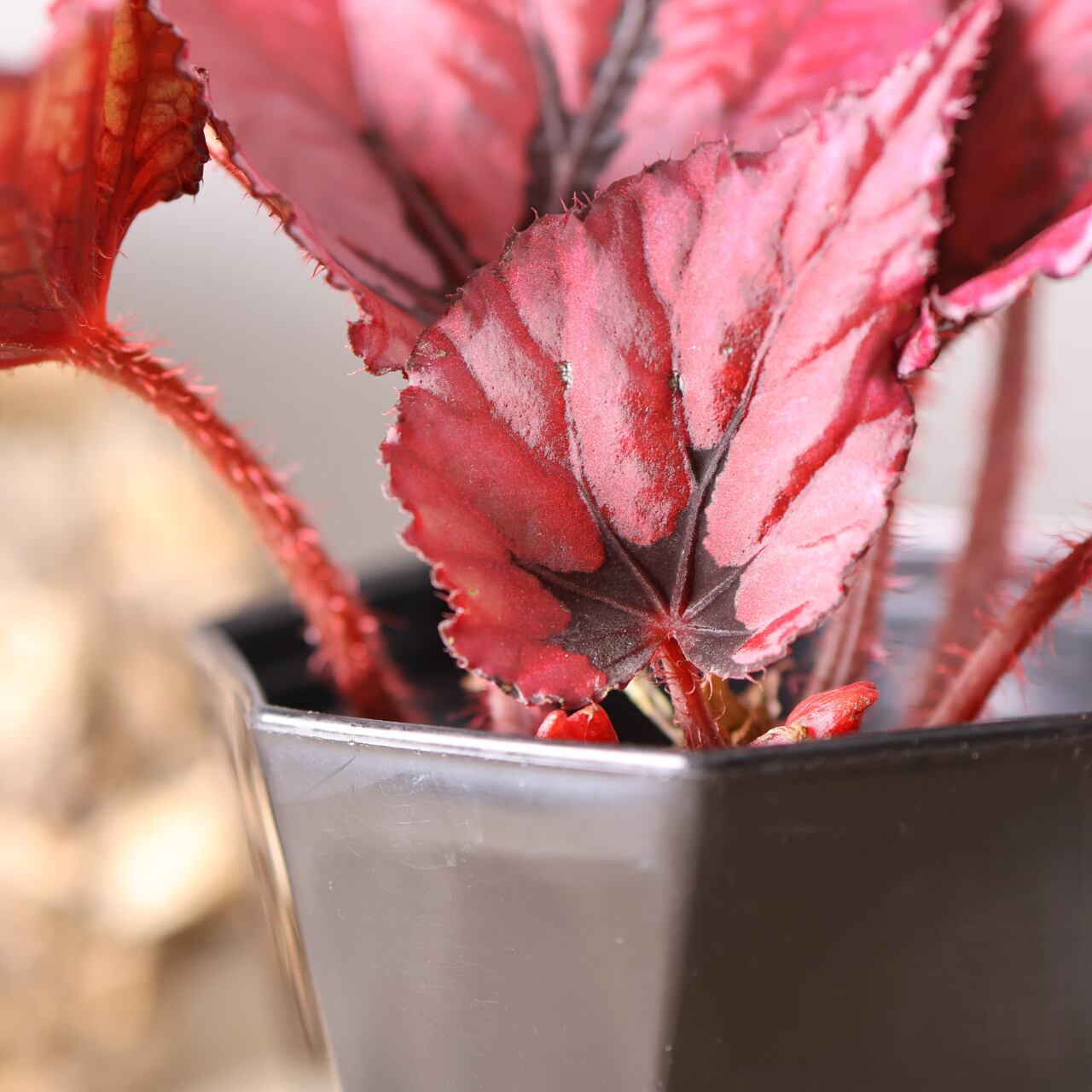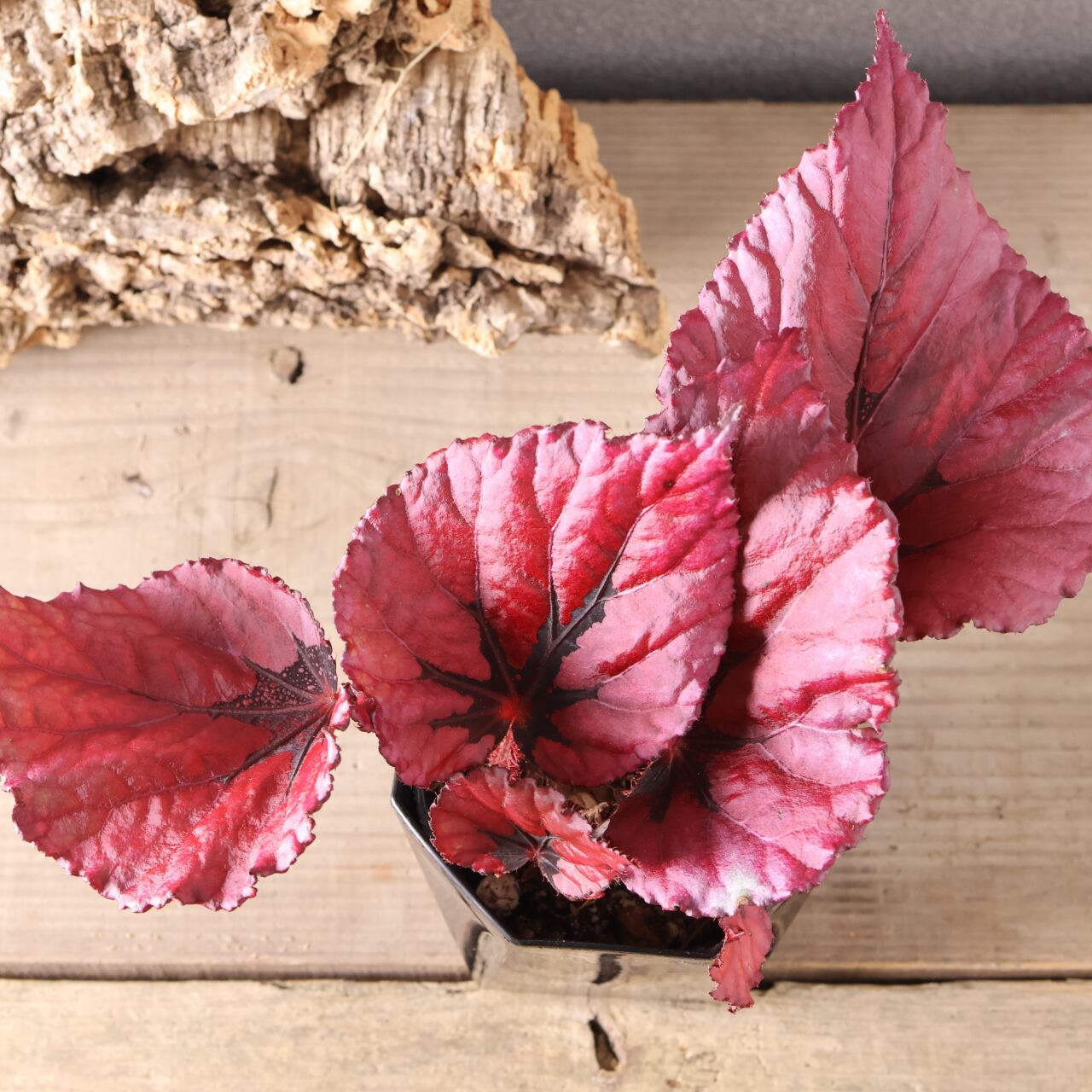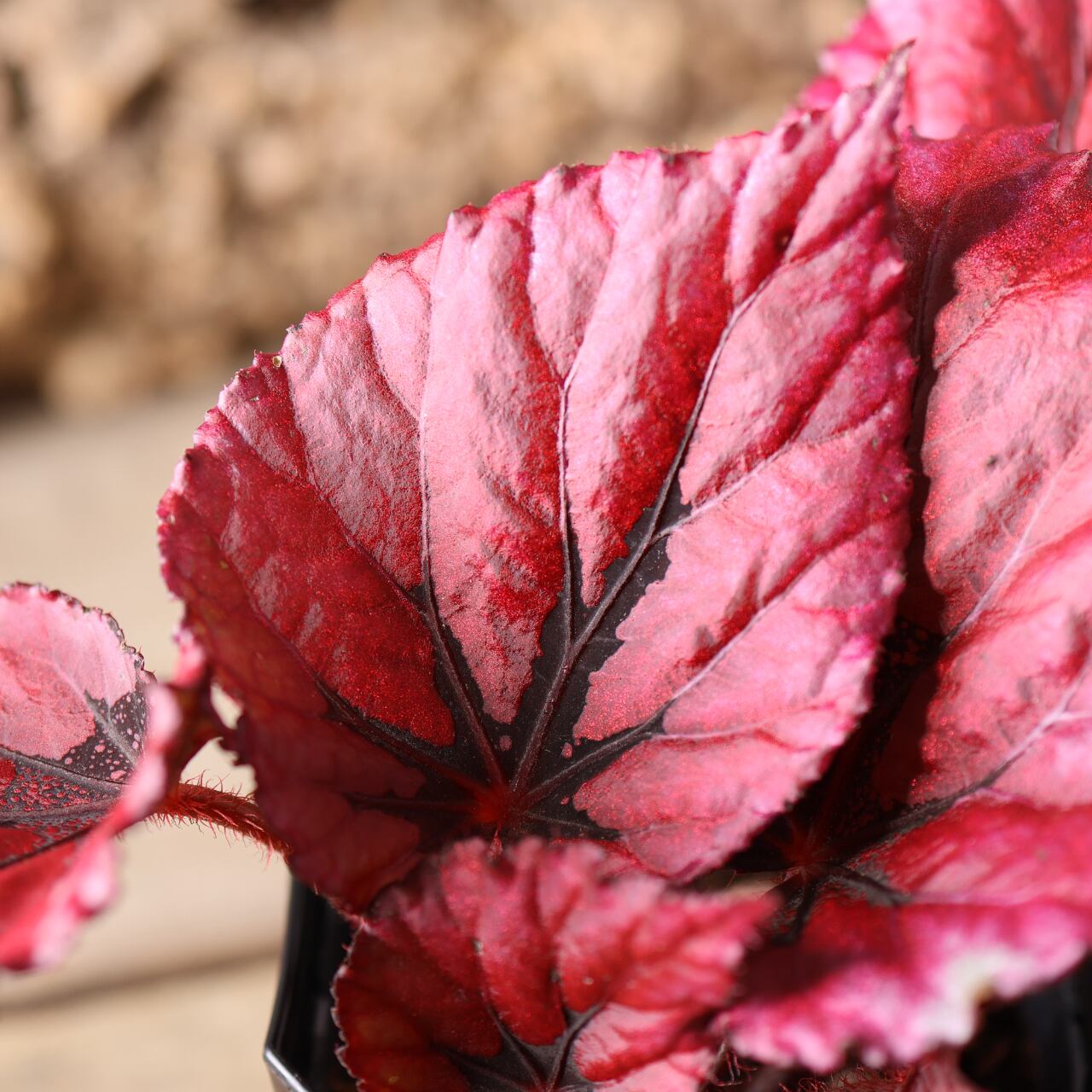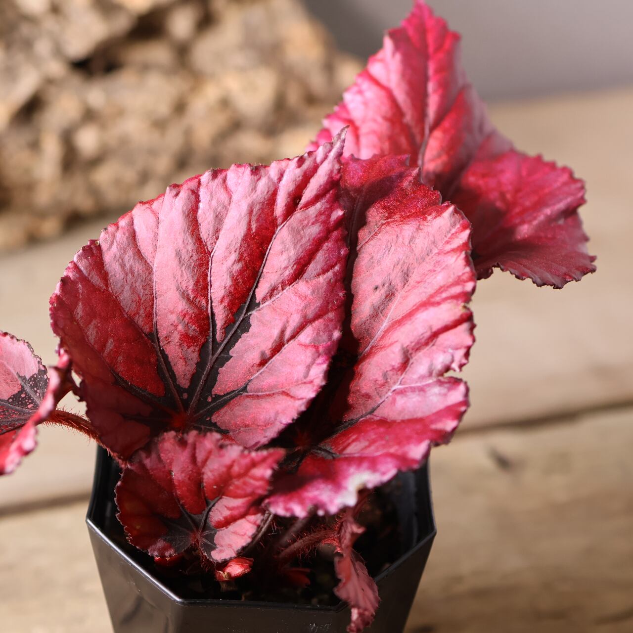 鮮やかな色彩と独特の葉模様が魅力の観葉ベゴニア。葉は光沢があり、赤・紫・緑・銀など多彩な色彩を帯び、品種ごとに個性的な模様が楽しめます。葉の形も波打つものや切れ込みのあるものなどバリエーション豊富で、まるで自然が描いたアートのよう。