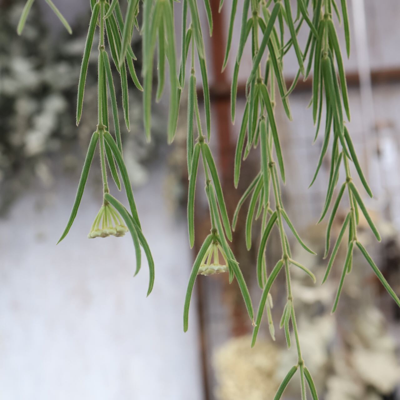 細く糸のように垂れ下がる姿が美しいホヤの仲間。ふんわりとした柔らかな印象で、吊り鉢にすると優雅なグリーンカーテンのように楽しめます。肉厚の細長い葉をもち、淡い香りの白い花を咲かせます。