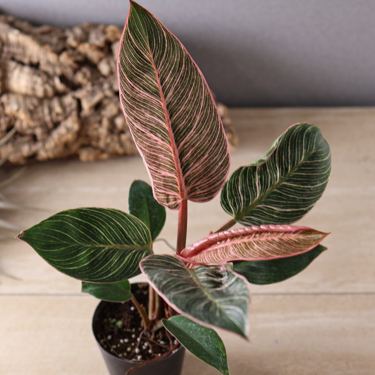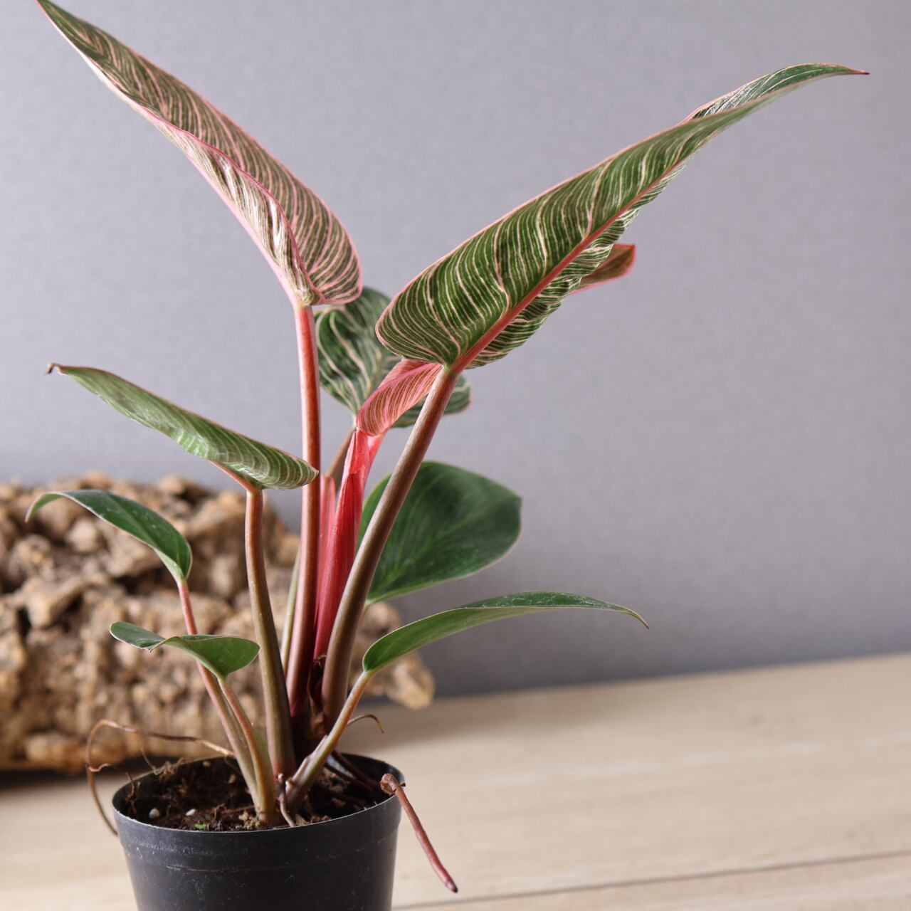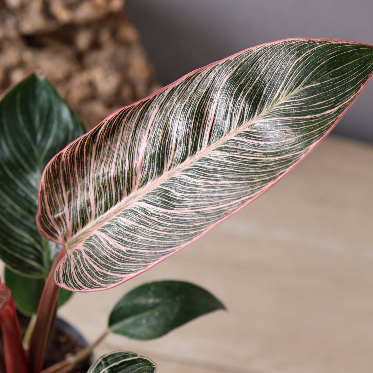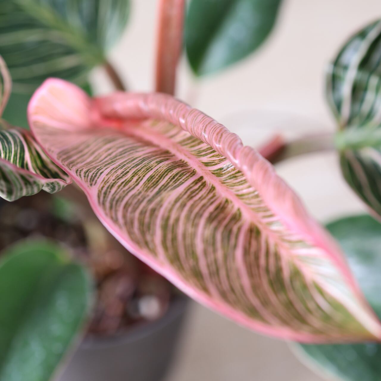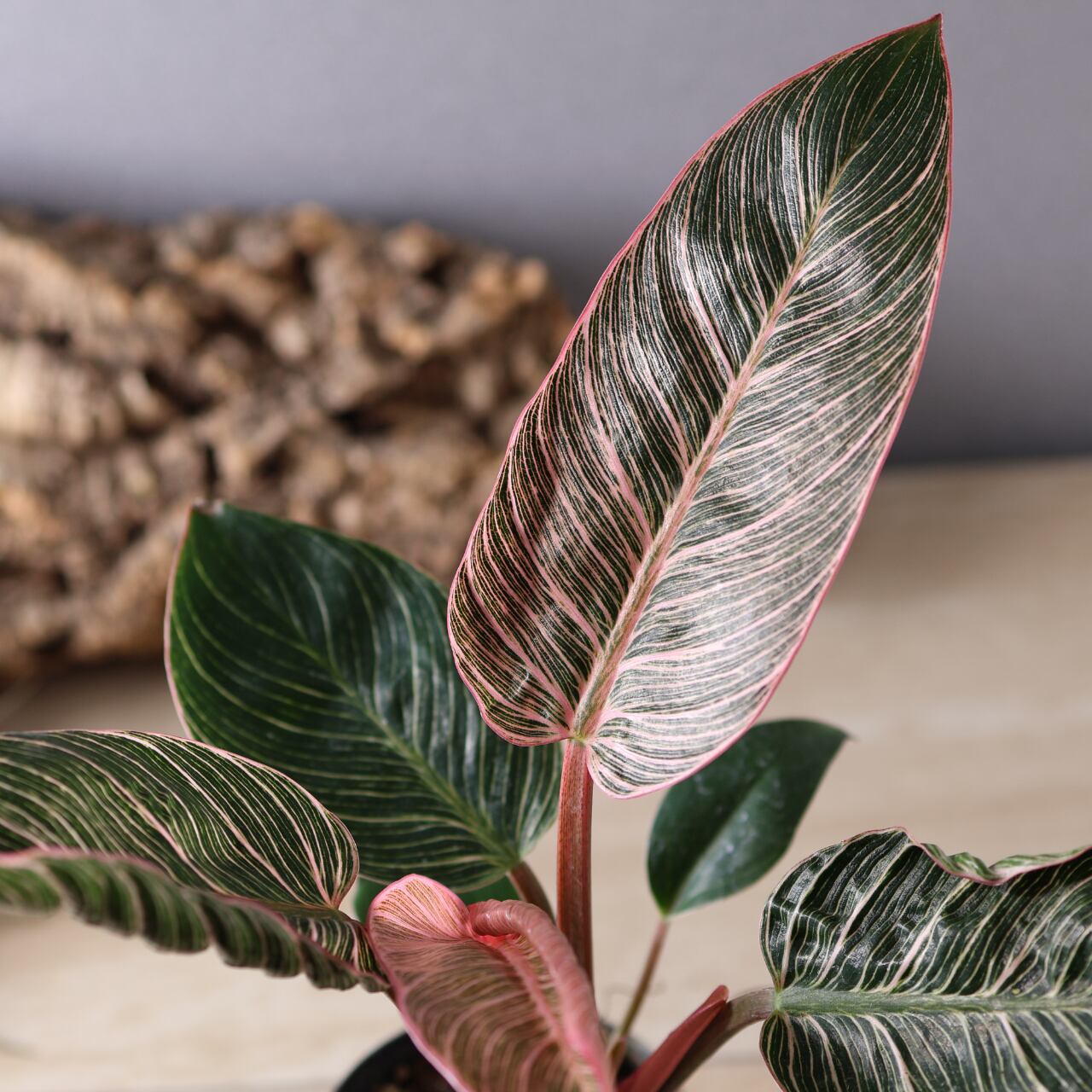 フィロデンドロン・バーキンの中でも特に華やかな、ピンク色の斑が入る珍しい品種。葉のストライプ模様にやわらかなピンクやクリーム色が重なり、まるでアートのような美しさです。光の加減や生長段階によって模様の出方が変化し、1枚ごとに違う表情を見せてくれます。