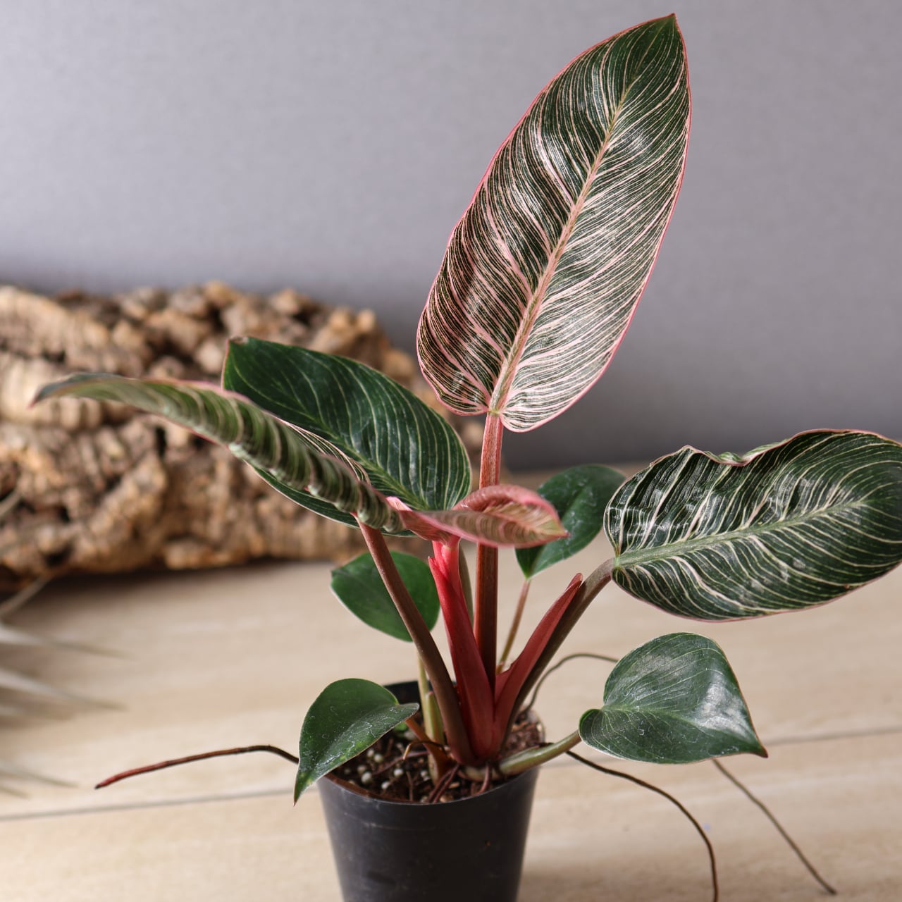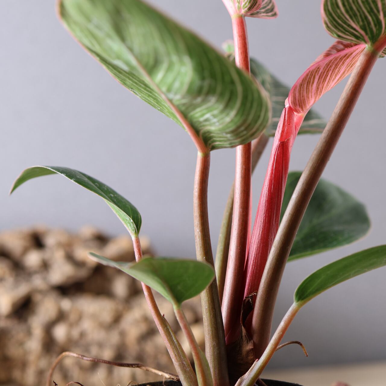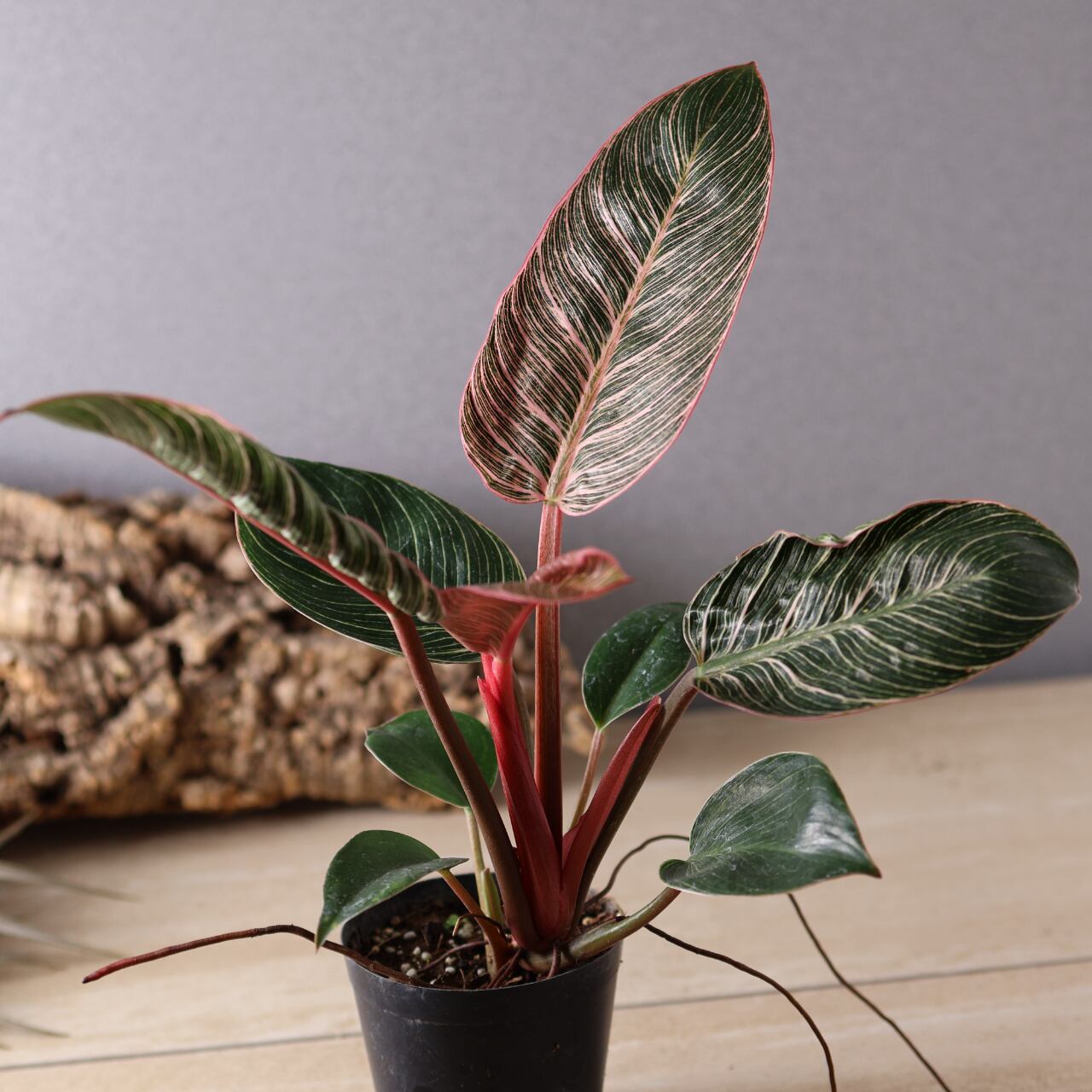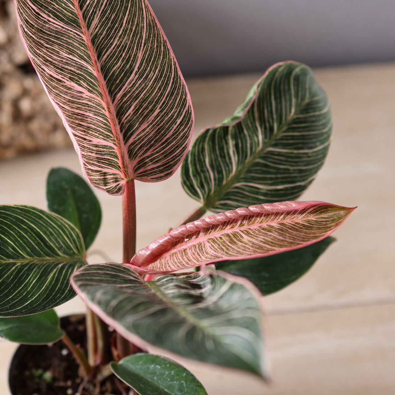 フィロデンドロン・バーキンの中でも特に華やかな、ピンク色の斑が入る珍しい品種。葉のストライプ模様にやわらかなピンクやクリーム色が重なり、まるでアートのような美しさです。光の加減や生長段階によって模様の出方が変化し、1枚ごとに違う表情を見せてくれます。