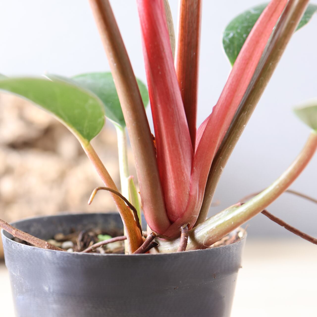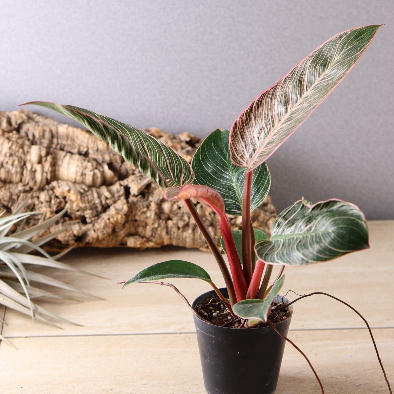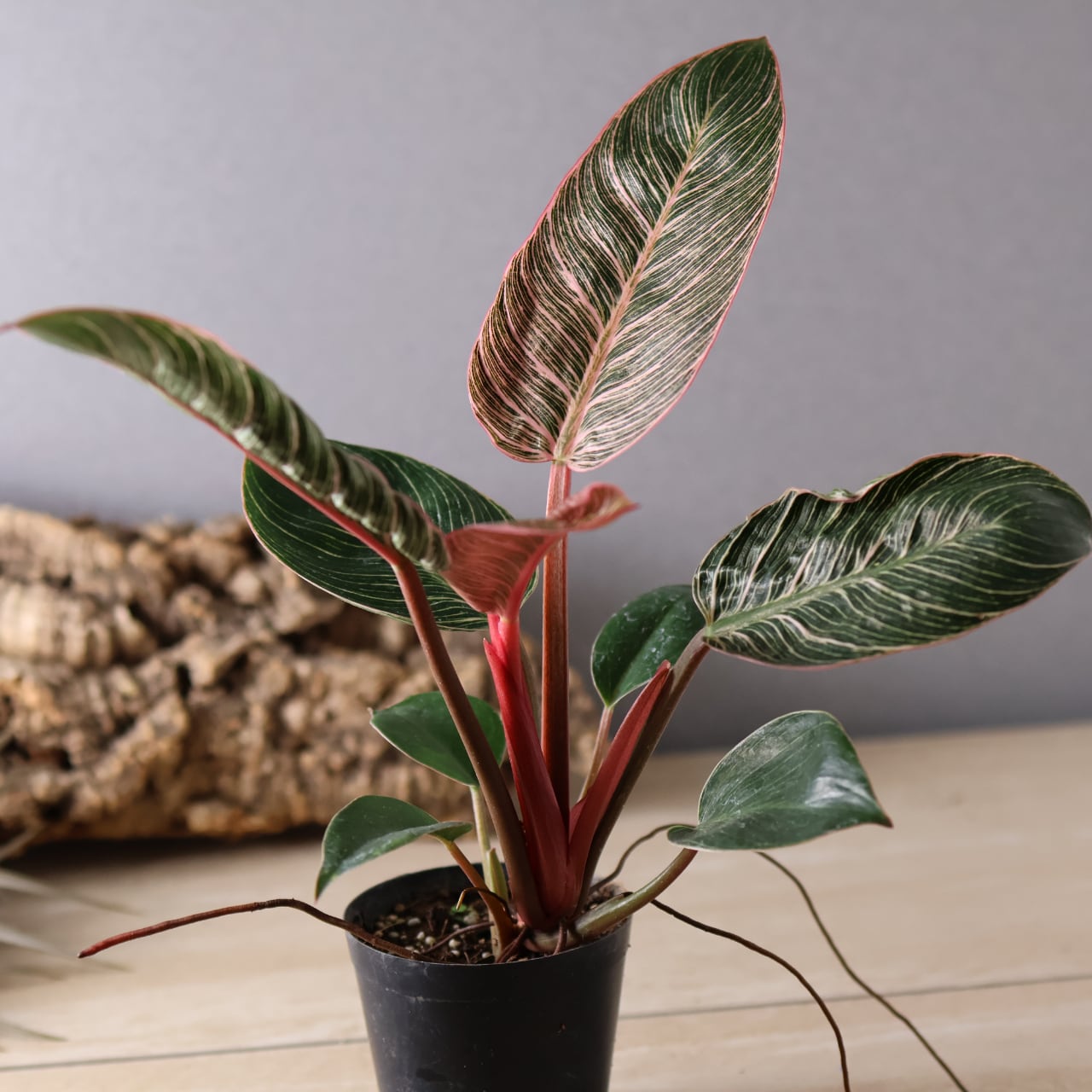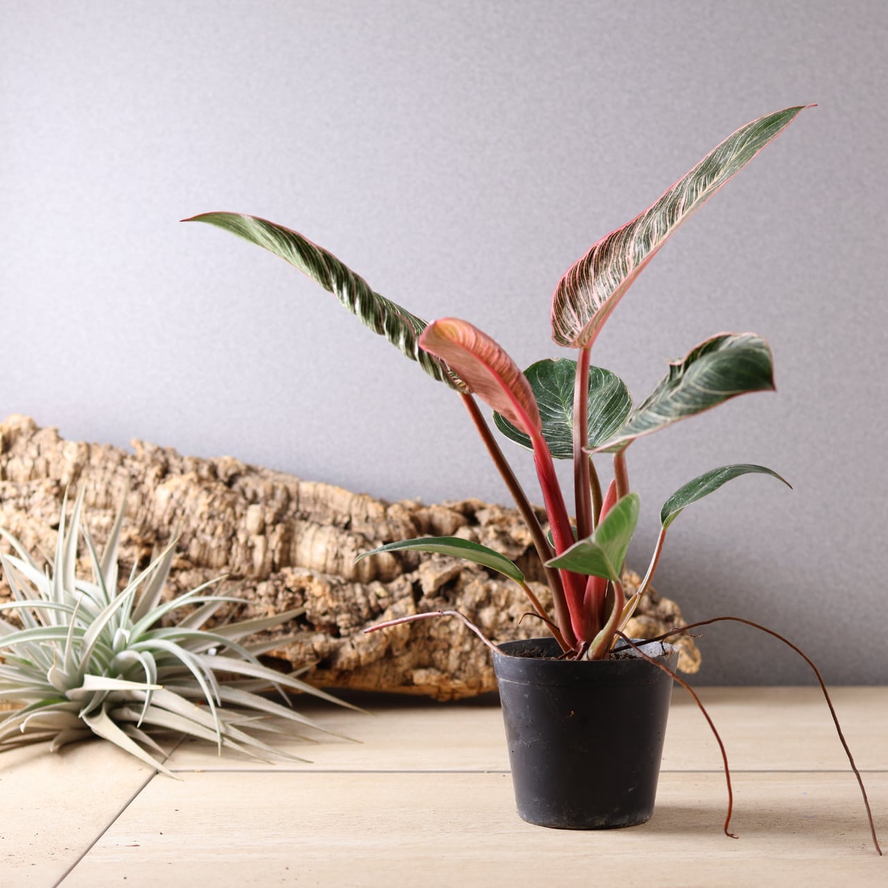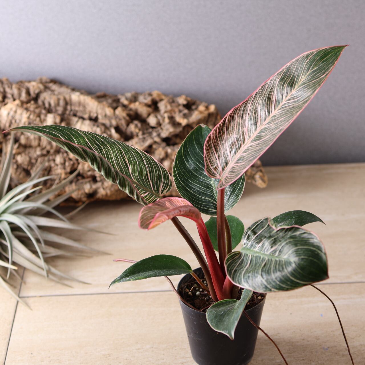 フィロデンドロン・バーキンの中でも特に華やかな、ピンク色の斑が入る珍しい品種。葉のストライプ模様にやわらかなピンクやクリーム色が重なり、まるでアートのような美しさです。光の加減や生長段階によって模様の出方が変化し、1枚ごとに違う表情を見せてくれます。