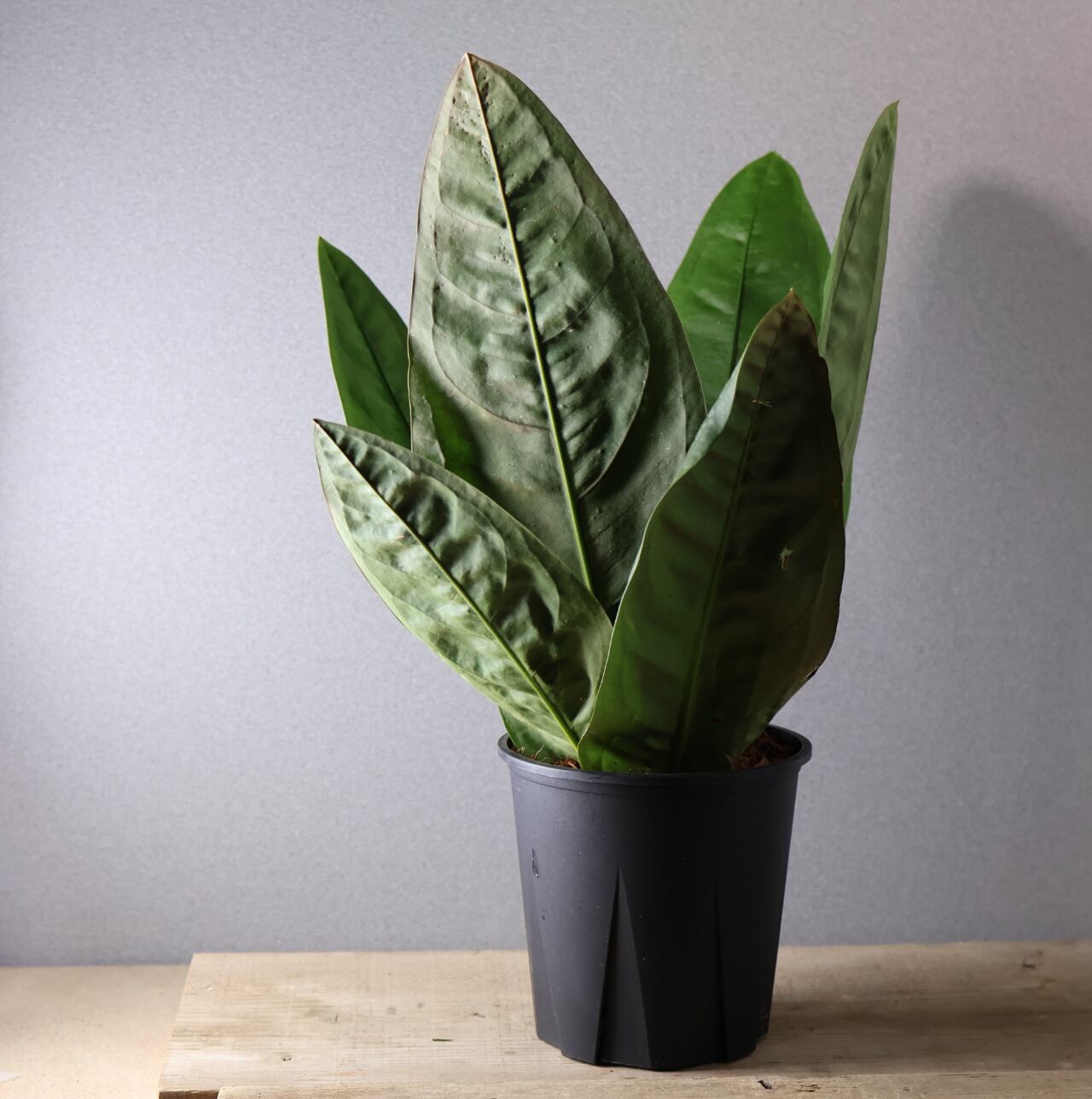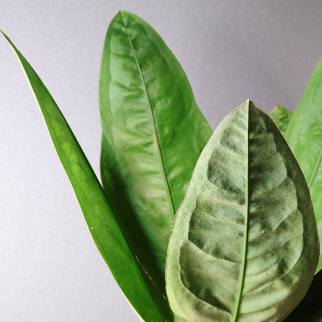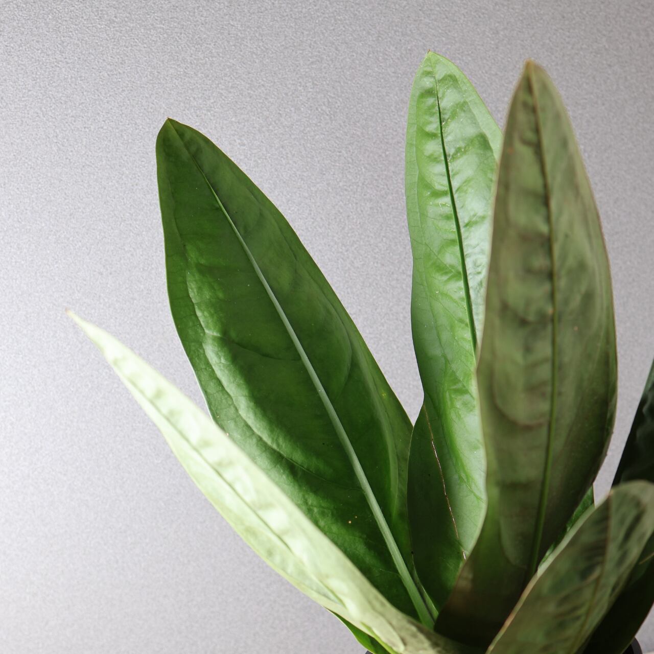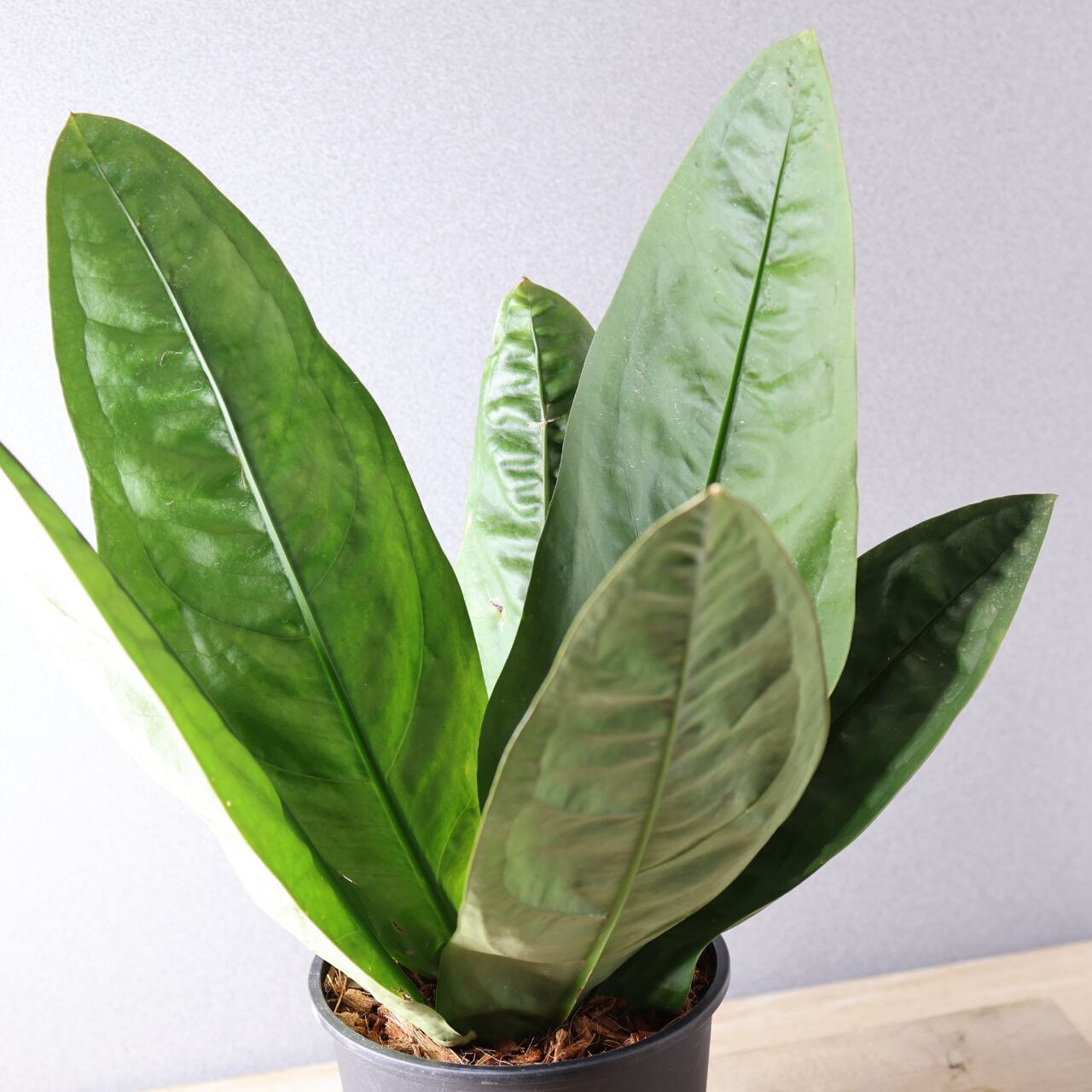 ビロードのような深緑の葉が放射状に広がる、存在感抜群のアンスリウム。
