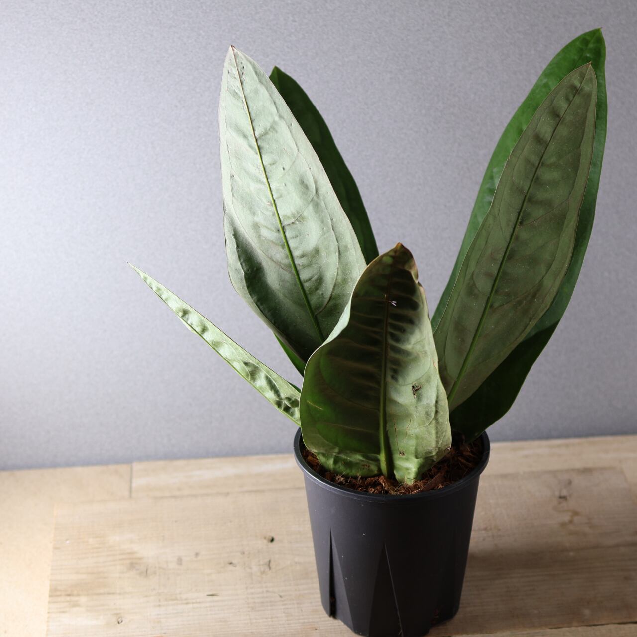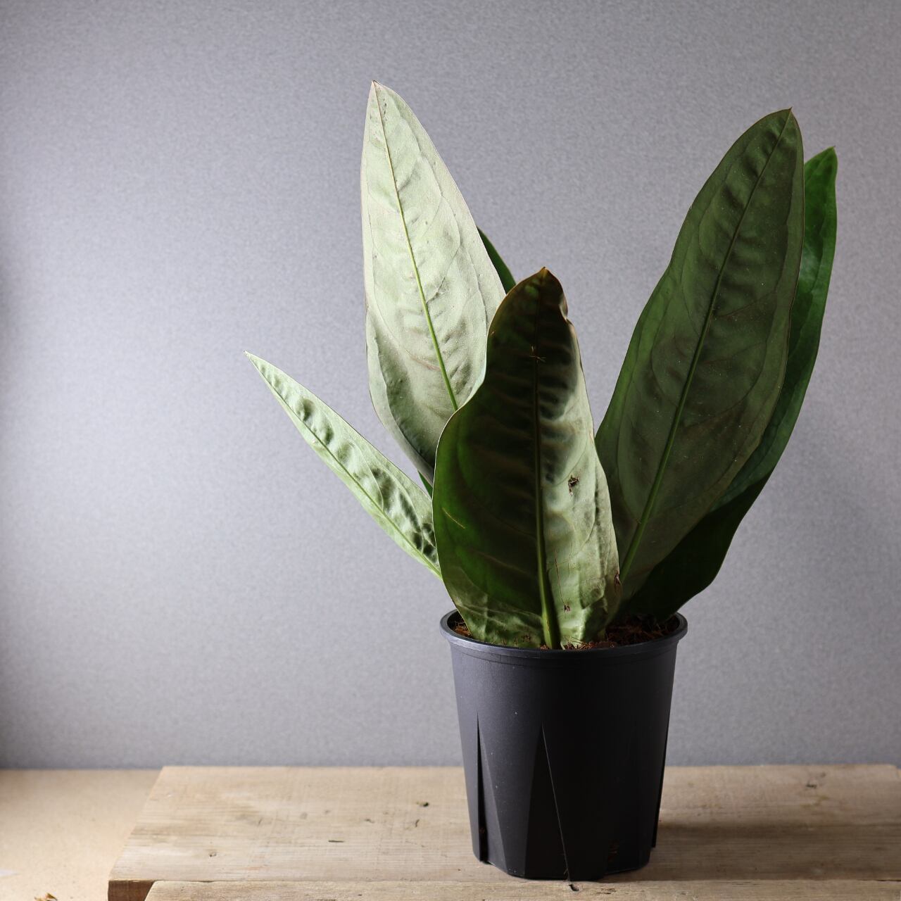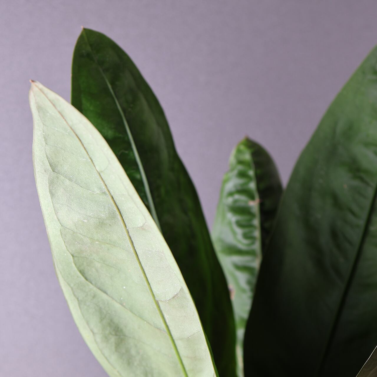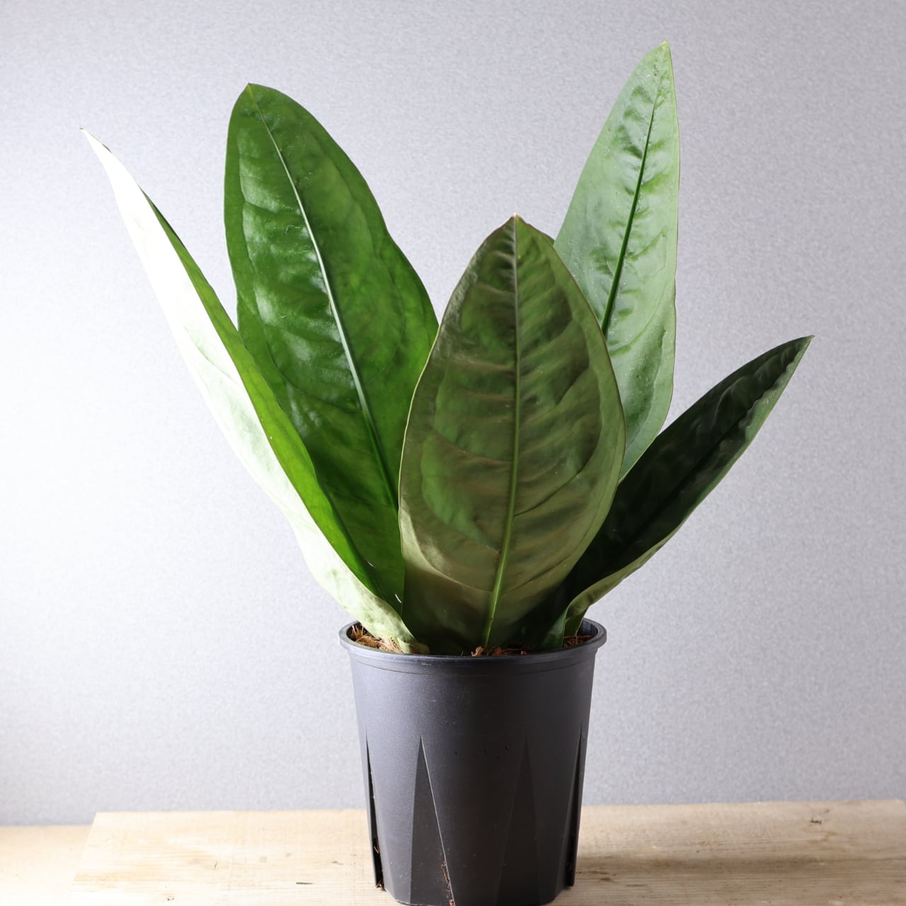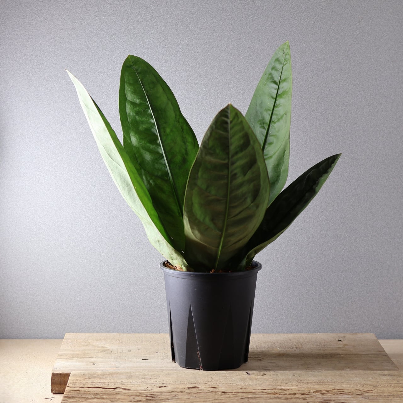 ビロードのような深緑の葉が放射状に広がる、存在感抜群のアンスリウム。