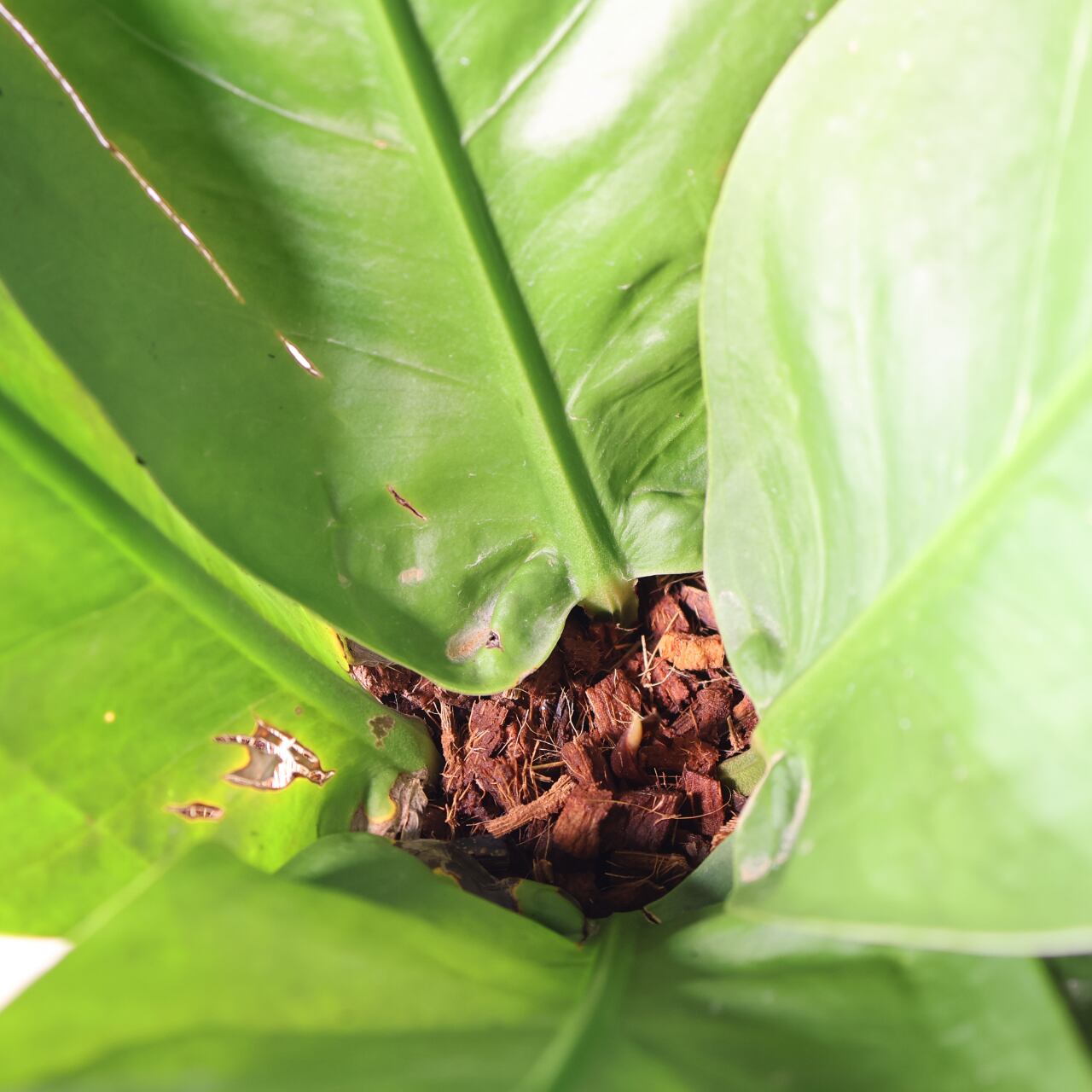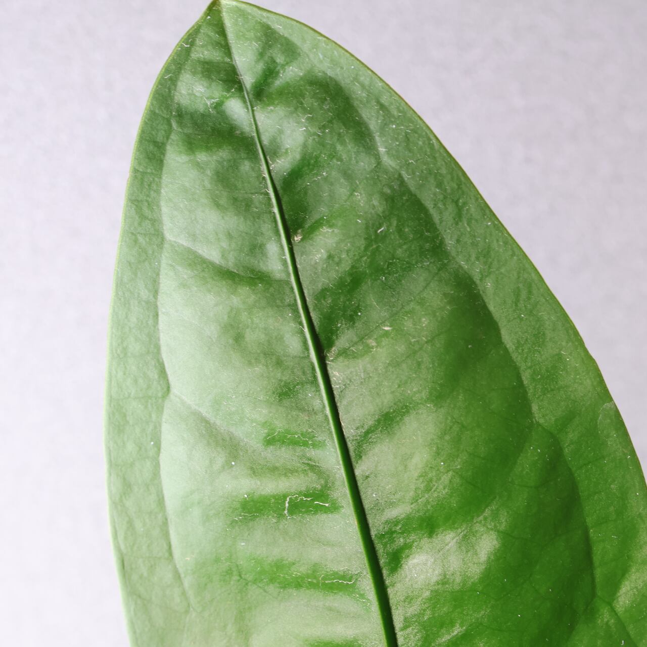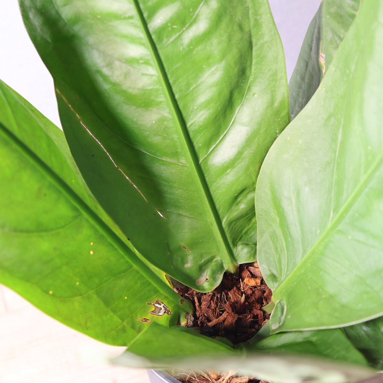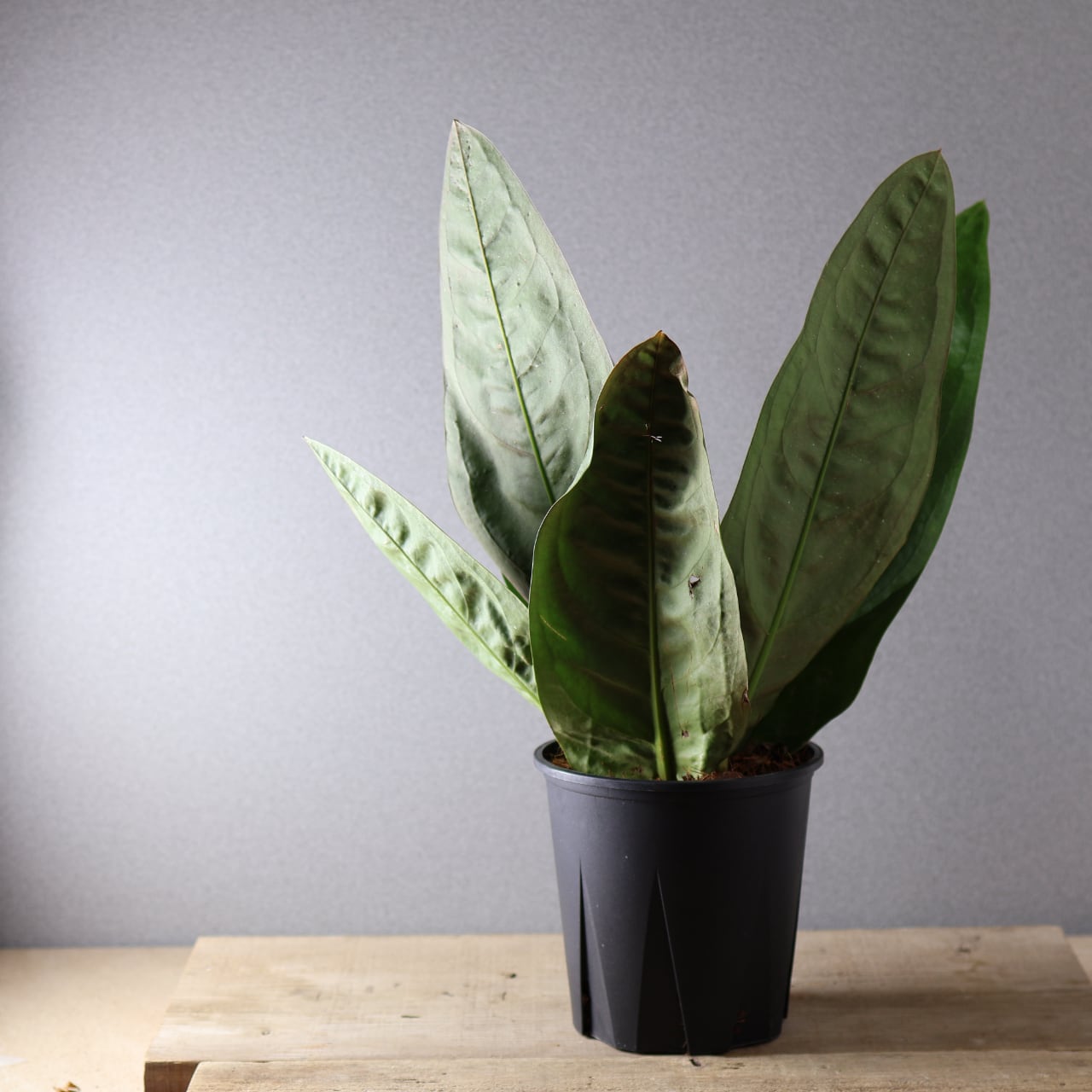 ビロードのような深緑の葉が放射状に広がる、存在感抜群のアンスリウム。