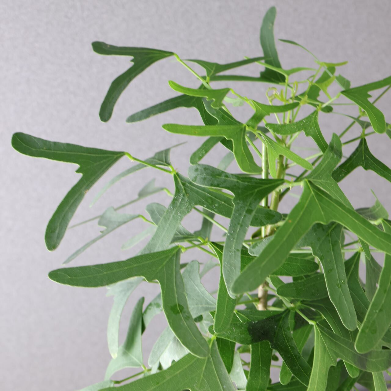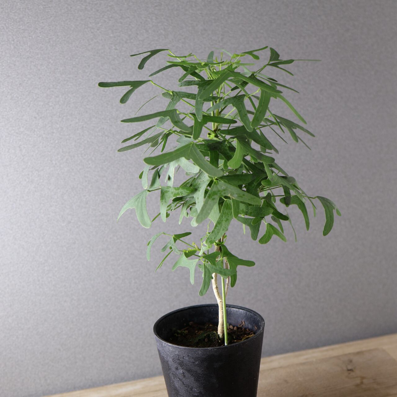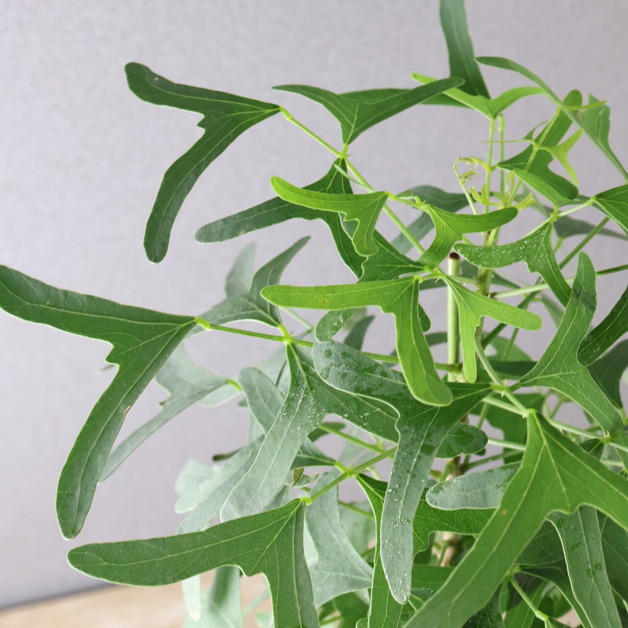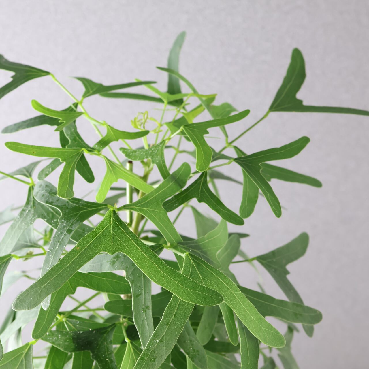蝶が舞うような形の葉と、美しいグリーンのコントラストが印象的な熱帯性植物。ハート形にも見える三枚葉のバランスが軽やかで、風にそよぐ姿はまるで羽ばたく蝶のようです。