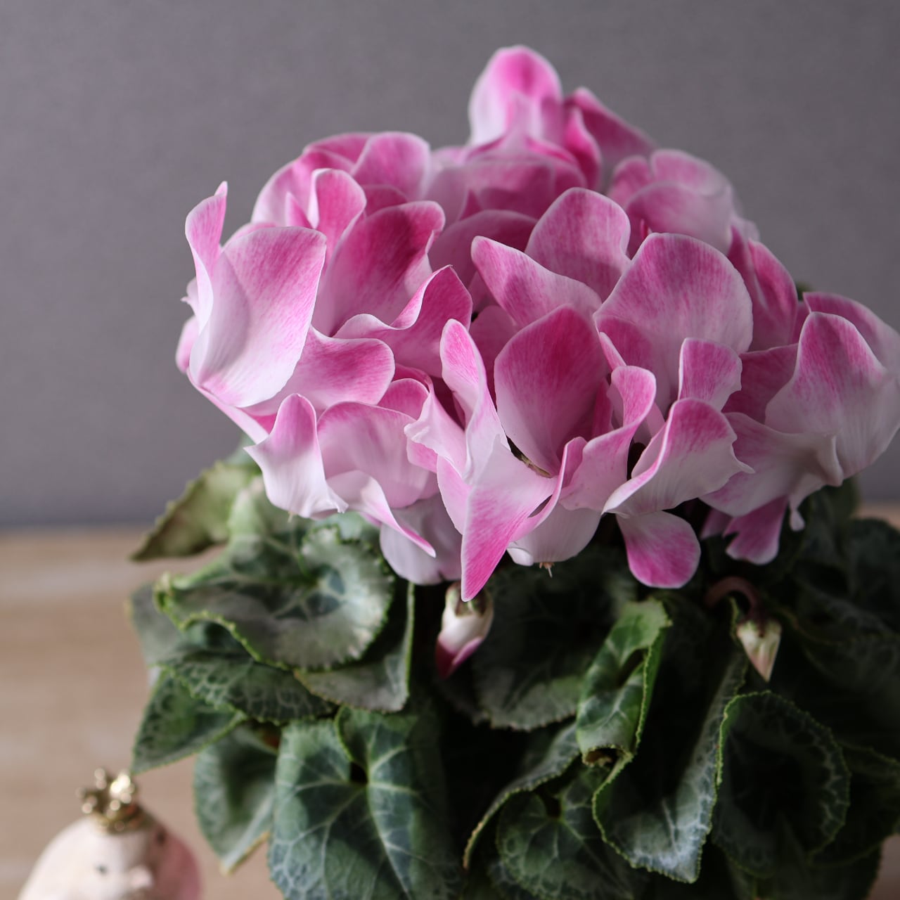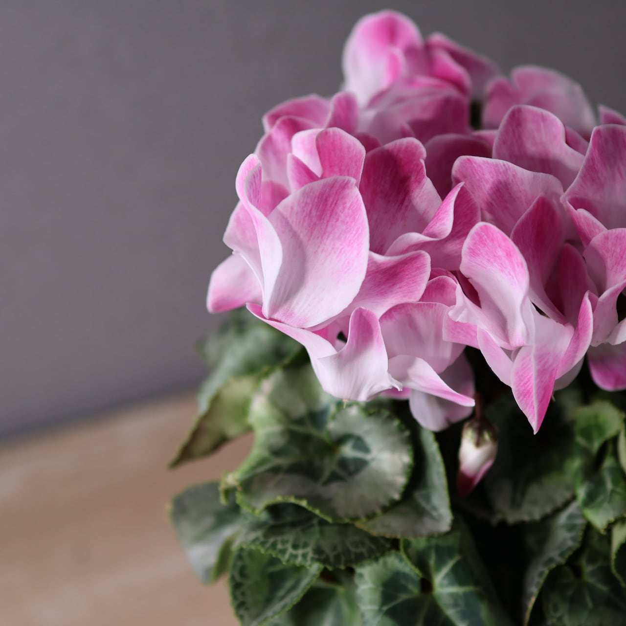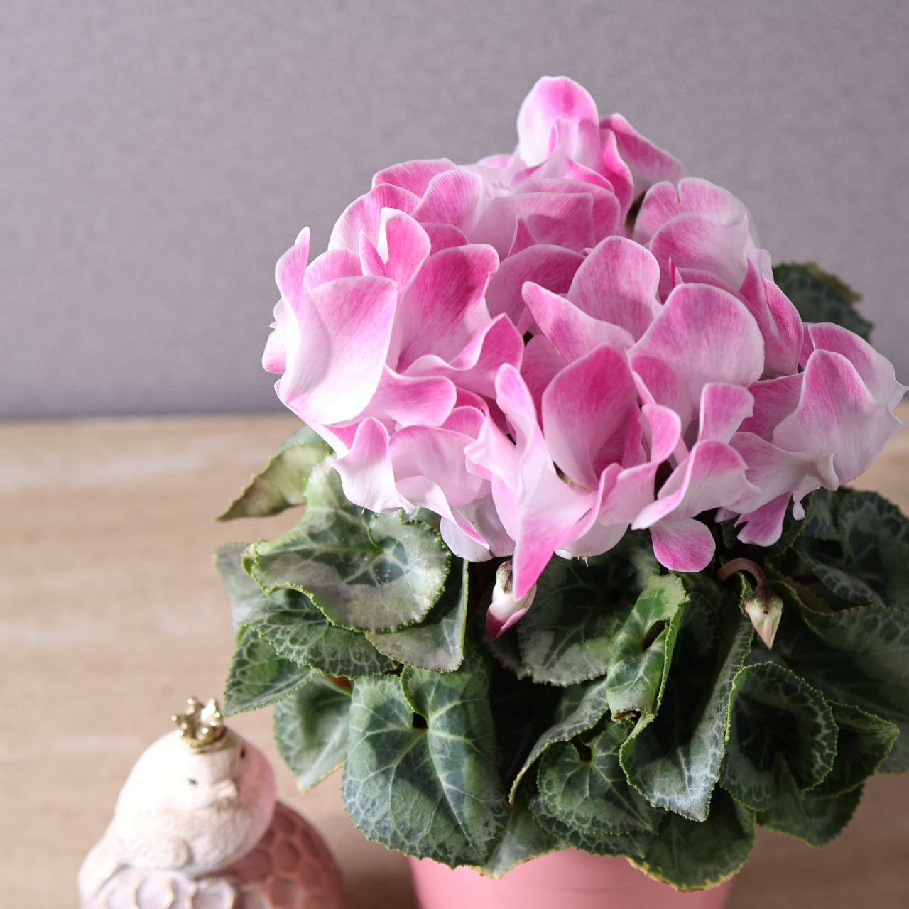 ひらひらと波打つ花びらが美しく広がる、華やかな印象のシクラメン「ファンフレーム ピンク」。