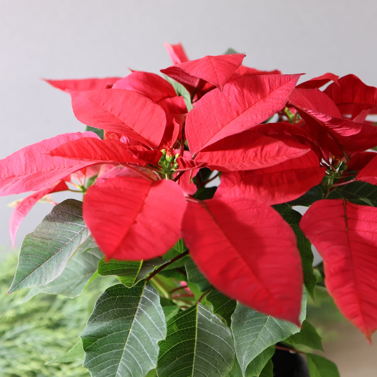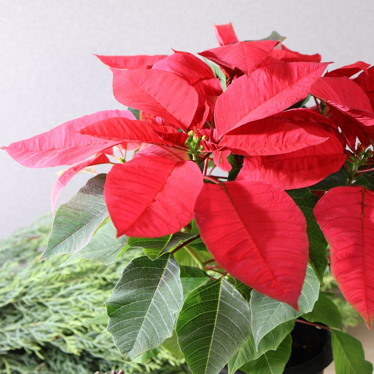 真っ赤な苞(ほう)が星のように広がり、クリスマスの装飾や贈り物として世界中で親しまれています。
