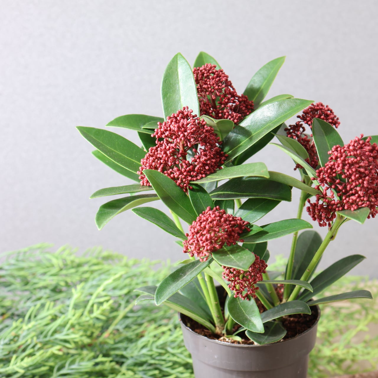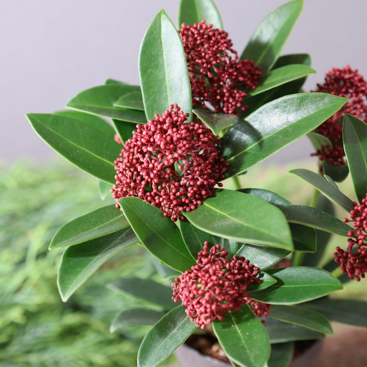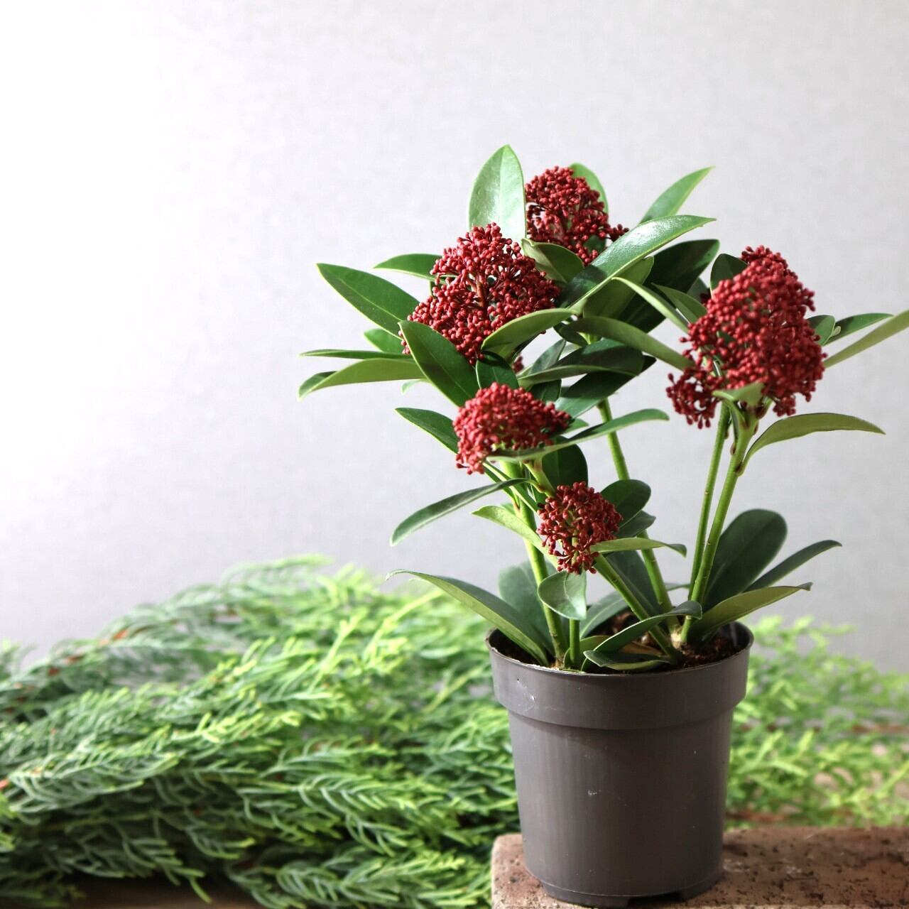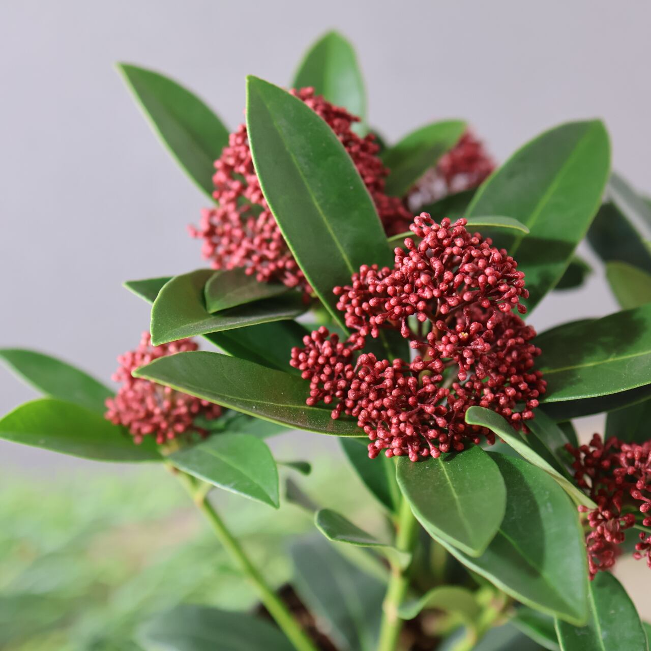 艶やかな緑葉に、ぎゅっと詰まった赤い蕾が愛らしいコンパクト品種「スキミア・レッドドワーフ」。