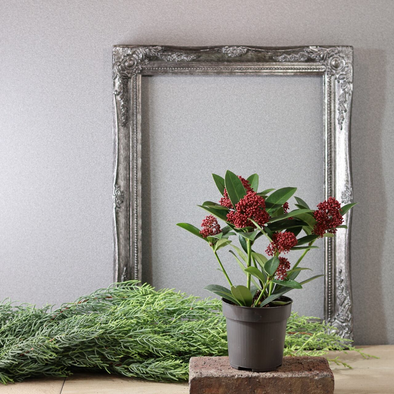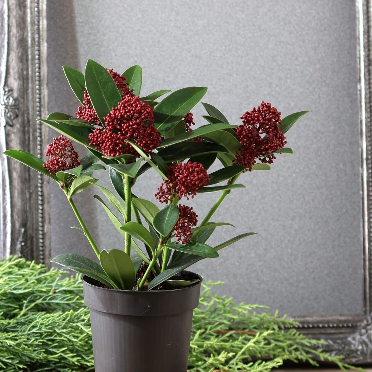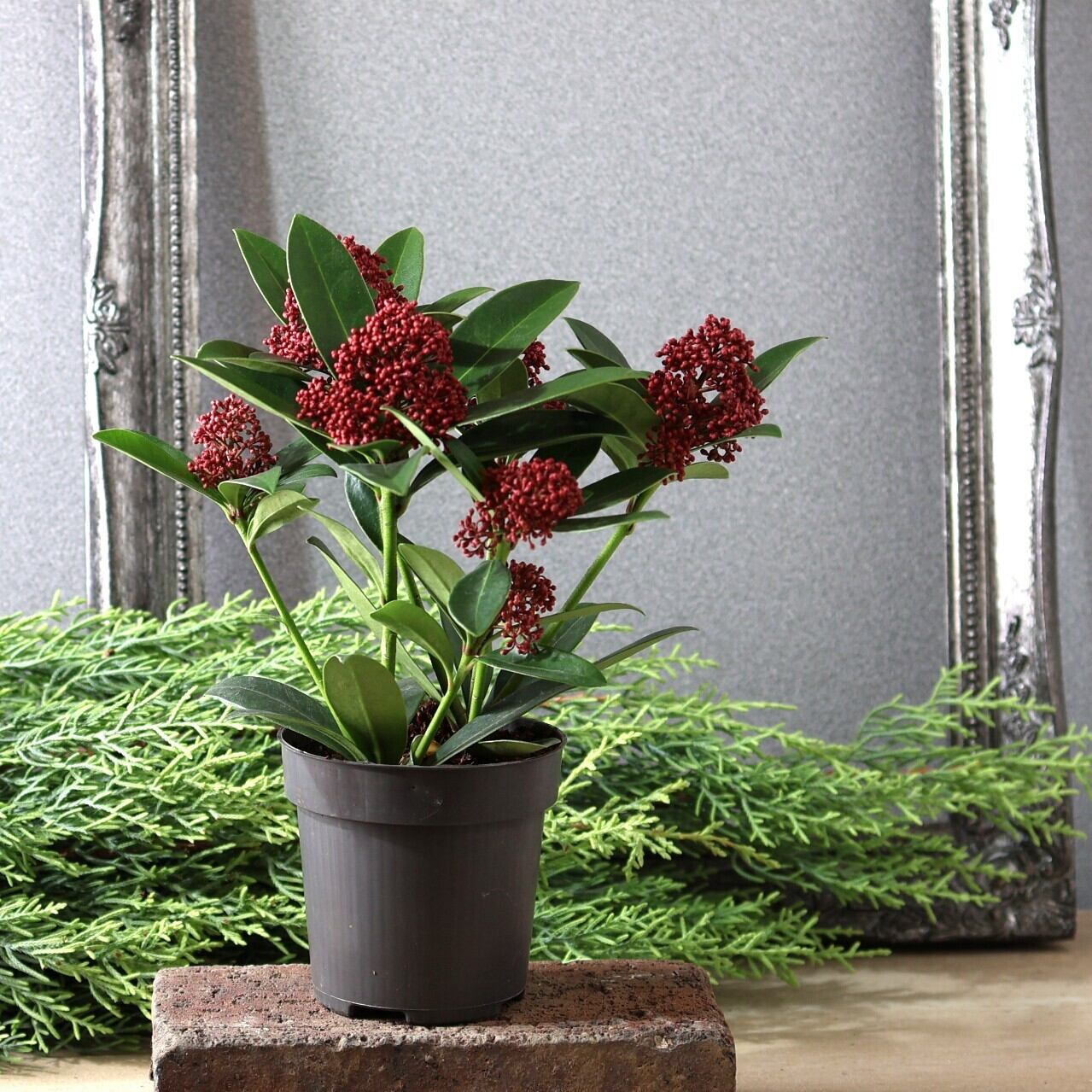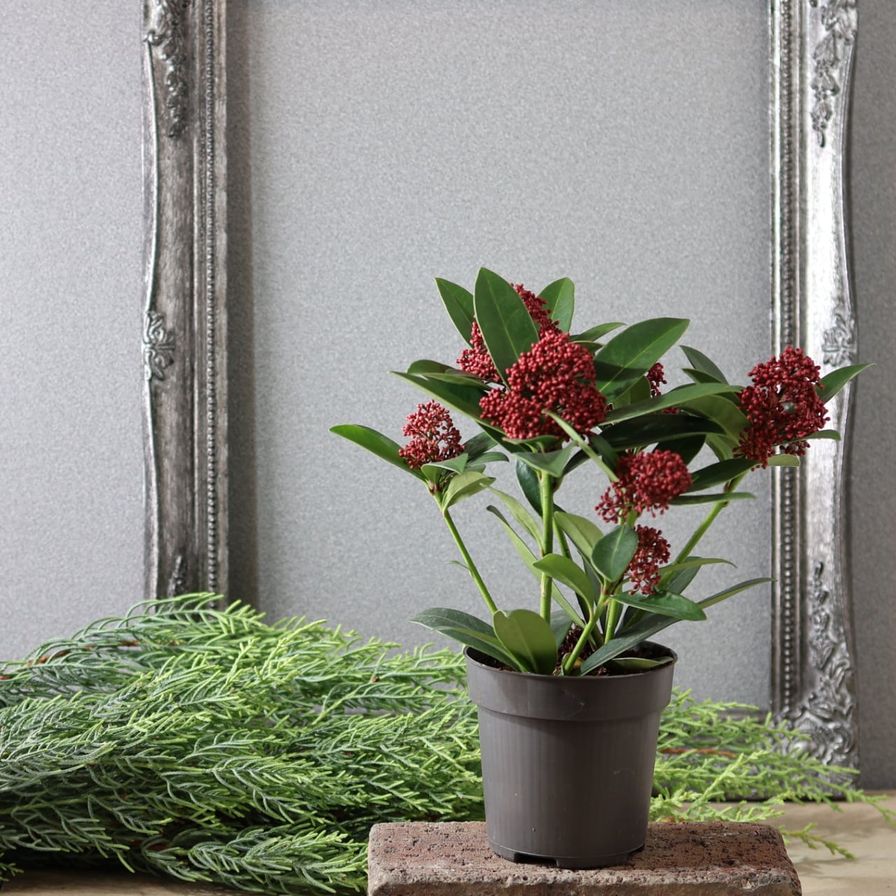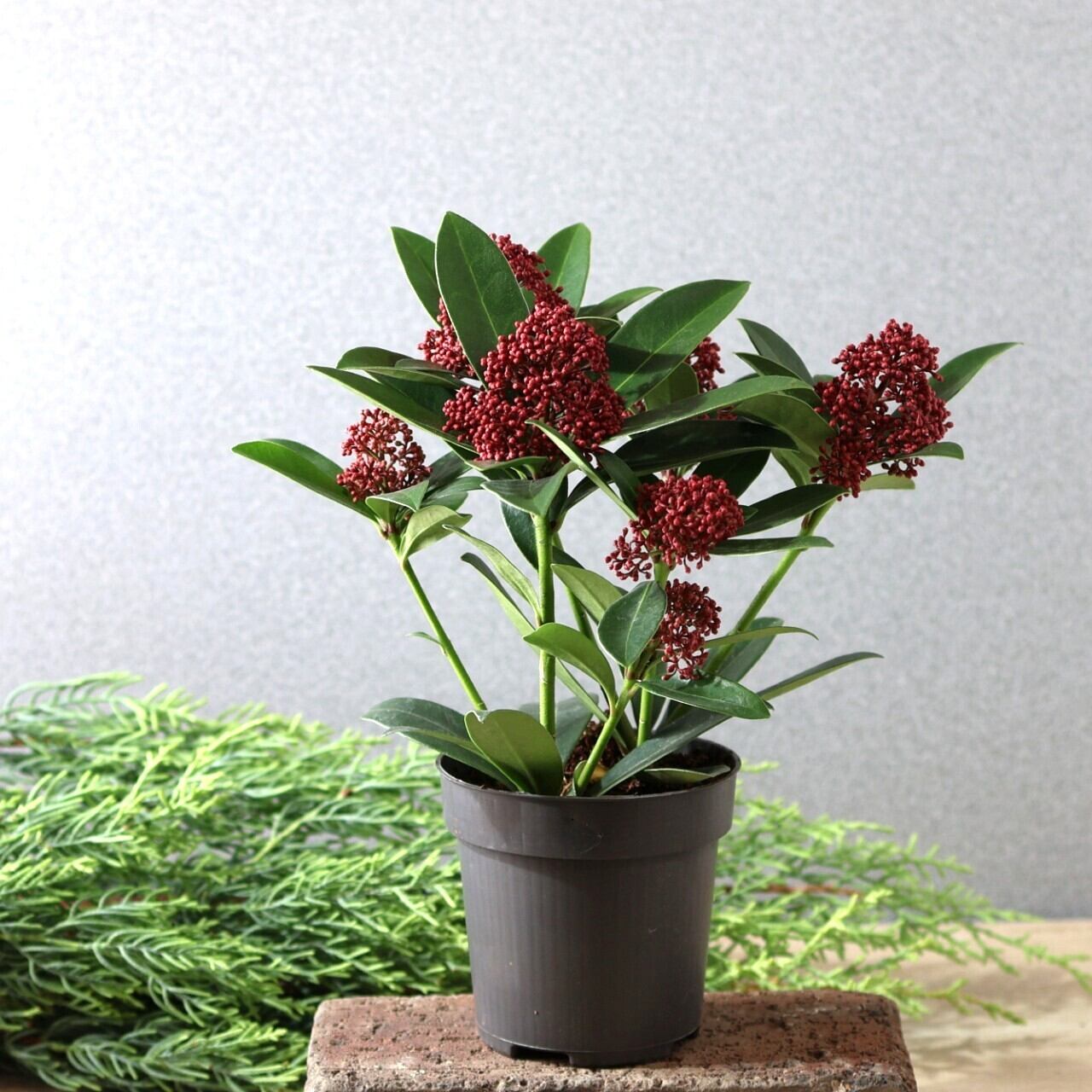 艶やかな緑葉に、ぎゅっと詰まった赤い蕾が愛らしいコンパクト品種「スキミア・レッドドワーフ」。