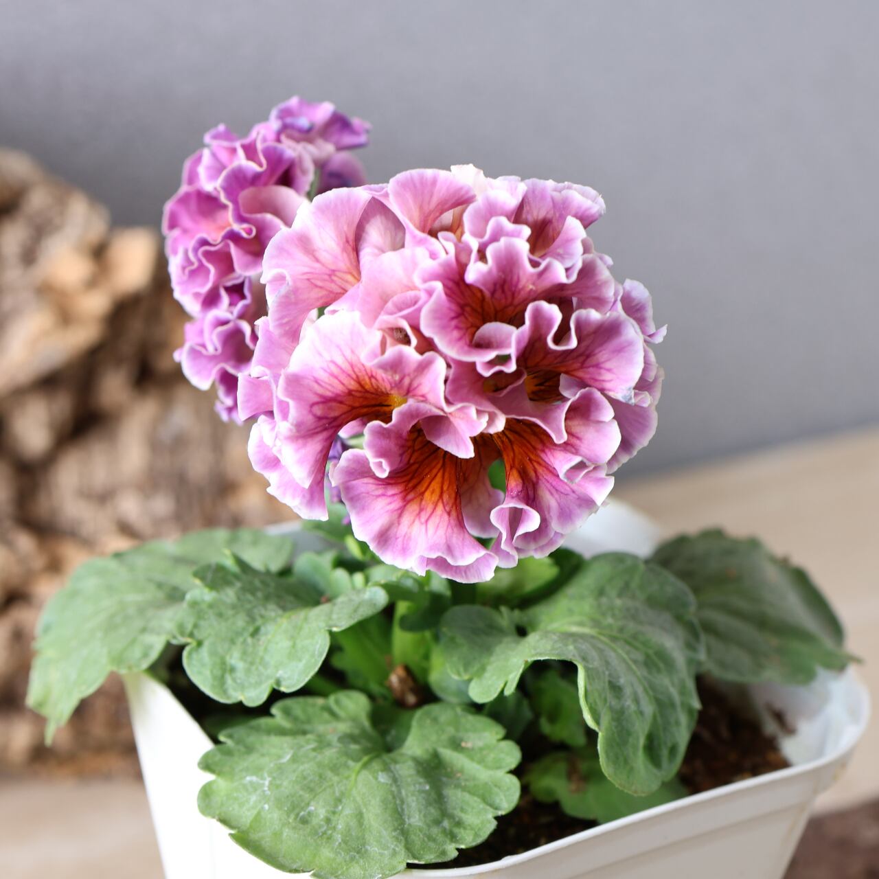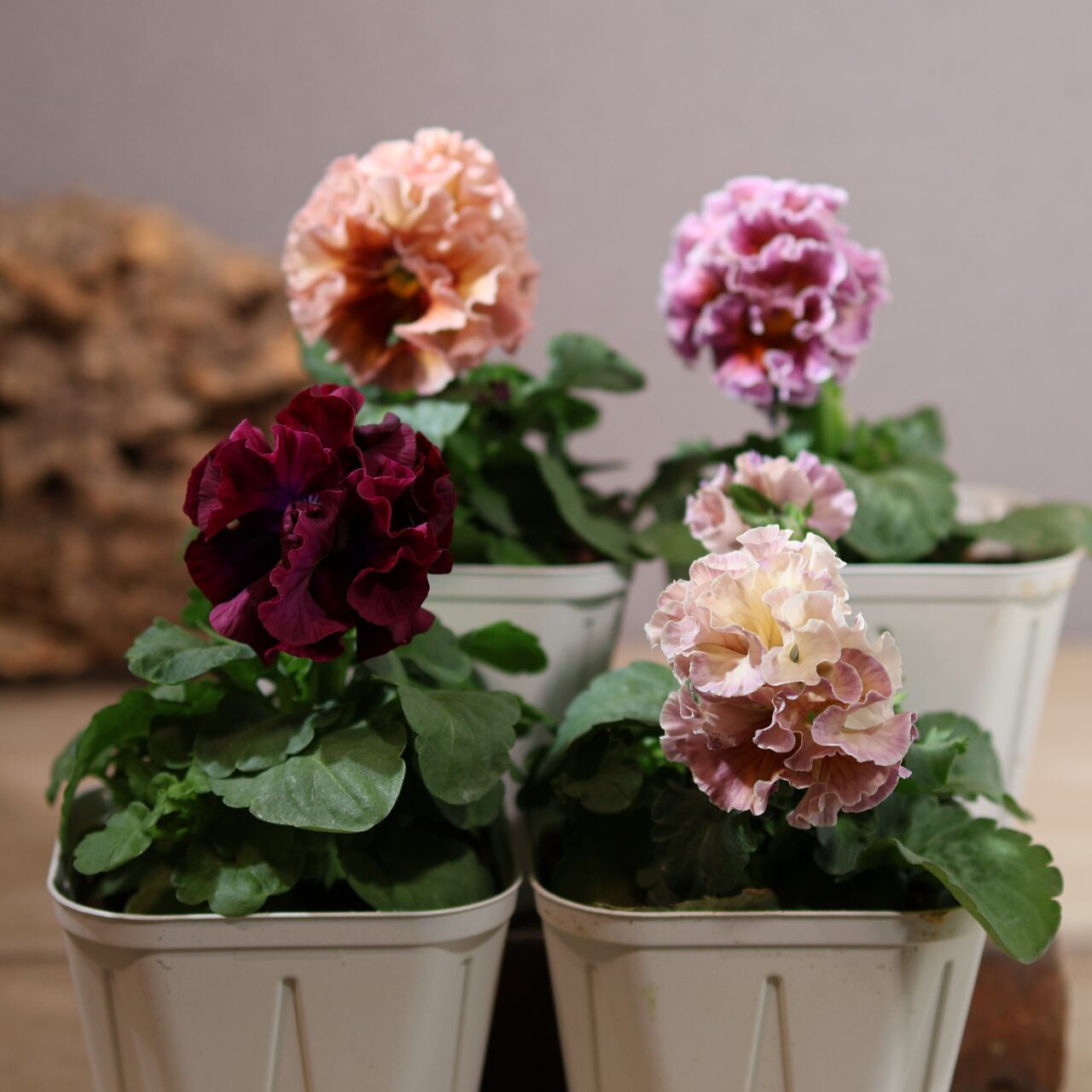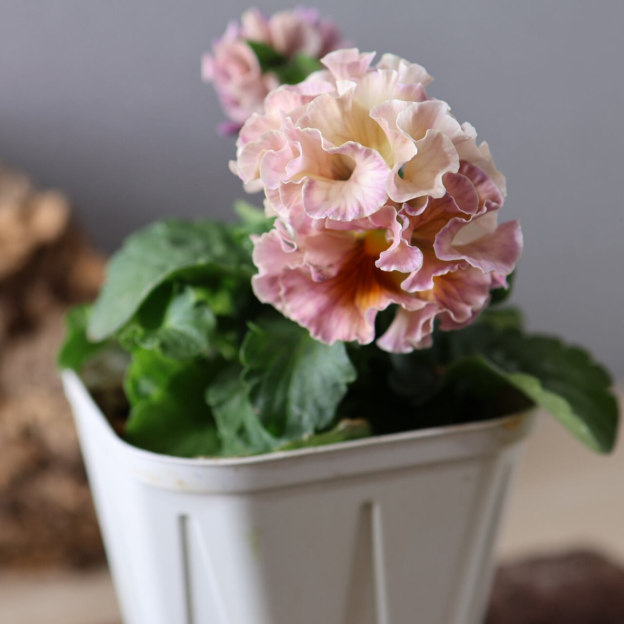 淡く優しいパステル調の花色に、ドレスの裾を思わせる繊細なフリルが重なり、ガーデンやインテリアグリーンとしても高い存在感を放ちます。冬〜春の寒い季節ほど鮮やかに発色し、フリルの深まりも楽しめるのが最大の魅力です。