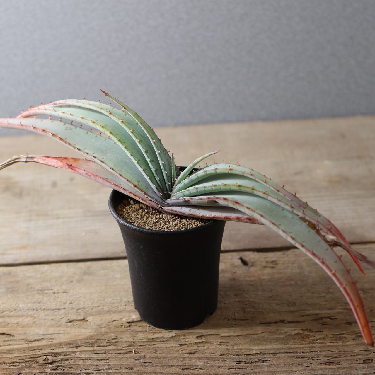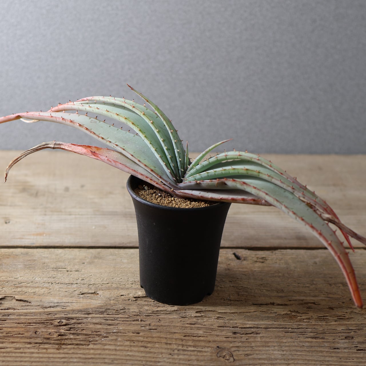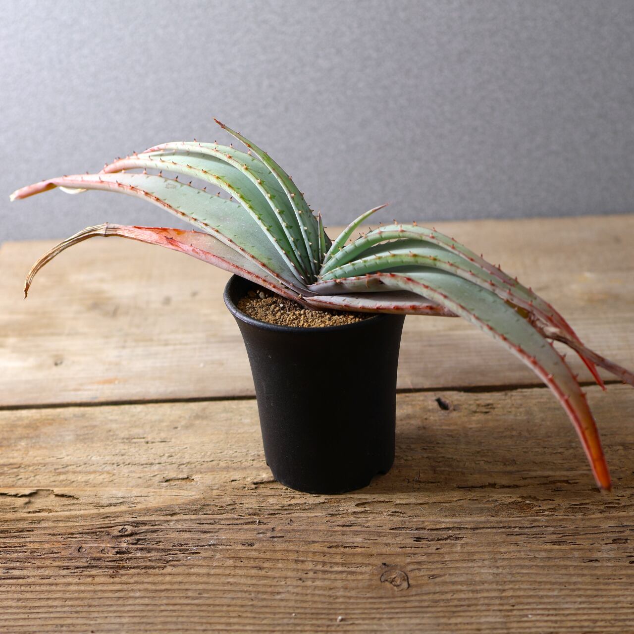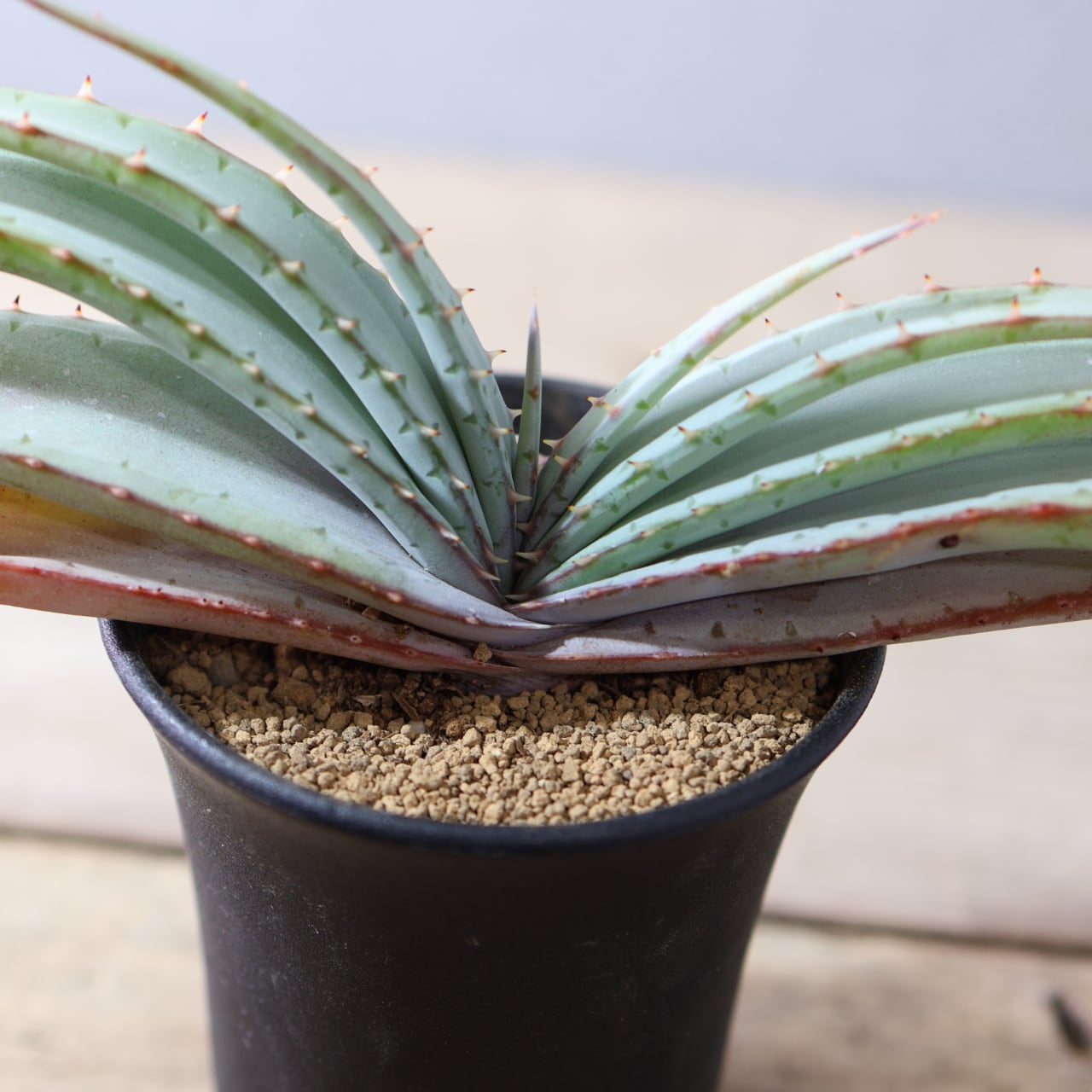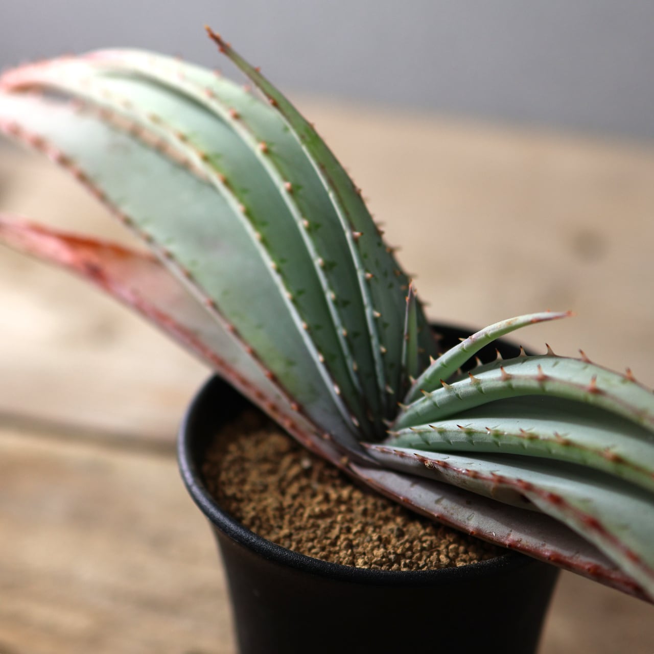 成長とともに葉がより強く湾曲し、重なり合う姿が美しく仕上がっていくため、育てるほどに表情の変化が楽しめます。丈夫で過酷な環境にも強く、インテリアとしても屋外管理でも映える万能なアロエです。