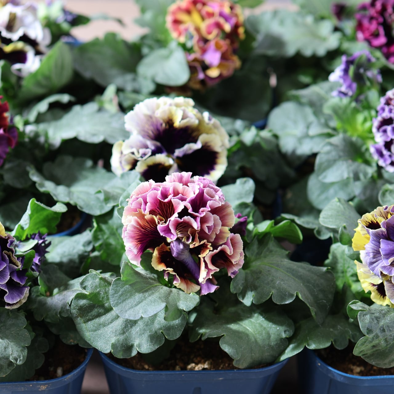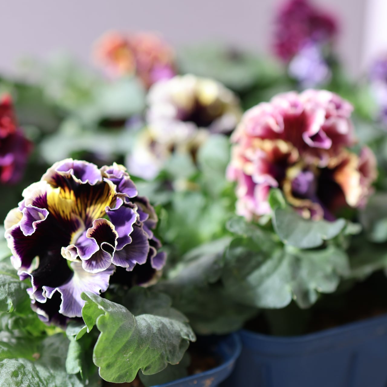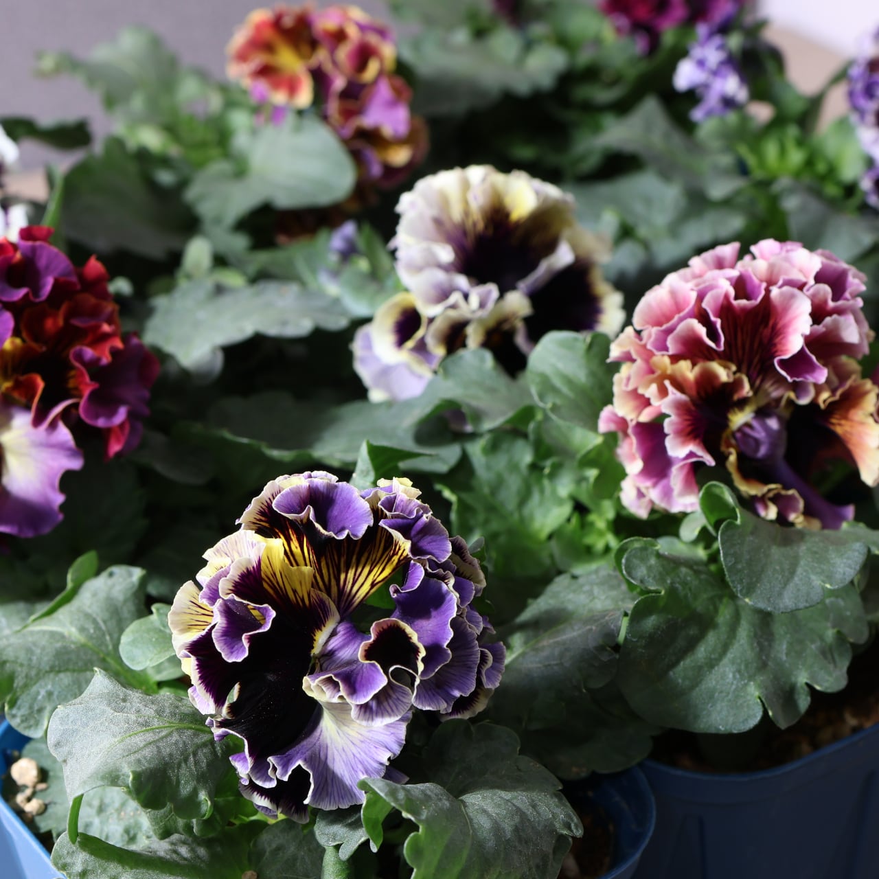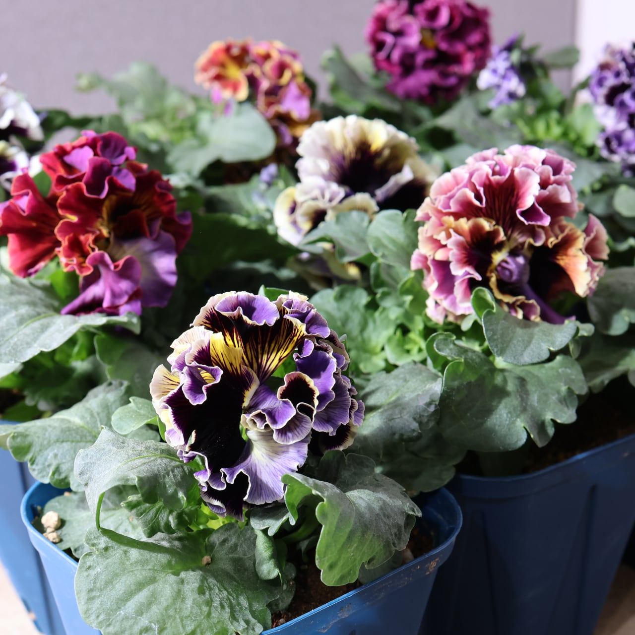濃色の覆輪や独特の立体感は、一株だけでも圧倒的な存在感。モノトーン鉢やクラシカルな陶器鉢とも相性がよく、玄関先・テラス・寄せ植えの主役として季節の彩りを引き立てます。