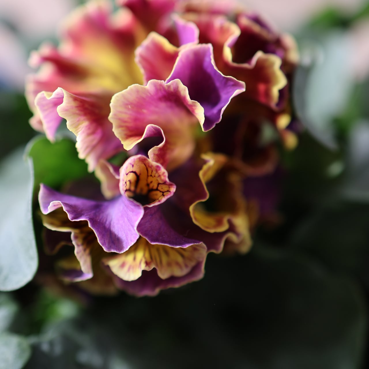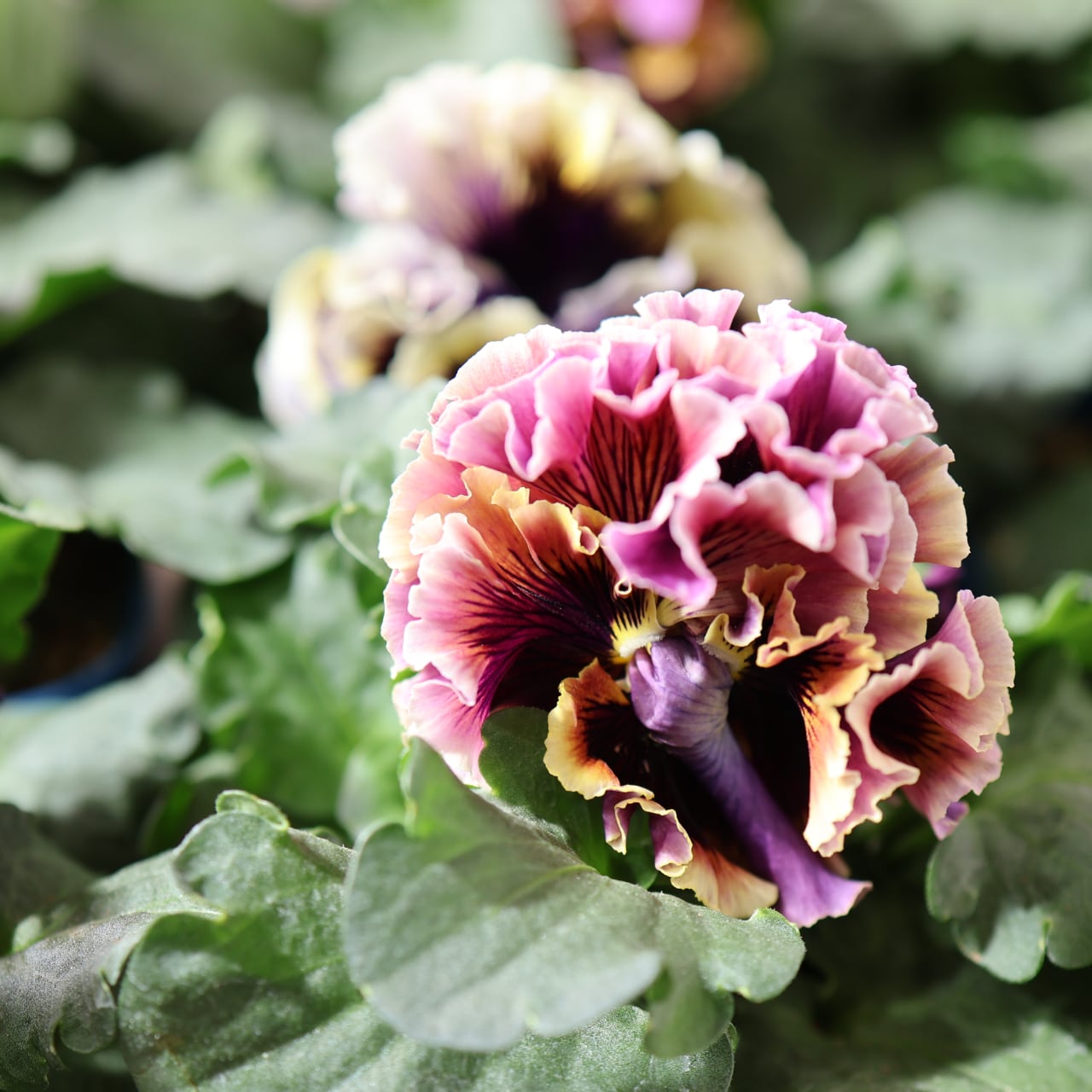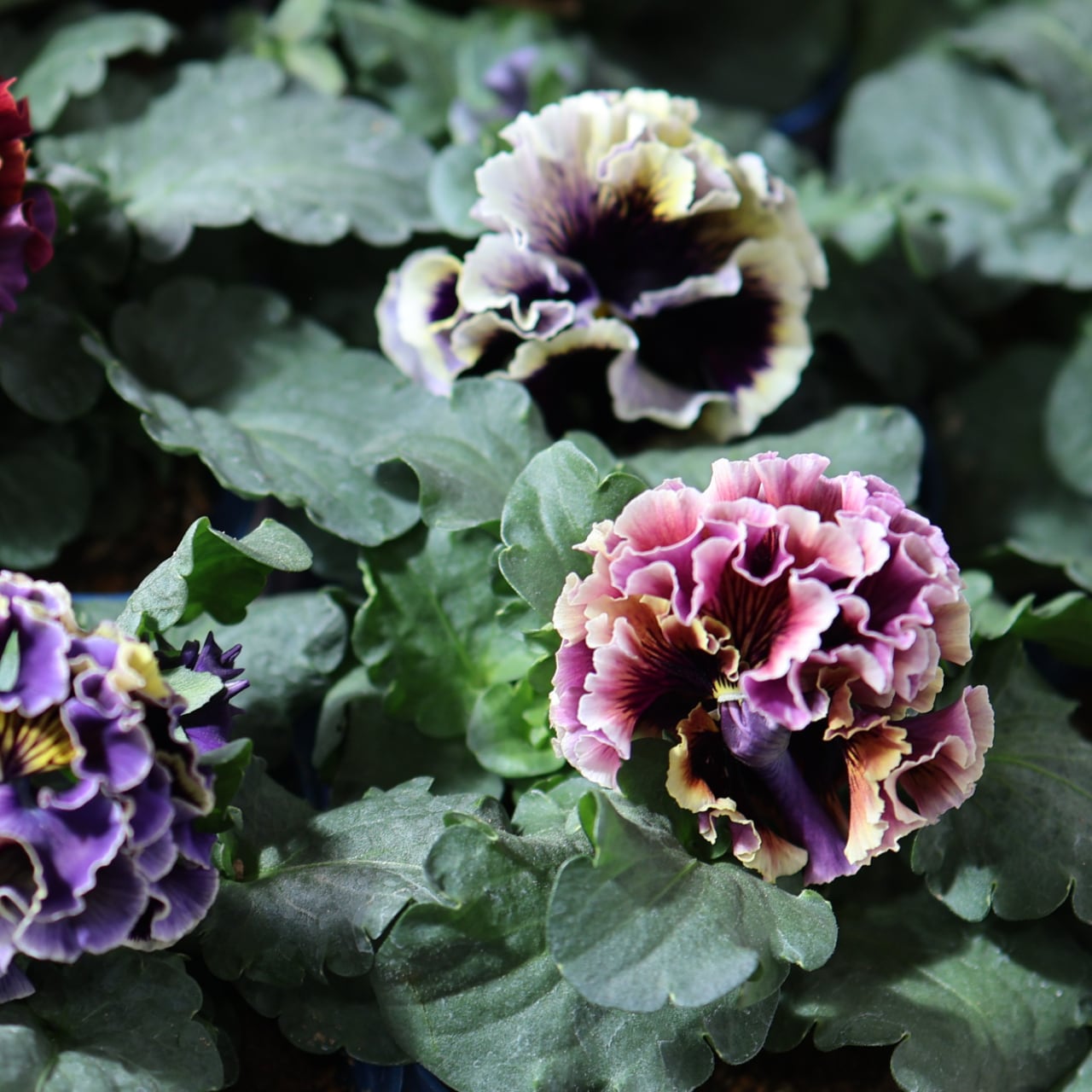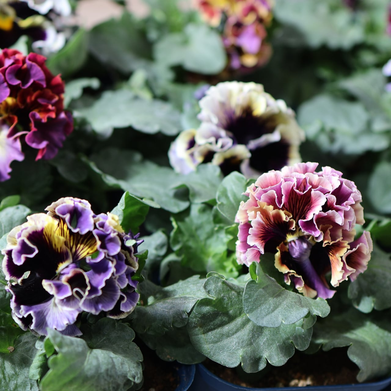 濃色の覆輪や独特の立体感は、一株だけでも圧倒的な存在感。モノトーン鉢やクラシカルな陶器鉢とも相性がよく、玄関先・テラス・寄せ植えの主役として季節の彩りを引き立てます。