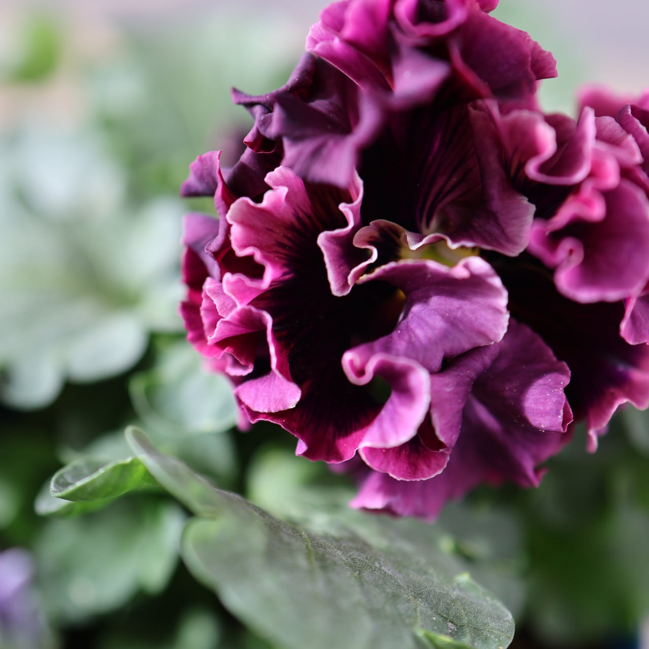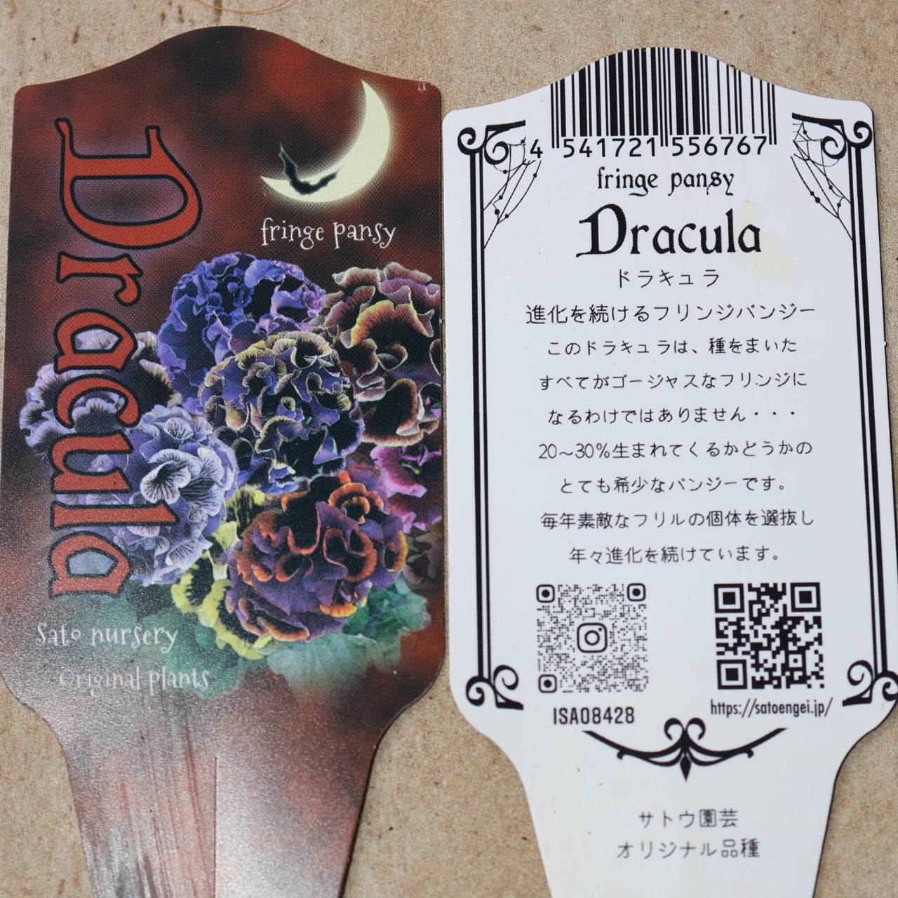重厚なフリルと深みのある色彩で注目を集める、サトウ園芸のプレミアムパンジー「ドラキュラ」。幾重にも重なった花びらが球状に広がり、まるでベルベットのような陰影をつくり出します。寒さが増すほど発色が引き締まり、より力強く、よりドラマティックな表情へ変化していくのも魅力のひとつ。