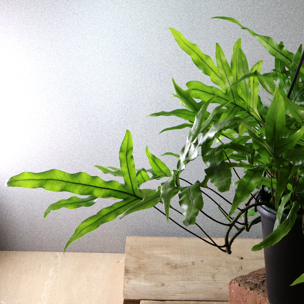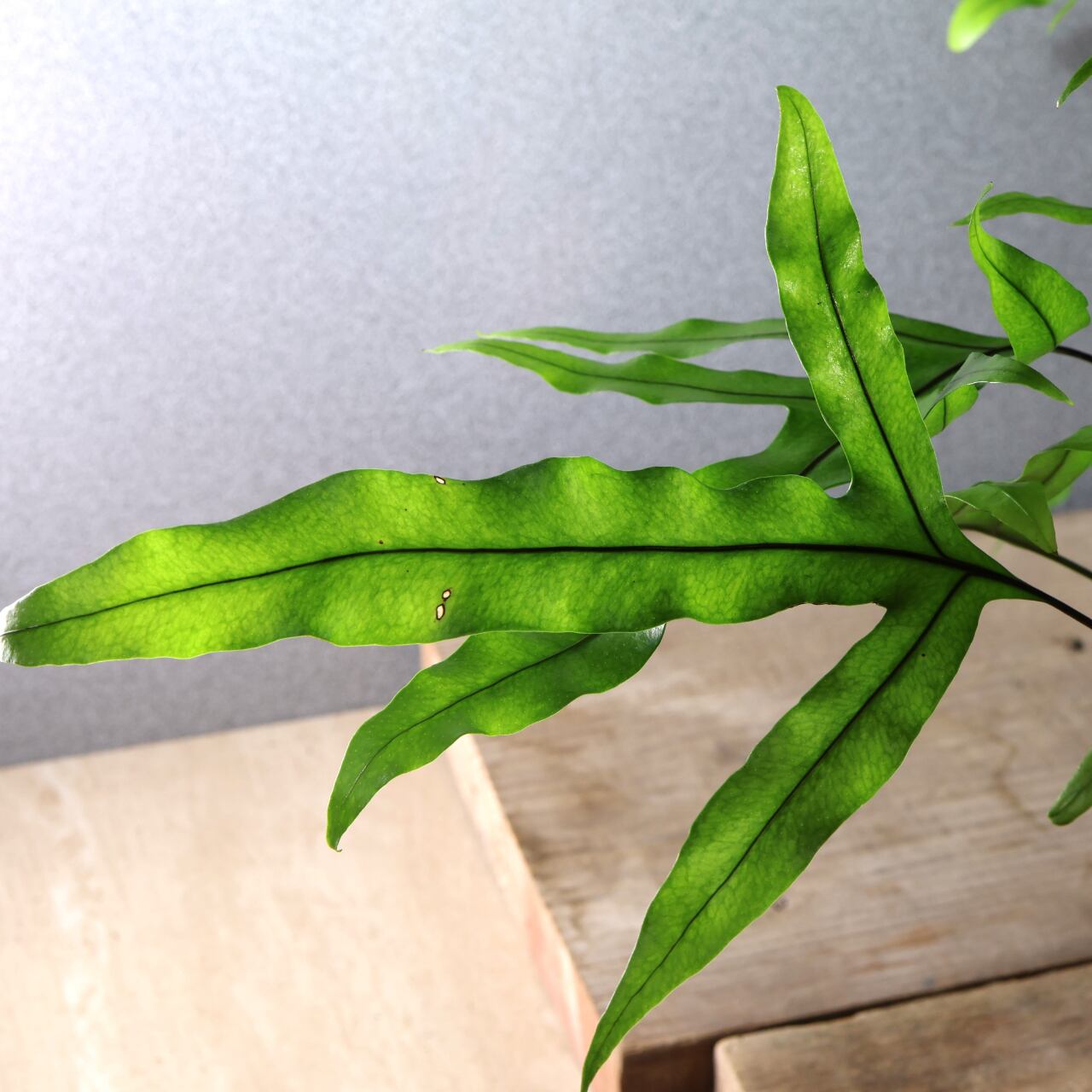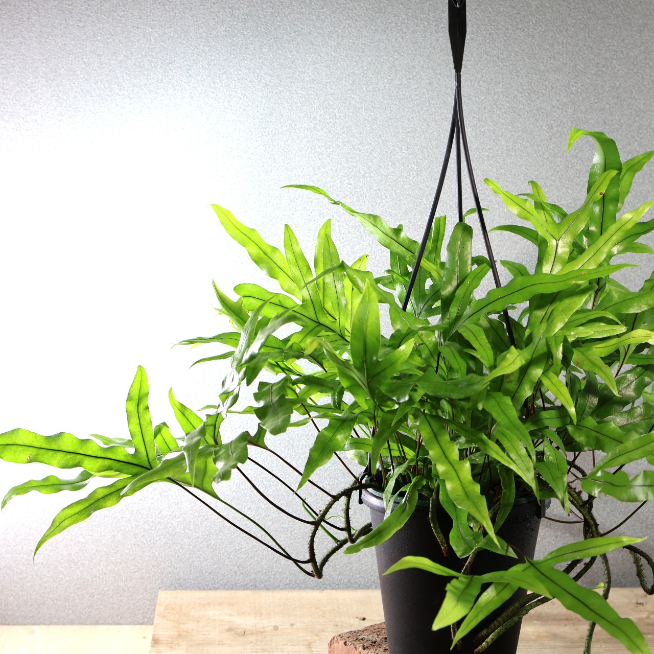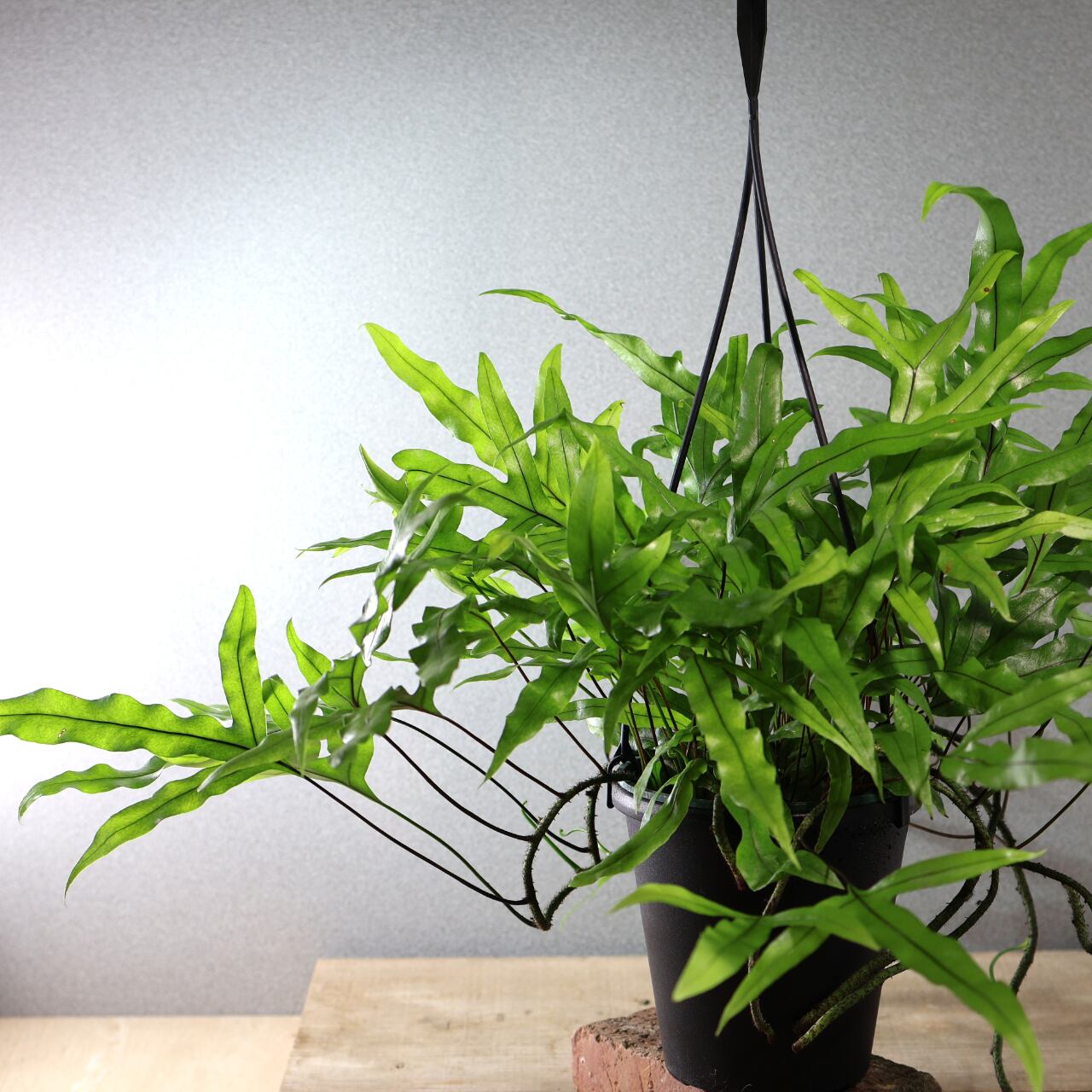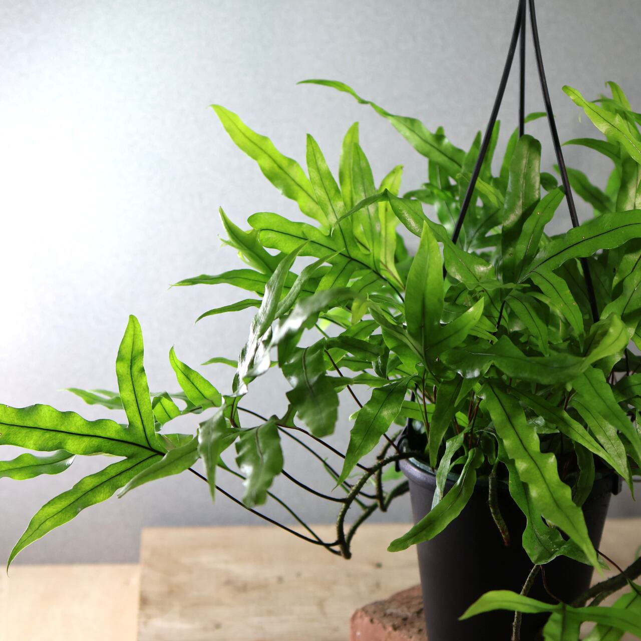 カンガルーファンはオーストラリア・ニュージーランド原産で、つやのある細めの葉がわさっとたくさん茂るようすが魅力的な常緑性のシダの仲間。カンガルーの前足のような様子からこの名があります。鉢から外にぐんぐん伸びてくる根も野性味があります。ほとんど日が当たらない部屋でも育つほど耐陰性の強い品種です。直射日光を避けて管理してください。