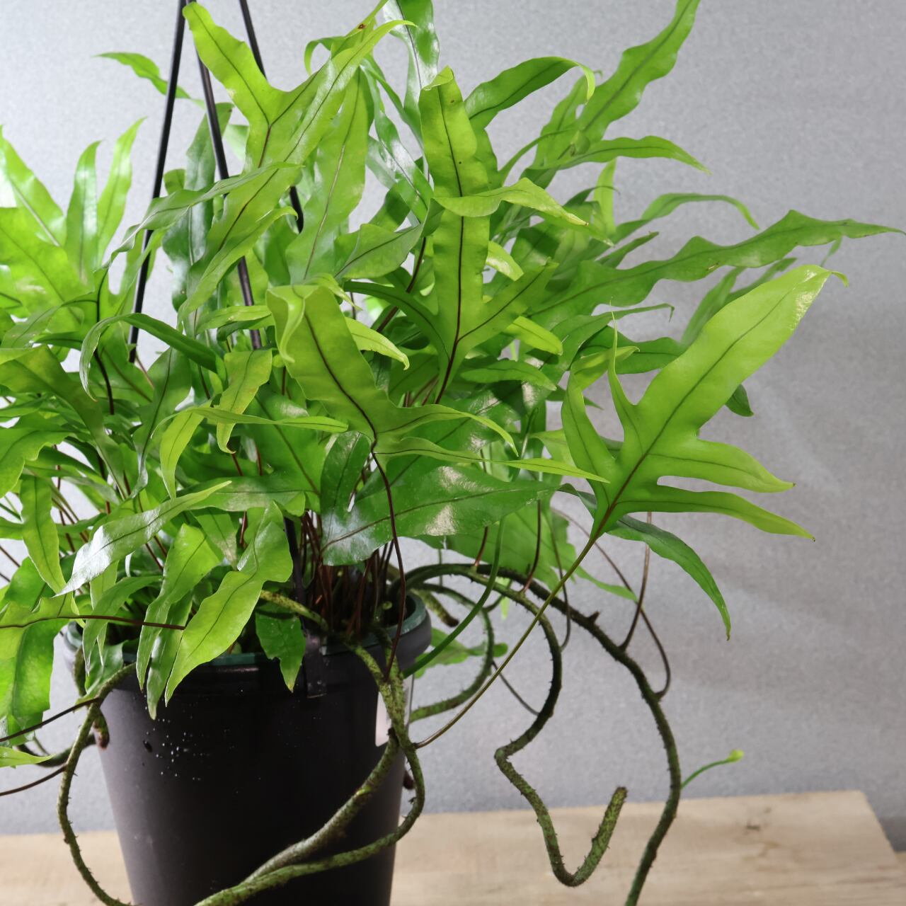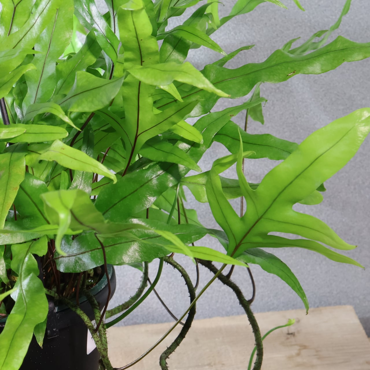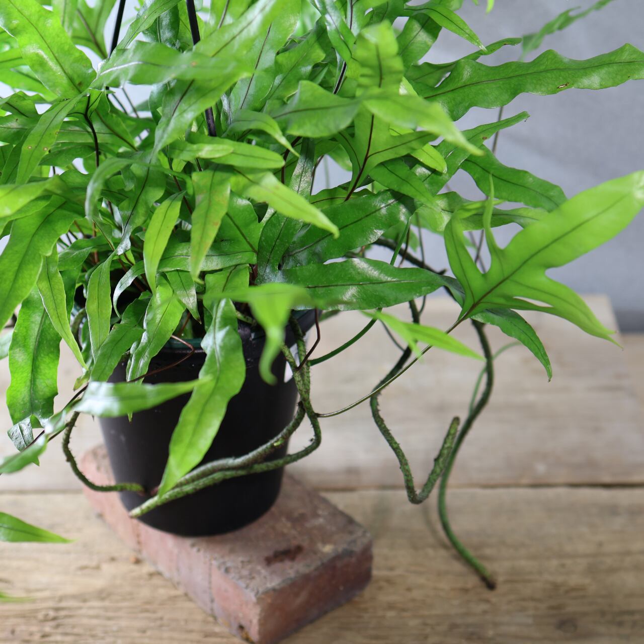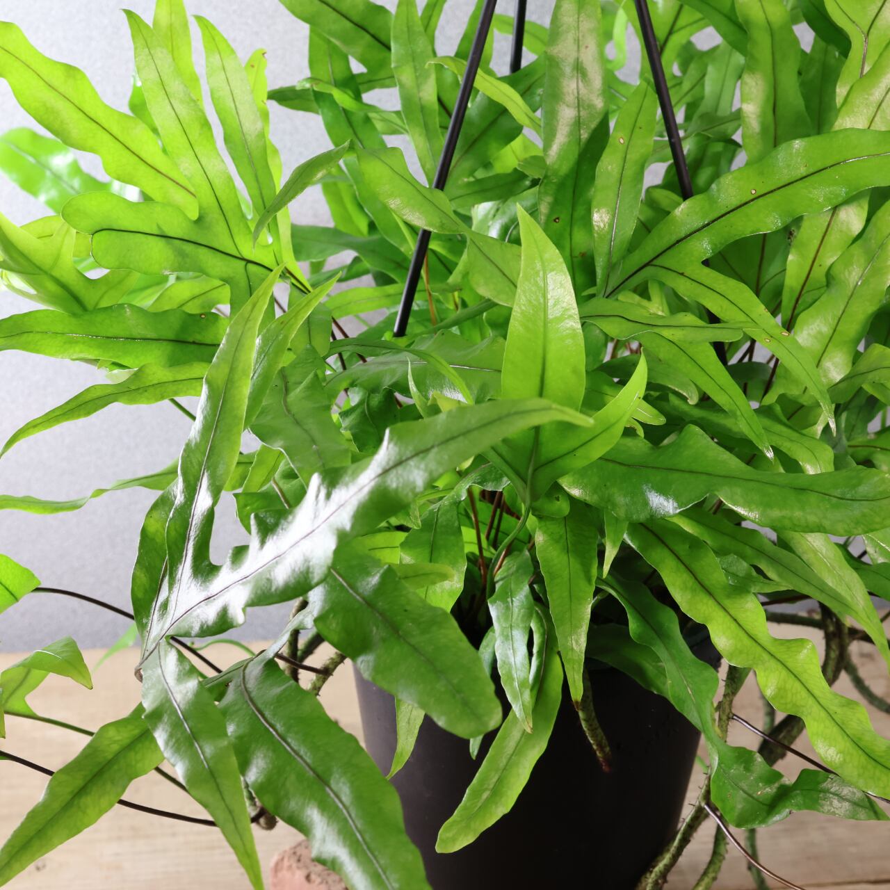 カンガルーファンはオーストラリア・ニュージーランド原産で、つやのある細めの葉がわさっとたくさん茂るようすが魅力的な常緑性のシダの仲間。カンガルーの前足のような様子からこの名があります。鉢から外にぐんぐん伸びてくる根も野性味があります。ほとんど日が当たらない部屋でも育つほど耐陰性の強い品種です。直射日光を避けて管理してください。