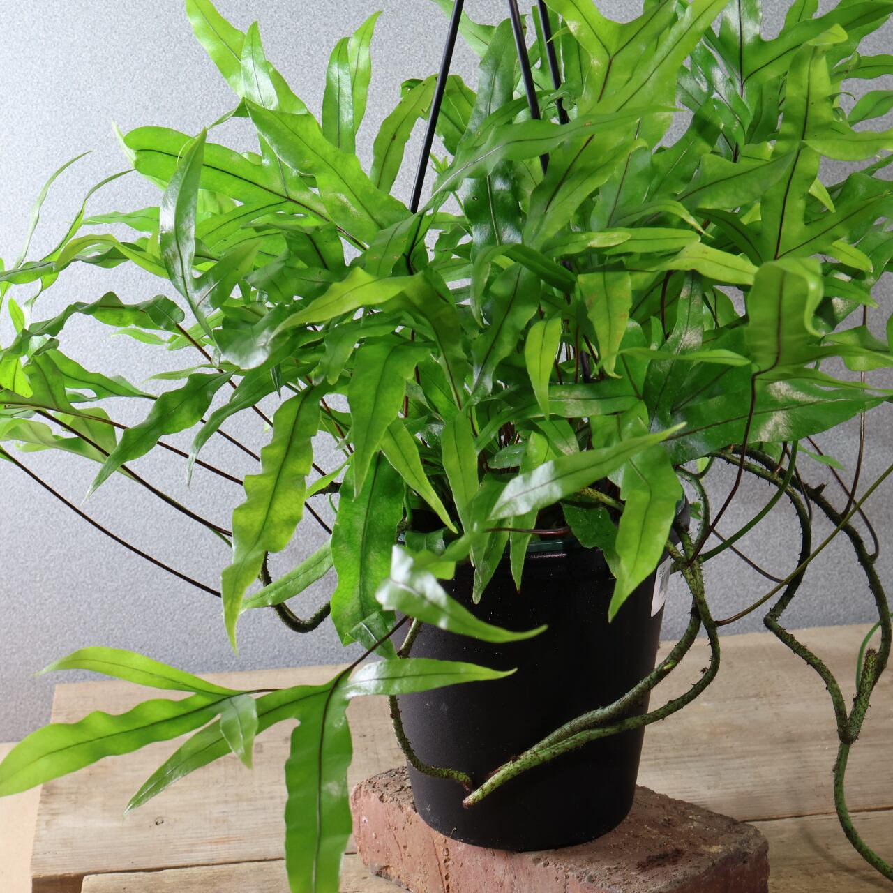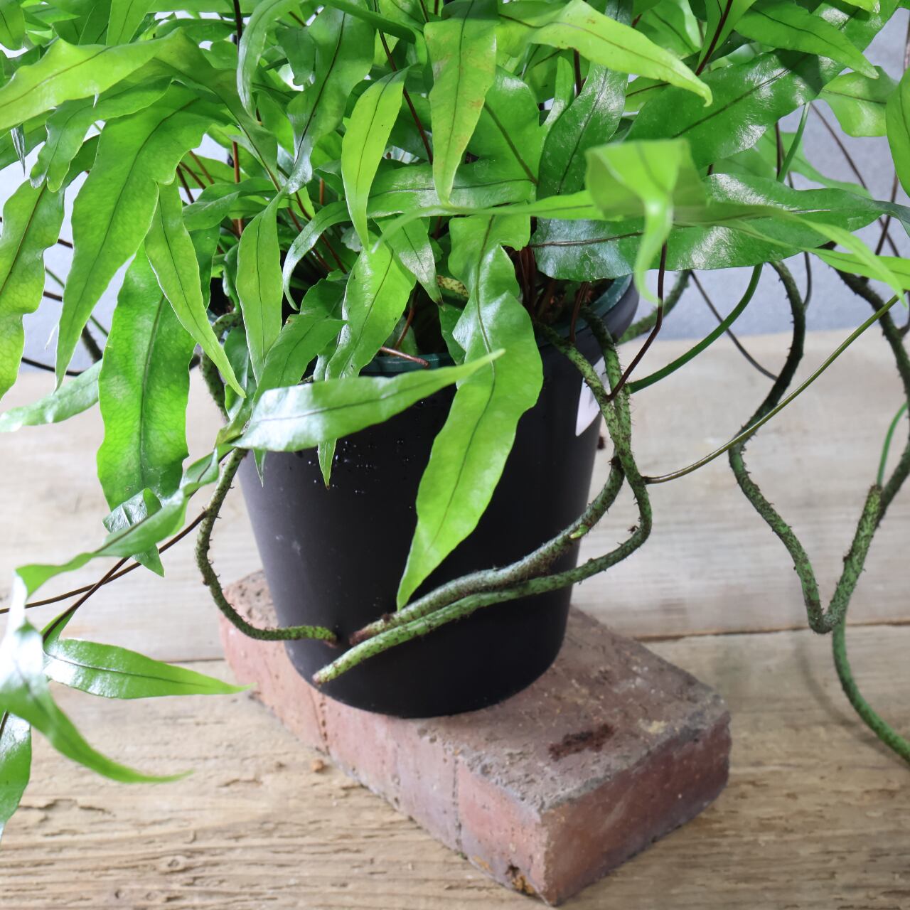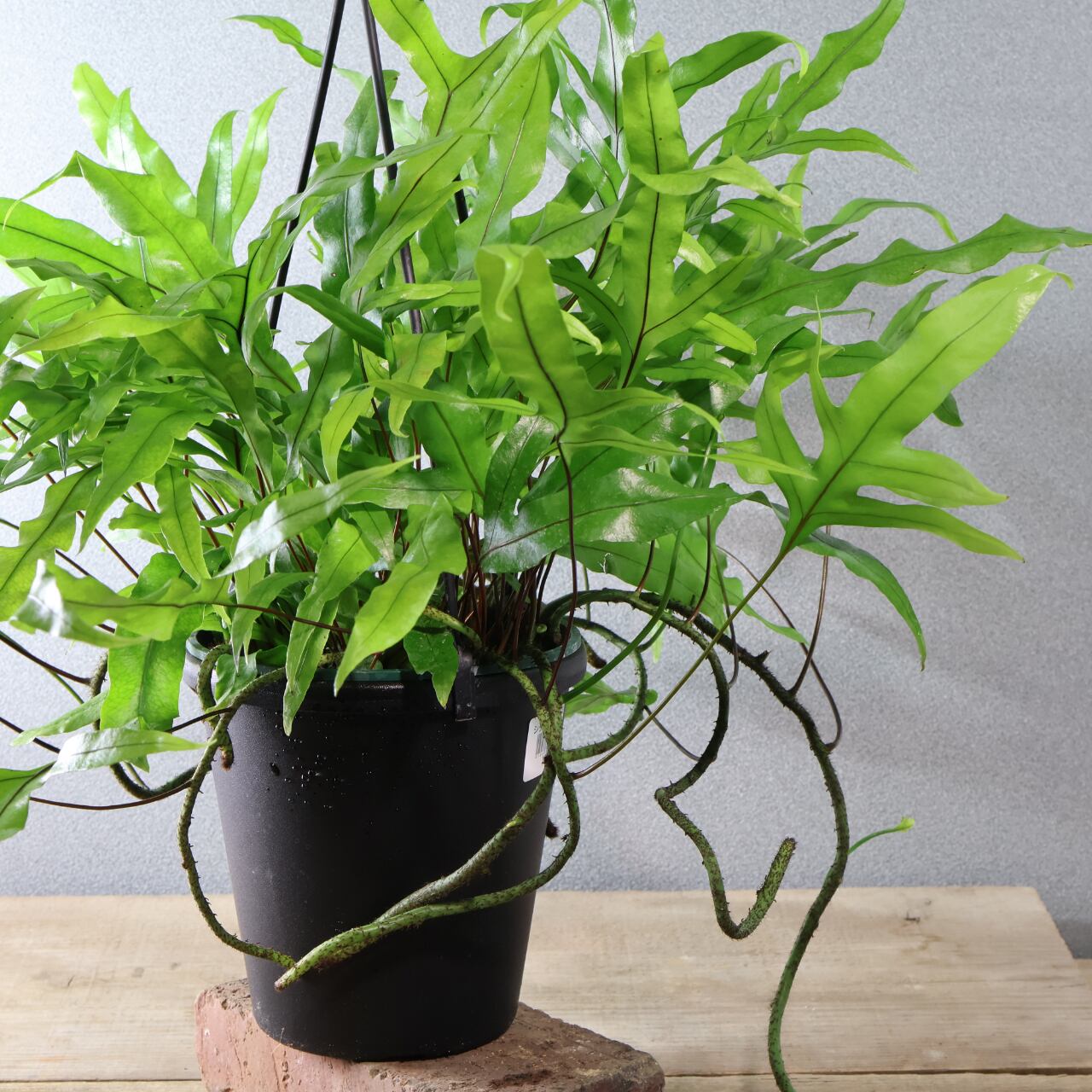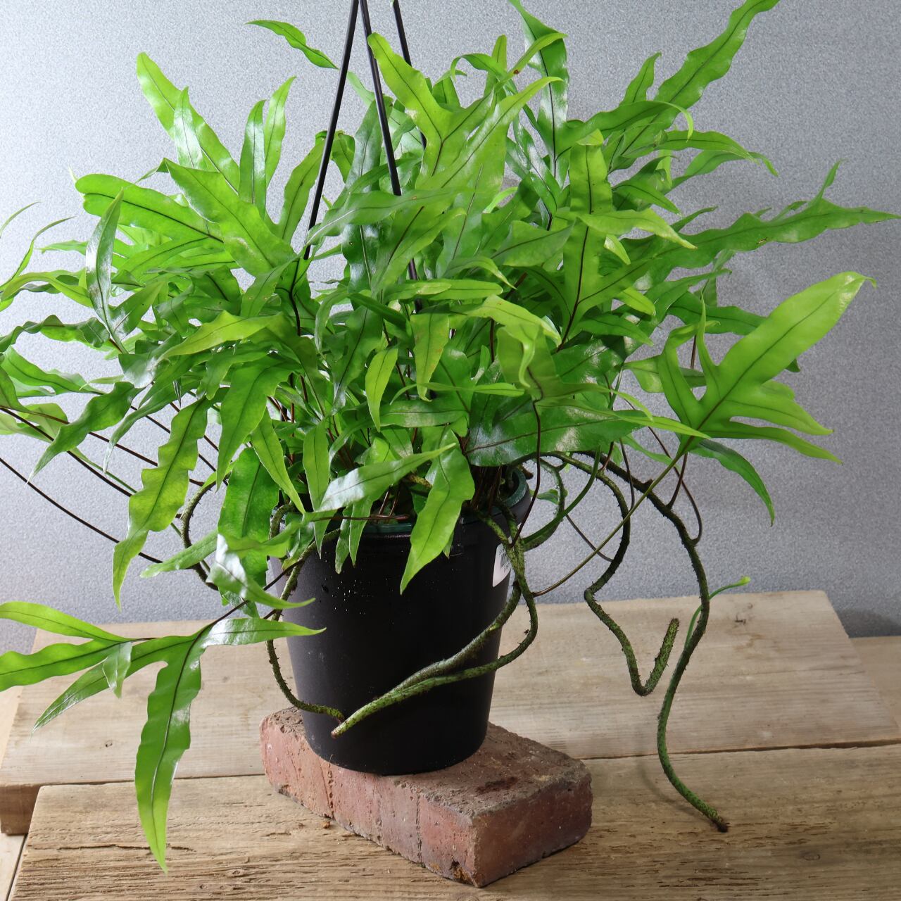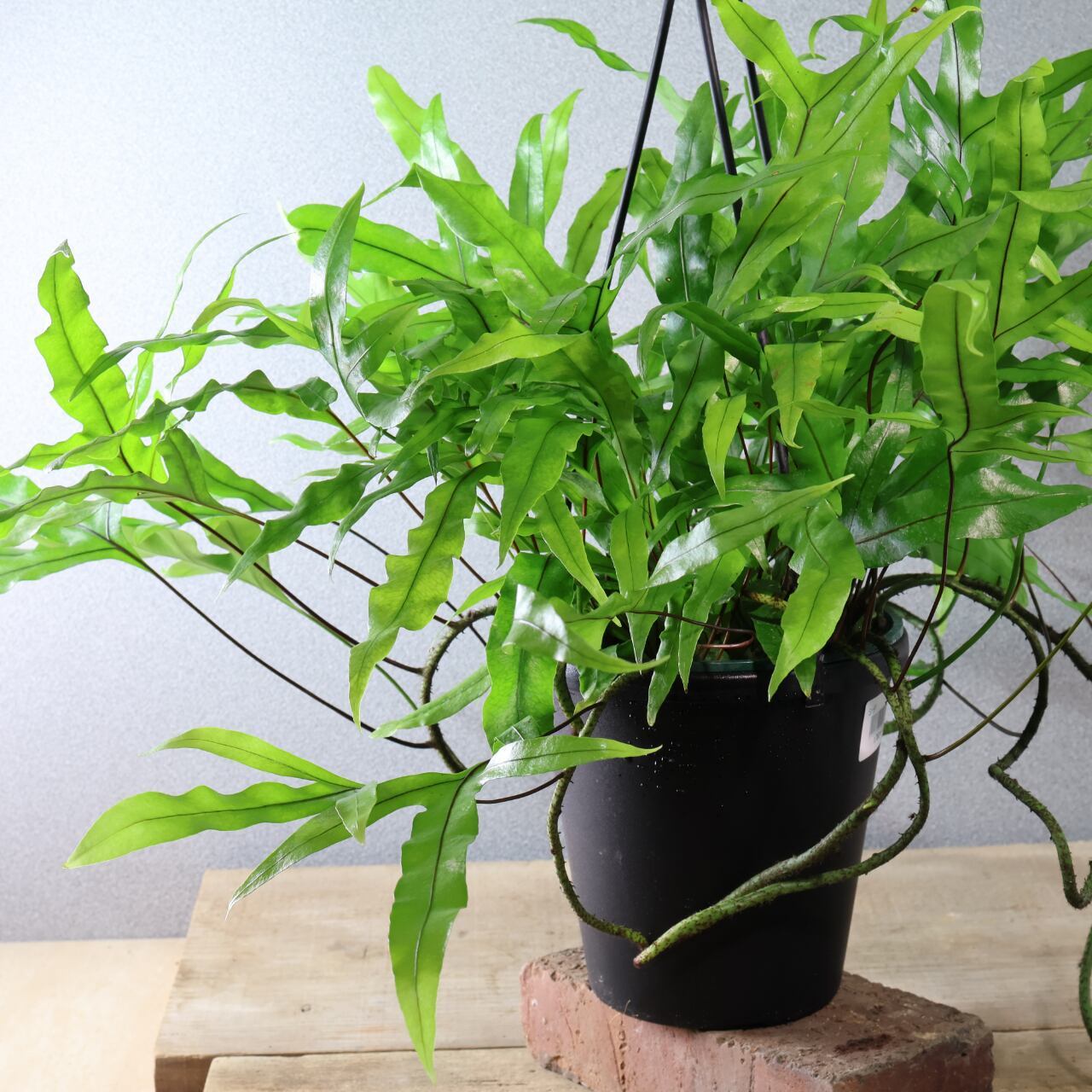 カンガルーファンはオーストラリア・ニュージーランド原産で、つやのある細めの葉がわさっとたくさん茂るようすが魅力的な常緑性のシダの仲間。カンガルーの前足のような様子からこの名があります。鉢から外にぐんぐん伸びてくる根も野性味があります。ほとんど日が当たらない部屋でも育つほど耐陰性の強い品種です。直射日光を避けて管理してください。