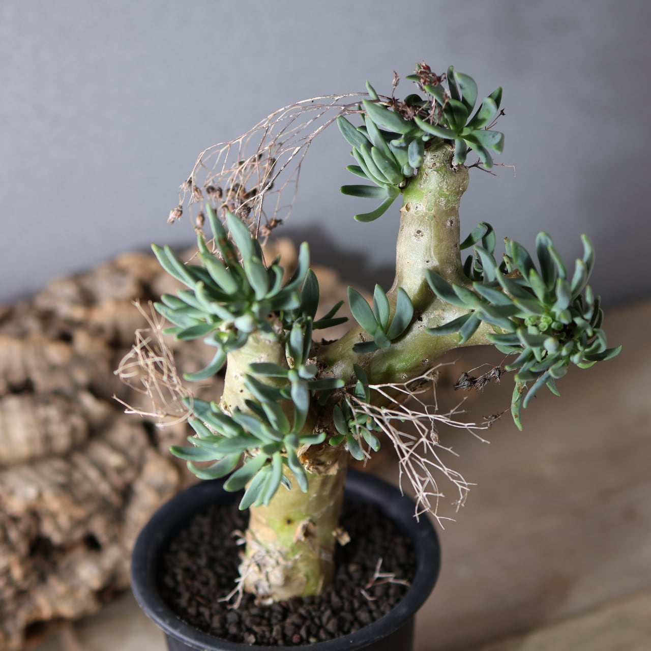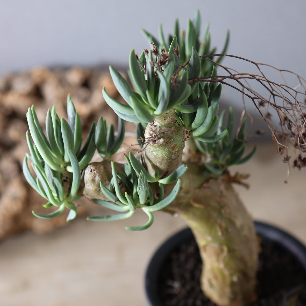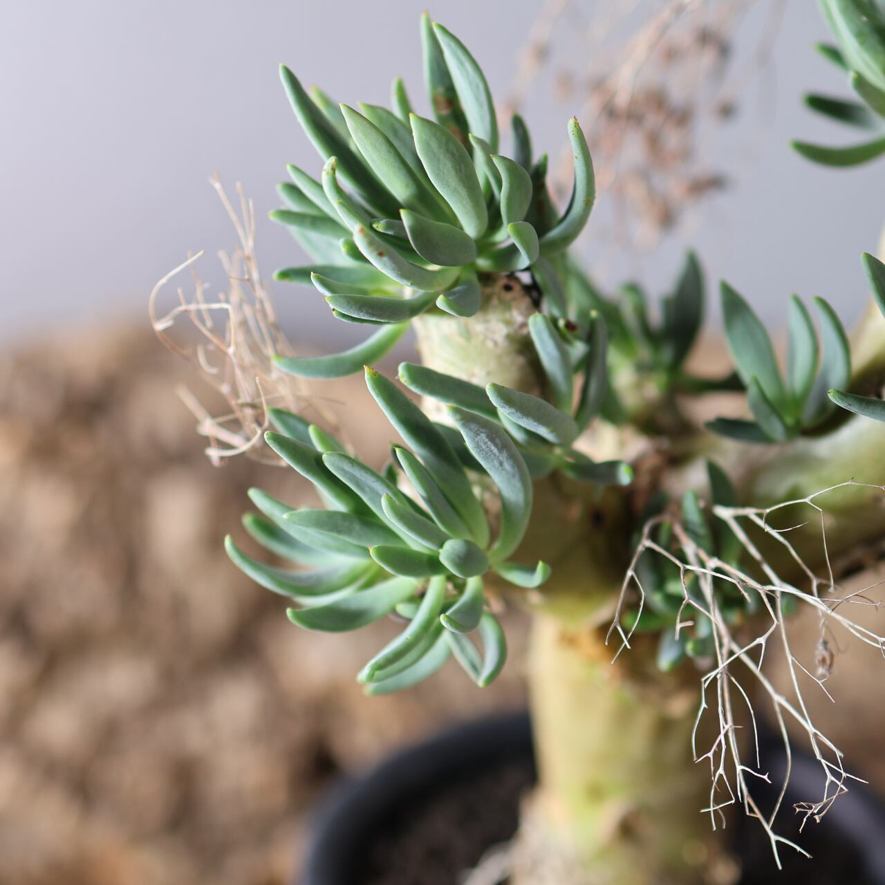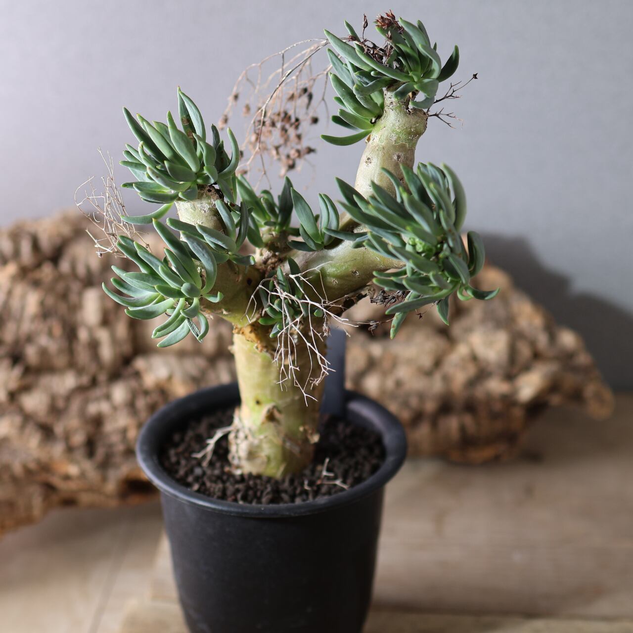 チレコドン・レティキュラーツスの最大の特徴は、花柄(花梗)、が枯れた跡が細い針金のように残りつづけ、年を経るごとにどんどん奇妙な見た目になっていくところです。