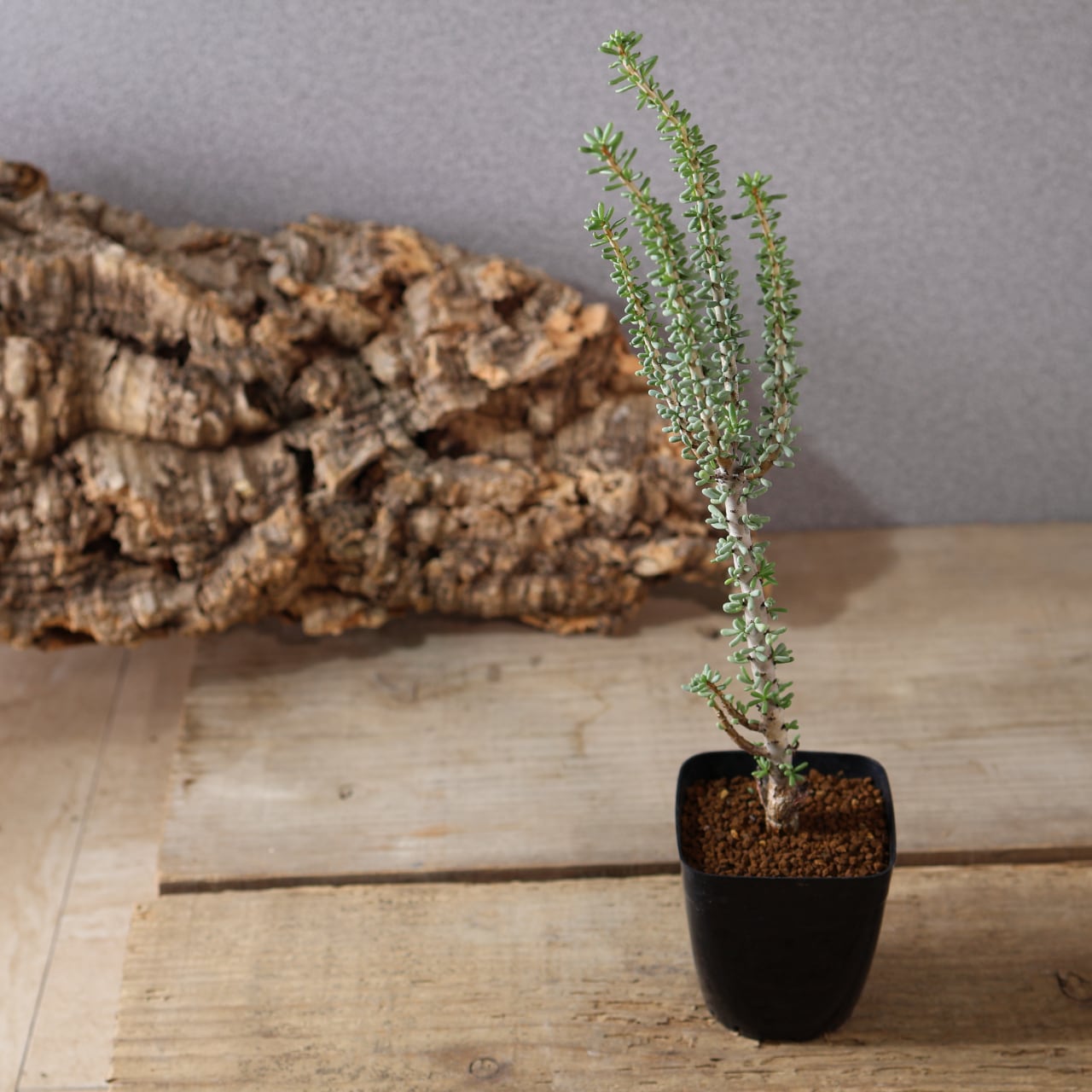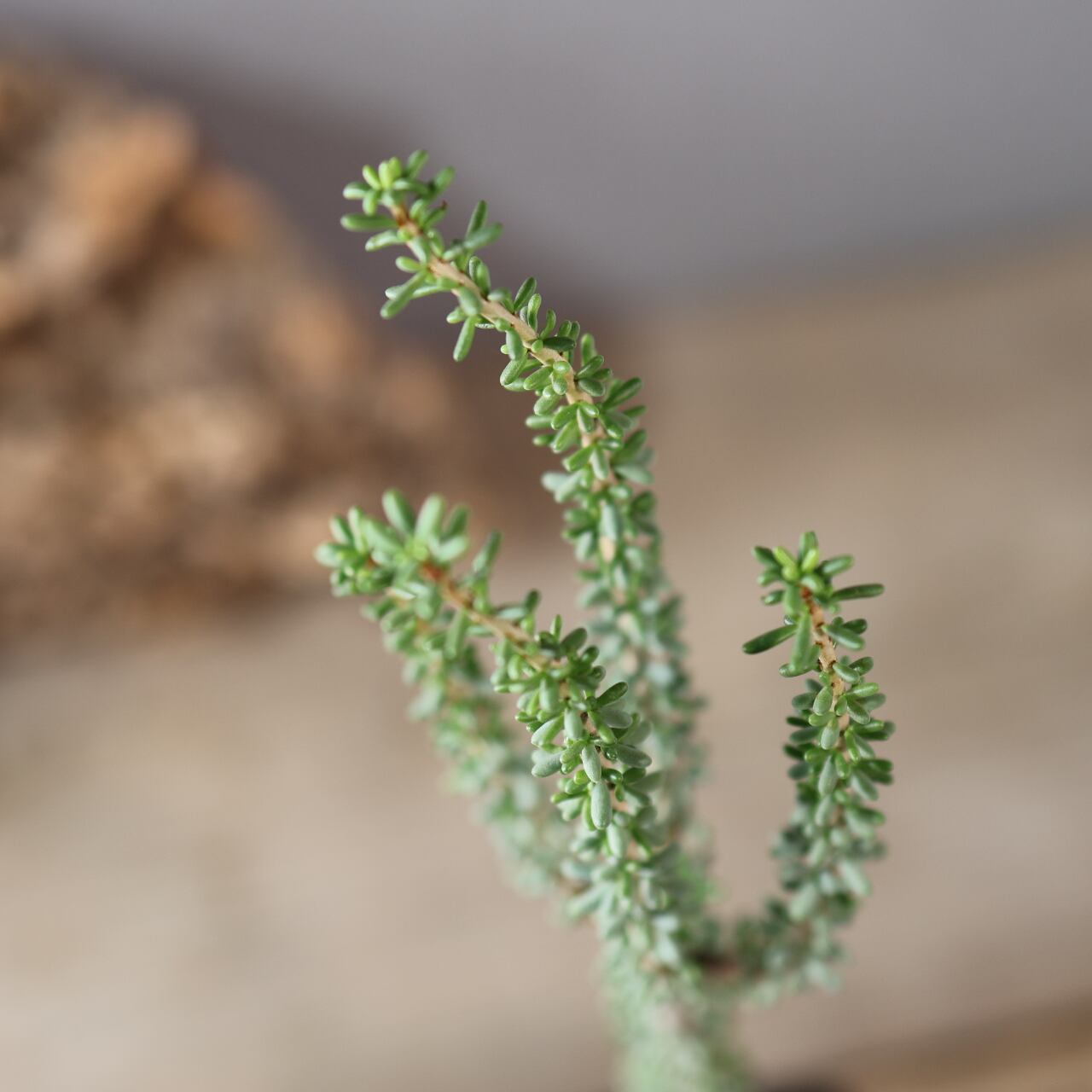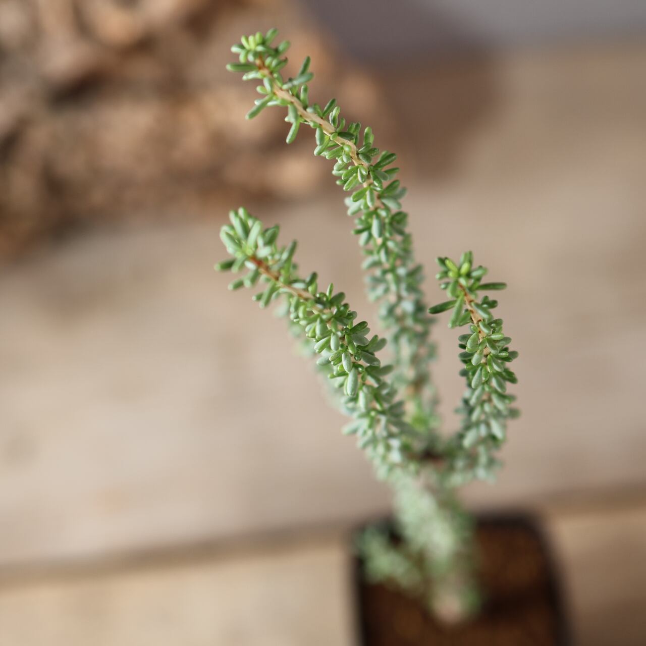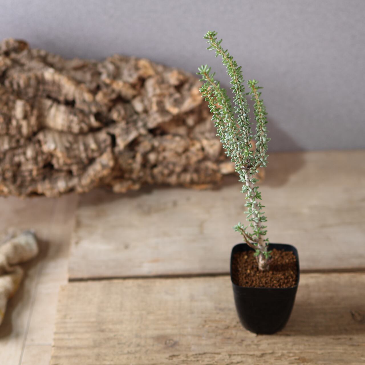 ぷっくりと膨らんだ枝と、細かい多肉質の葉が愛らしく、まるで“木質化した盆栽と多肉のあいの子”のような独特の姿が魅力です。
