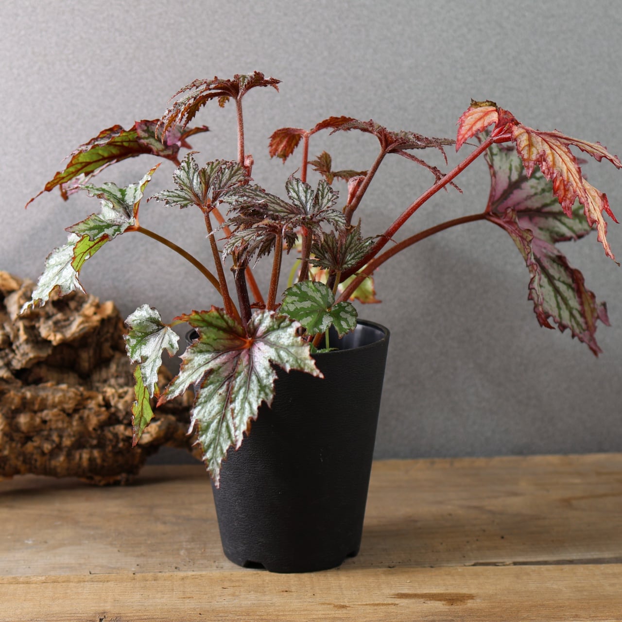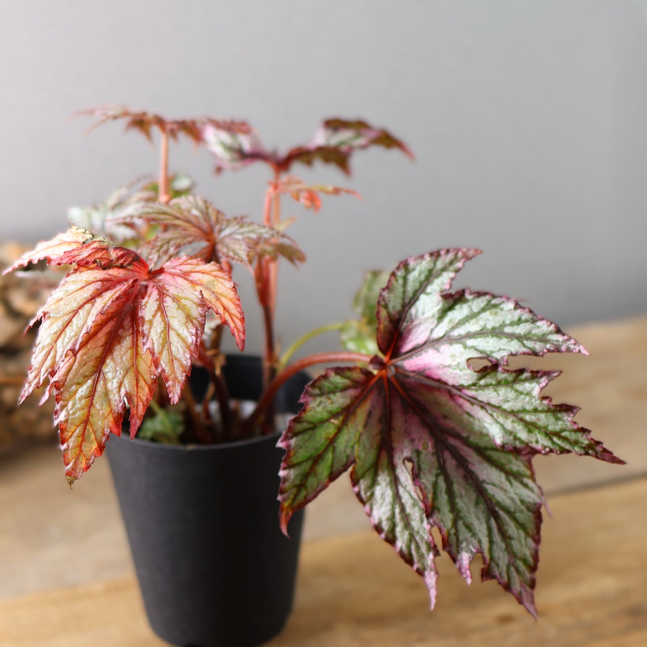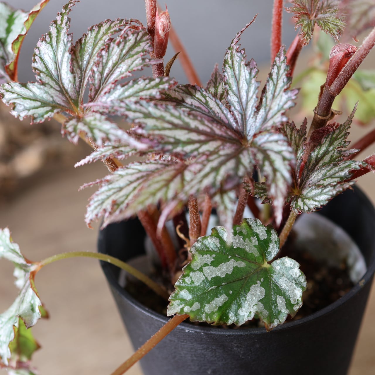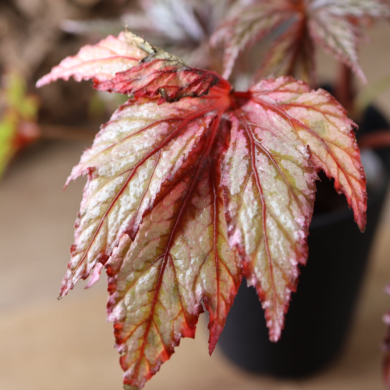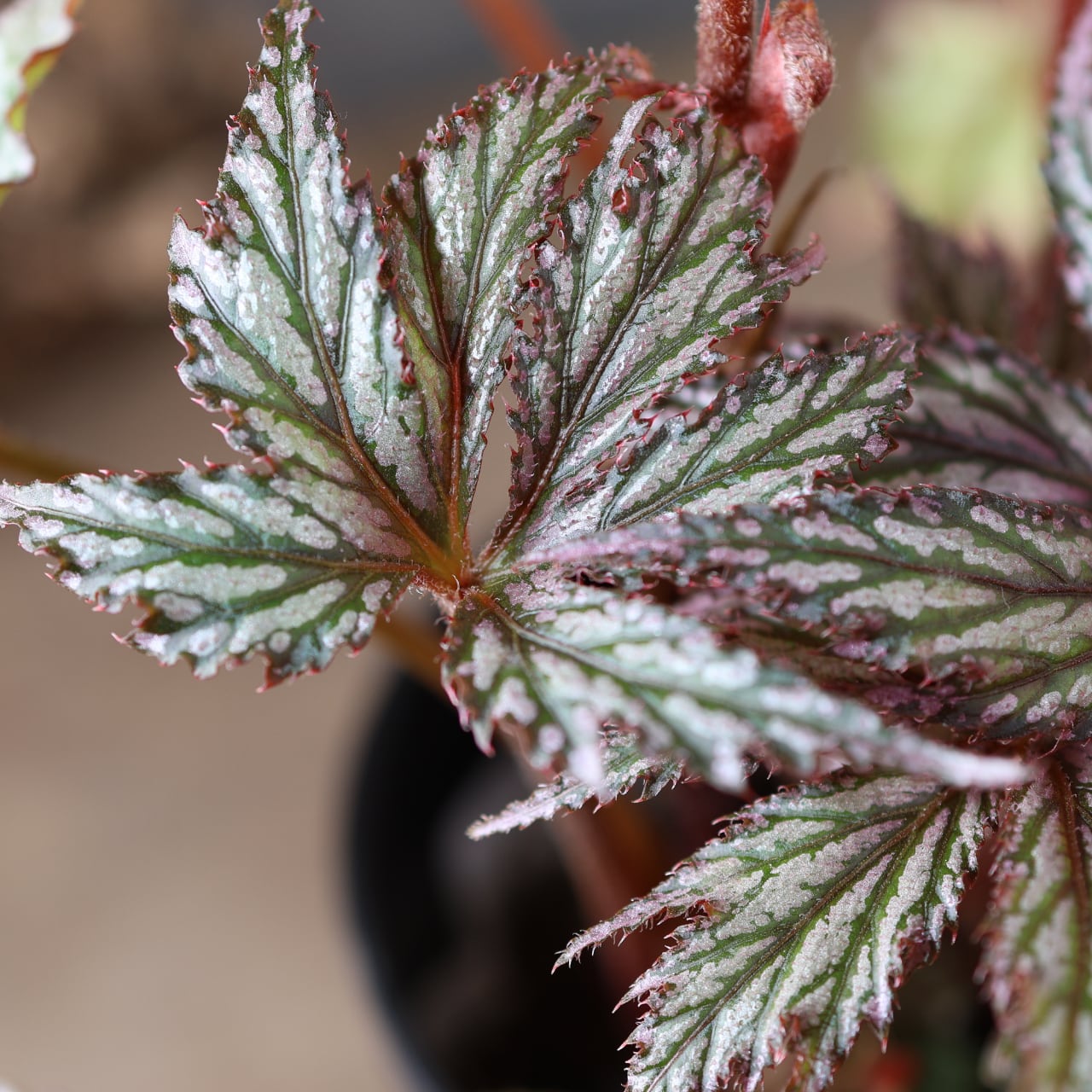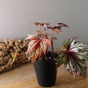 レックスベゴニア「ベニトチバ」は、日本的な名前が示す通り、紅を帯びた深みのある葉色と、千切れたように鋭く切れ込む葉形が印象的な品種です。