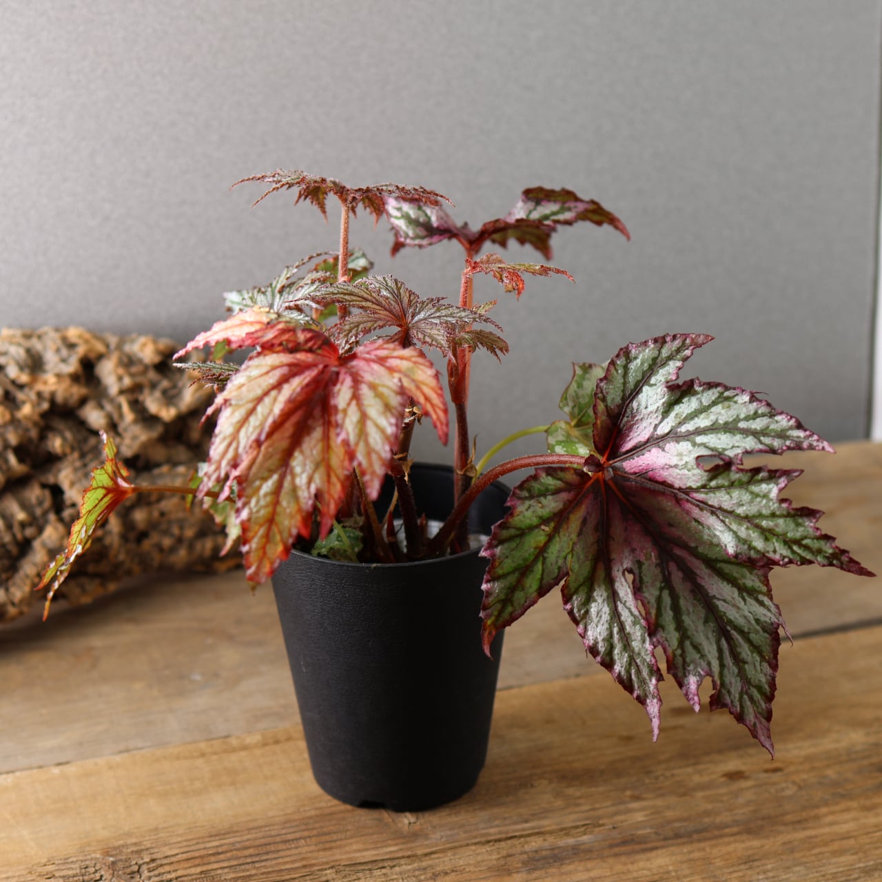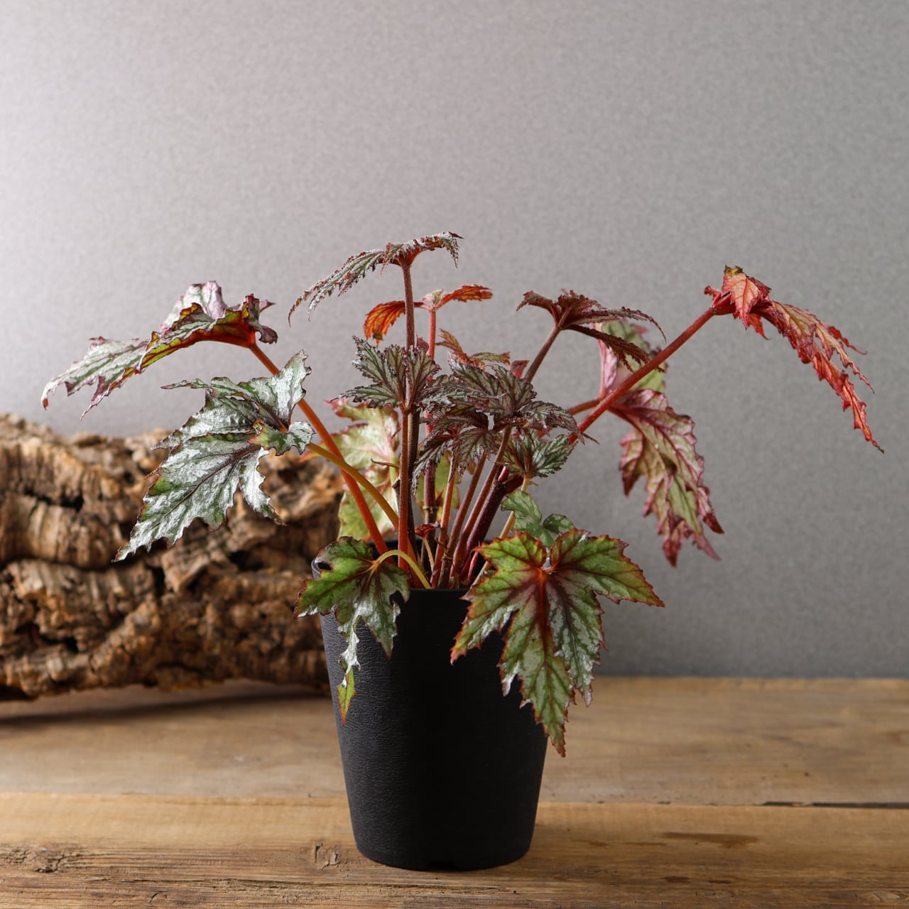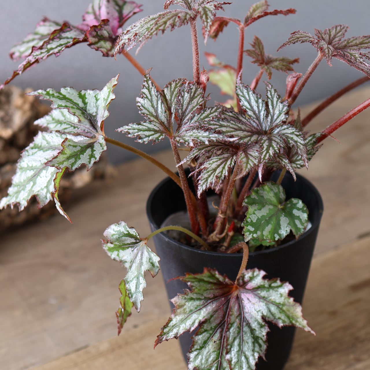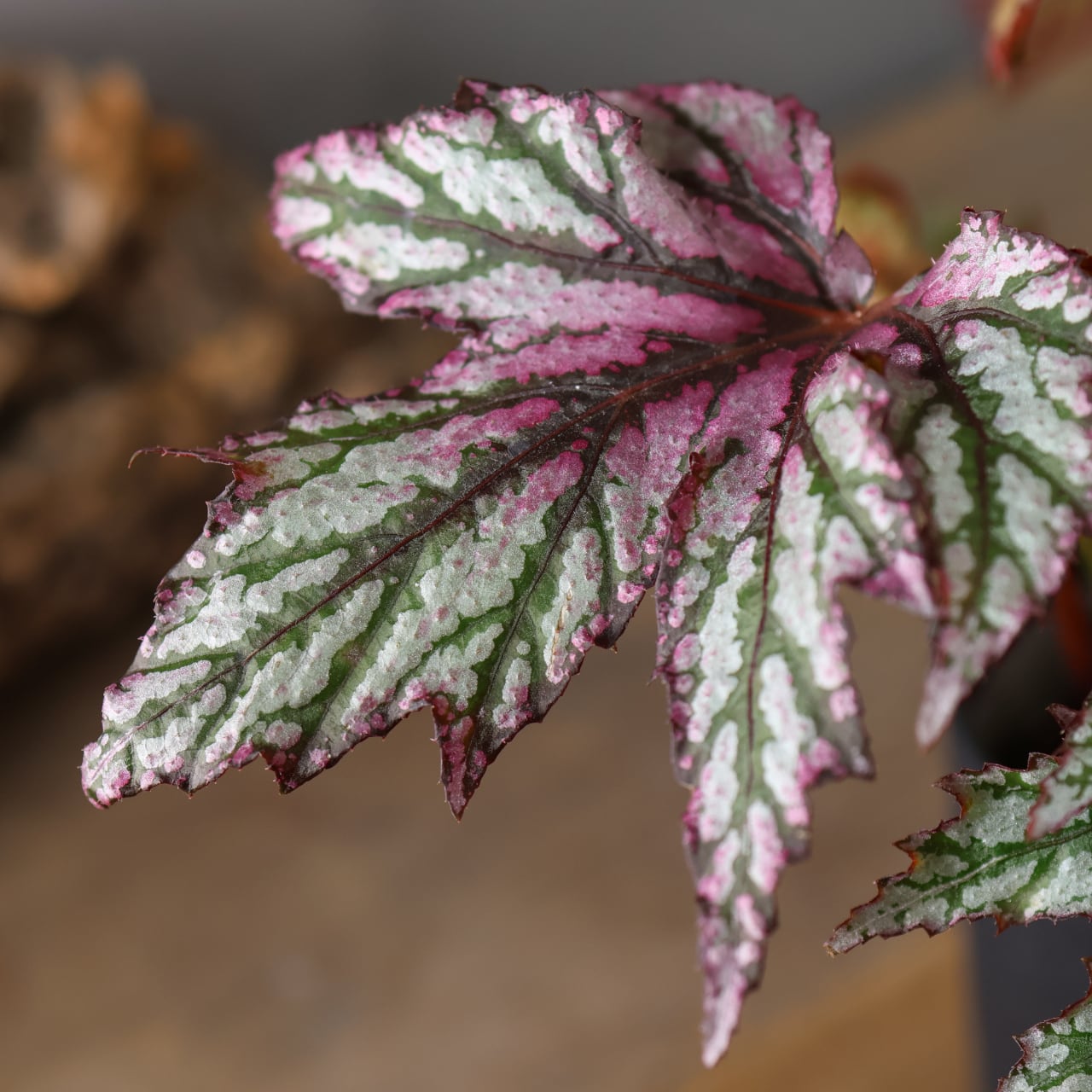 レックスベゴニア「ベニトチバ」は、日本的な名前が示す通り、紅を帯びた深みのある葉色と、千切れたように鋭く切れ込む葉形が印象的な品種です。
