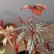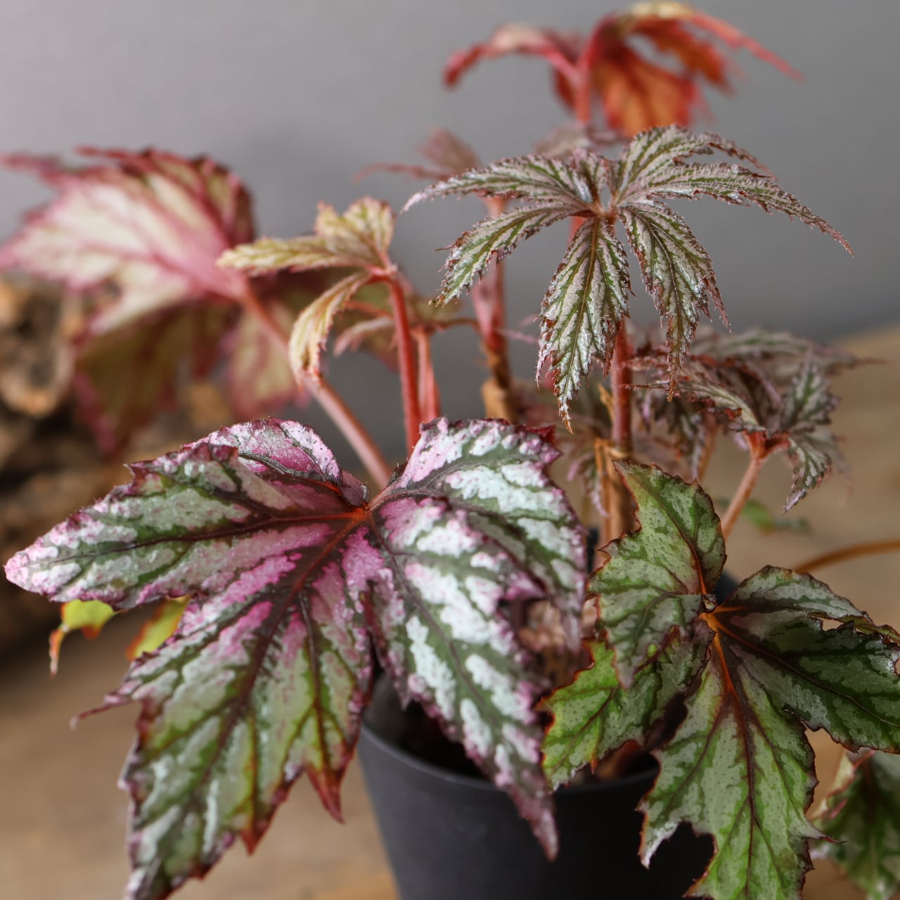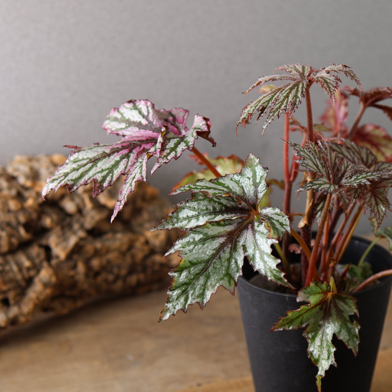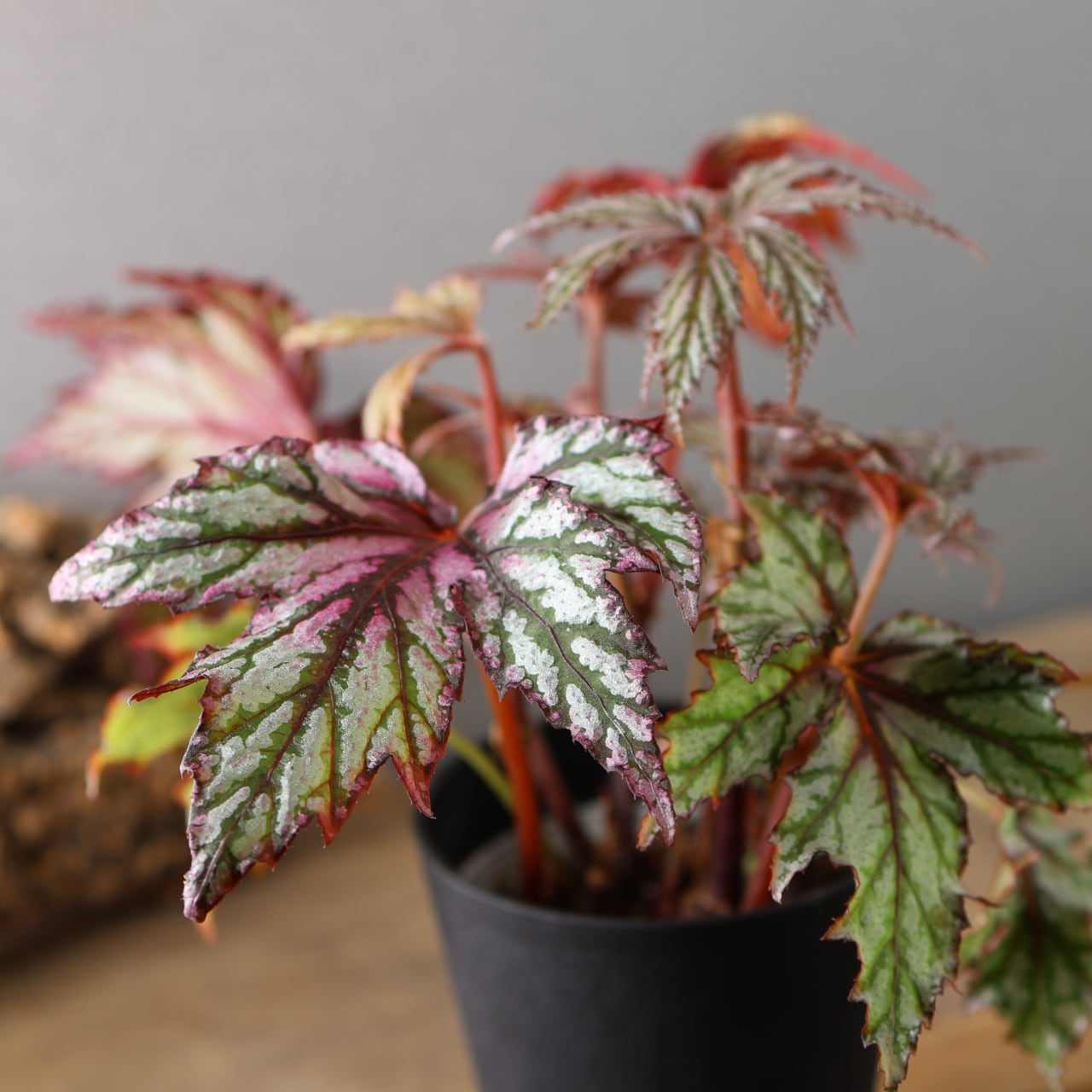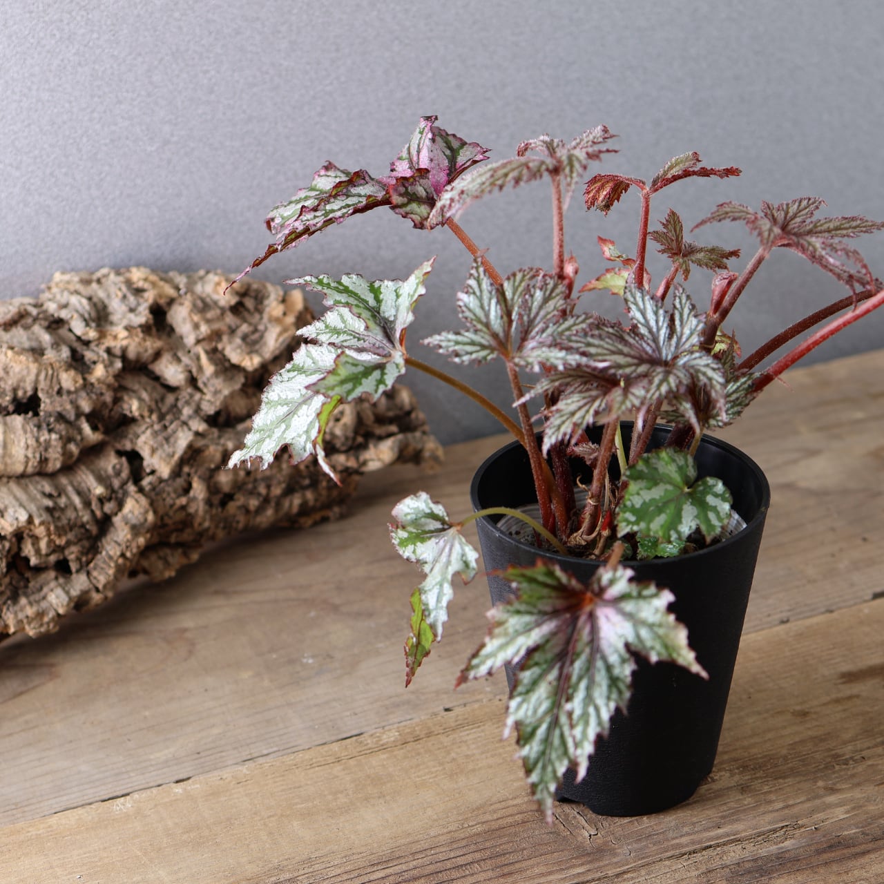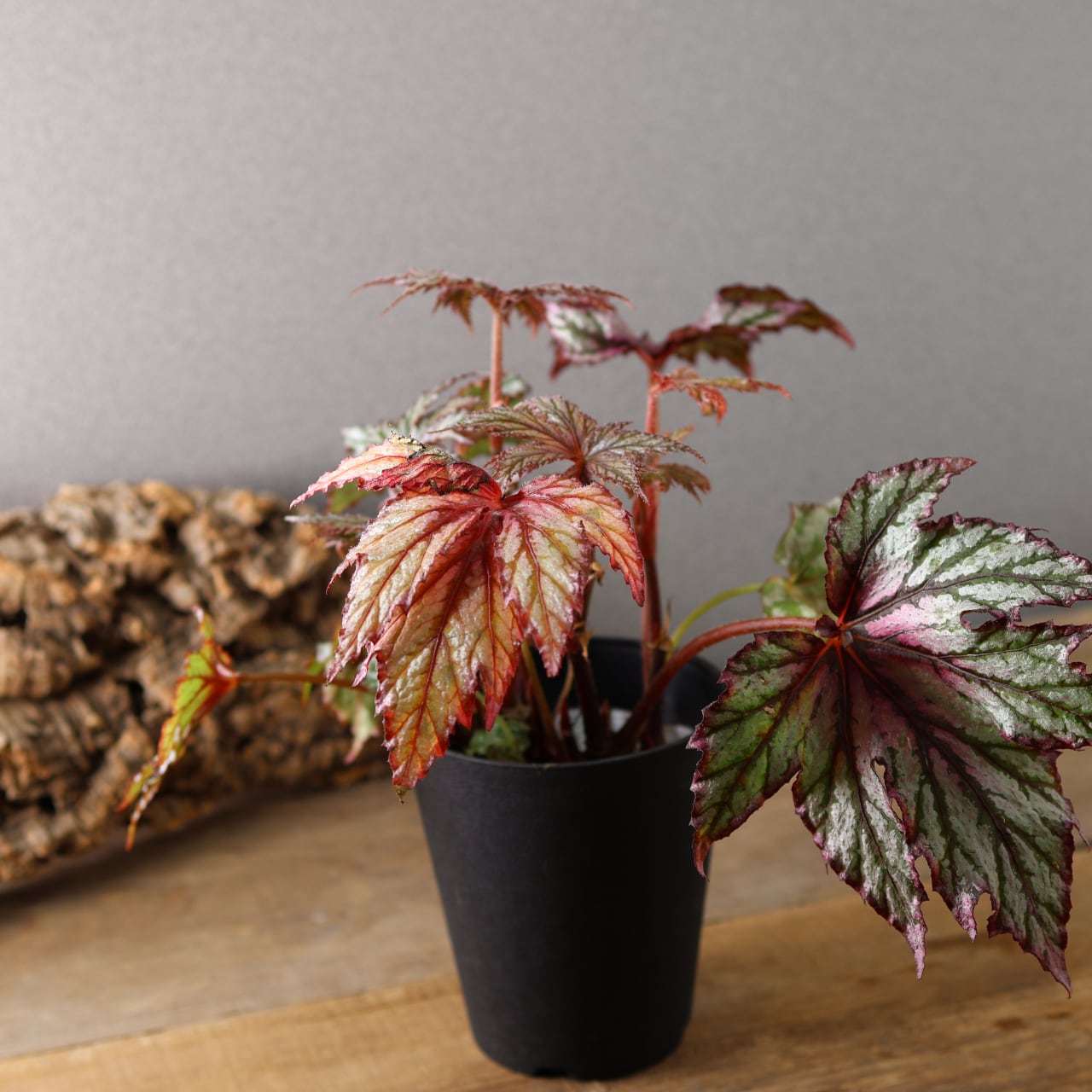 レックスベゴニア「ベニトチバ」は、日本的な名前が示す通り、紅を帯びた深みのある葉色と、千切れたように鋭く切れ込む葉形が印象的な品種です。