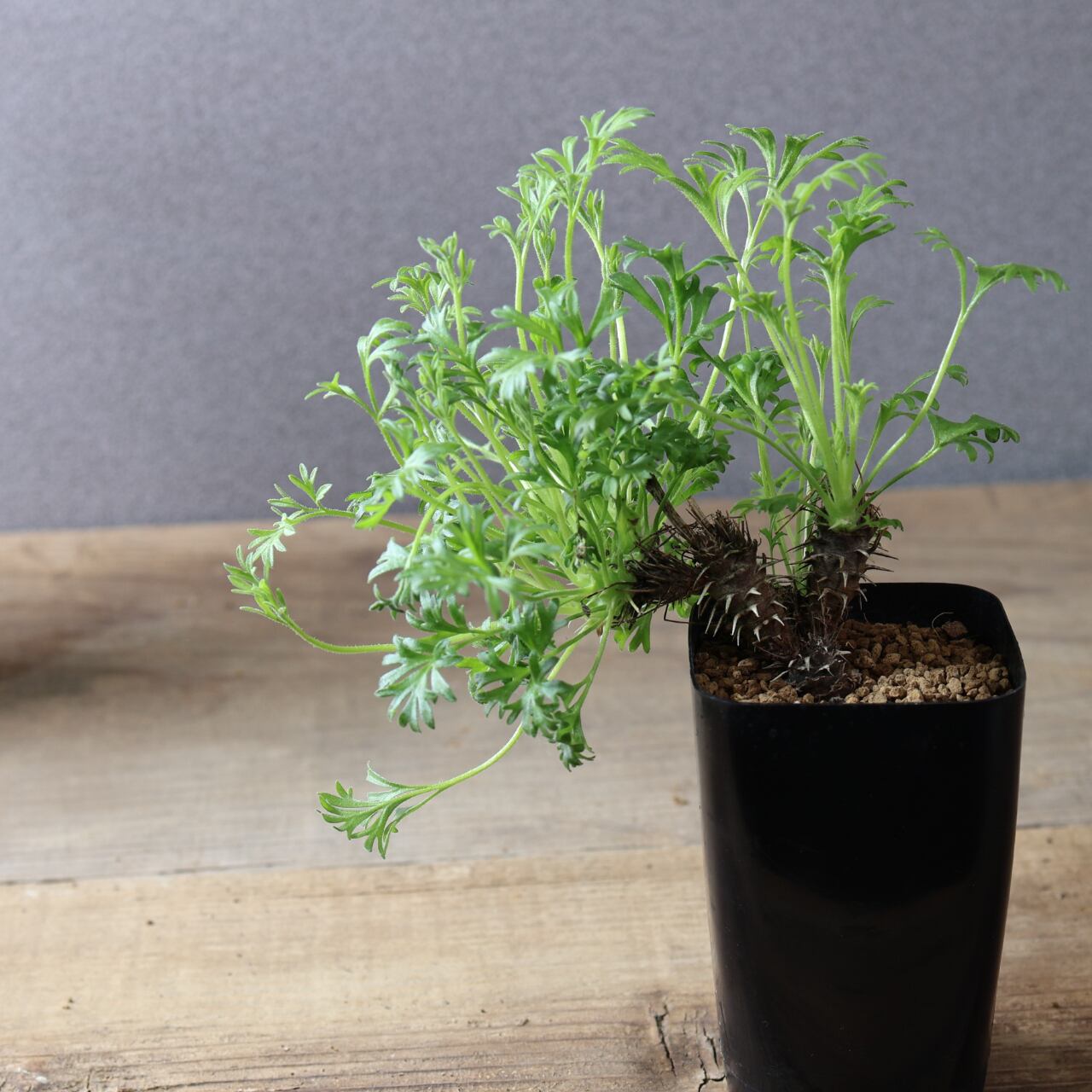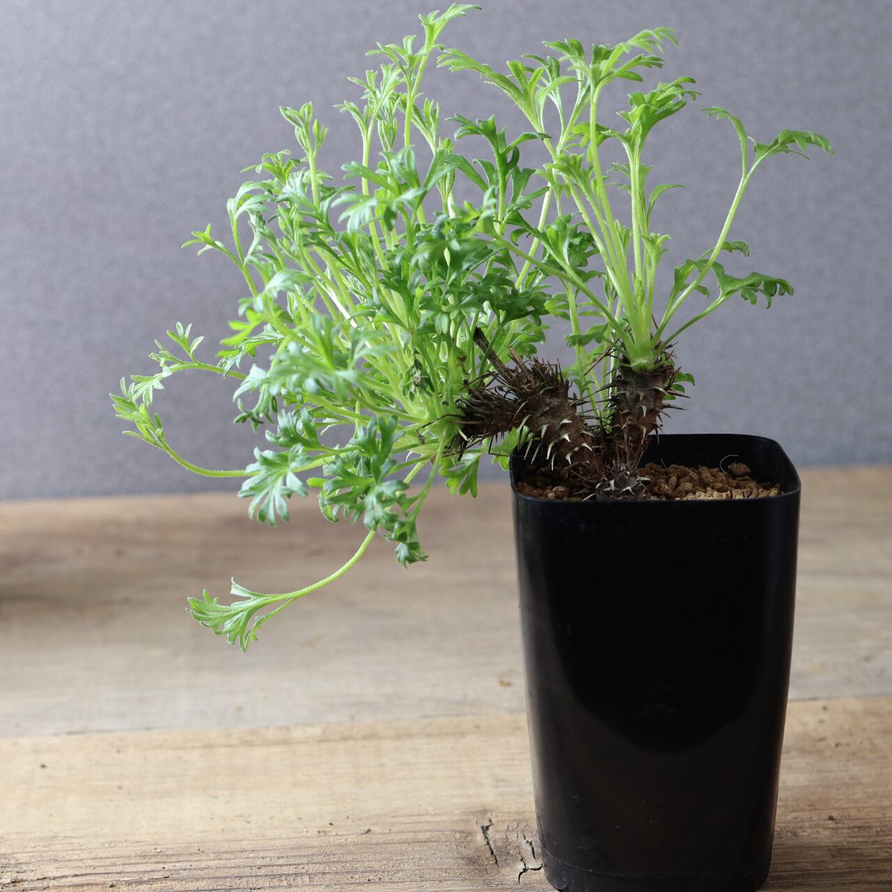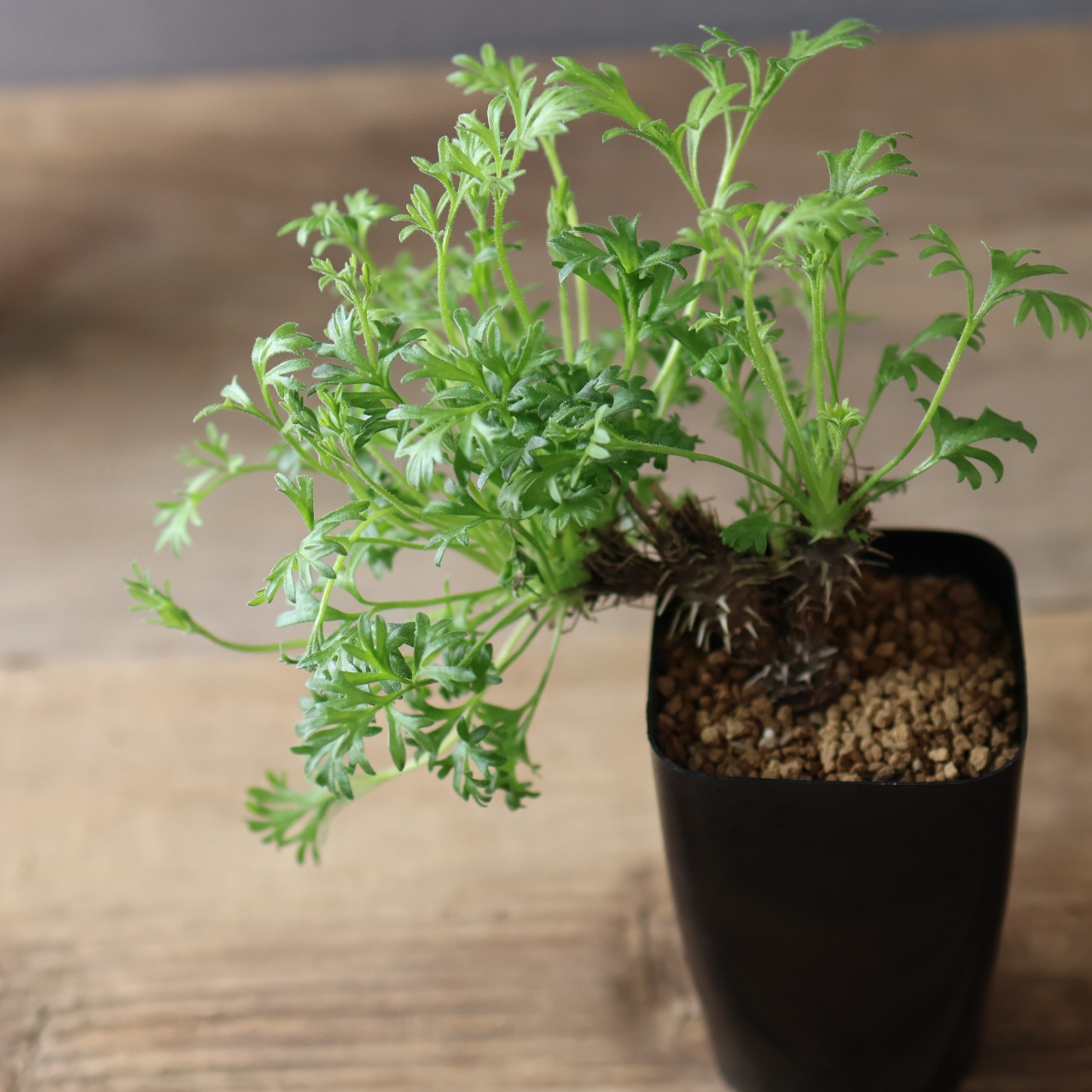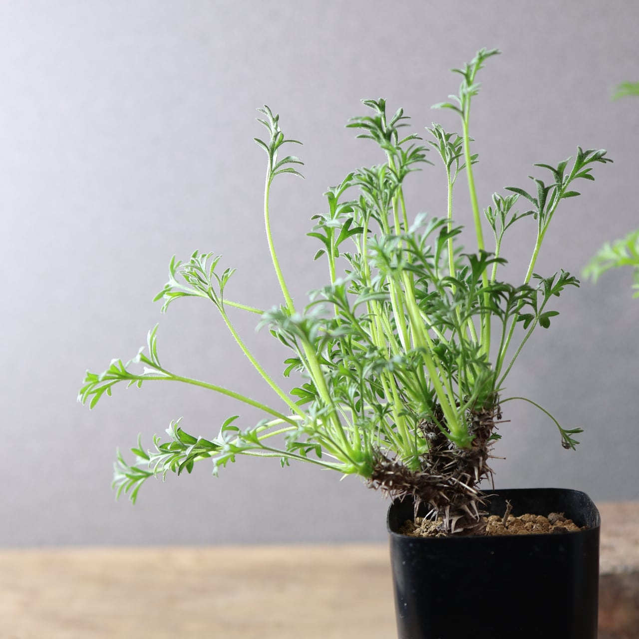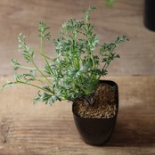 秋以降に出てくるフワフワとした羽毛のある細かい切れ込みの入る葉がとても美しく、ユニークな姿で目を惹きます。小さな花も咲かせ、花には香りもあります。成長がとても遅い品種です。
