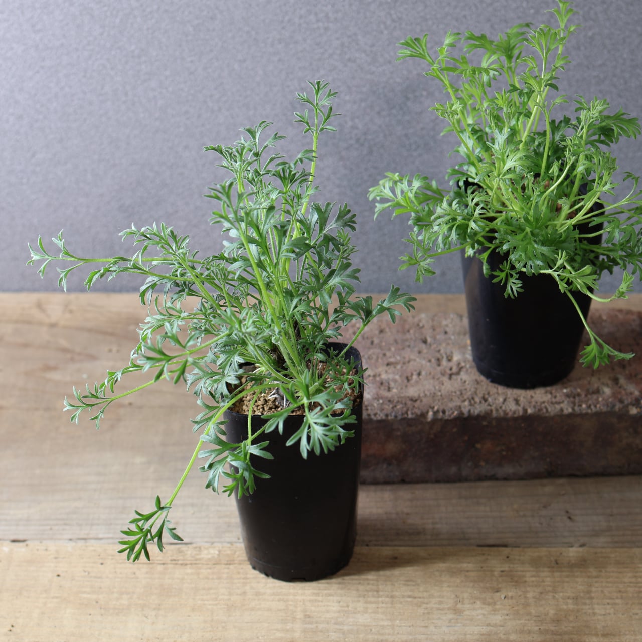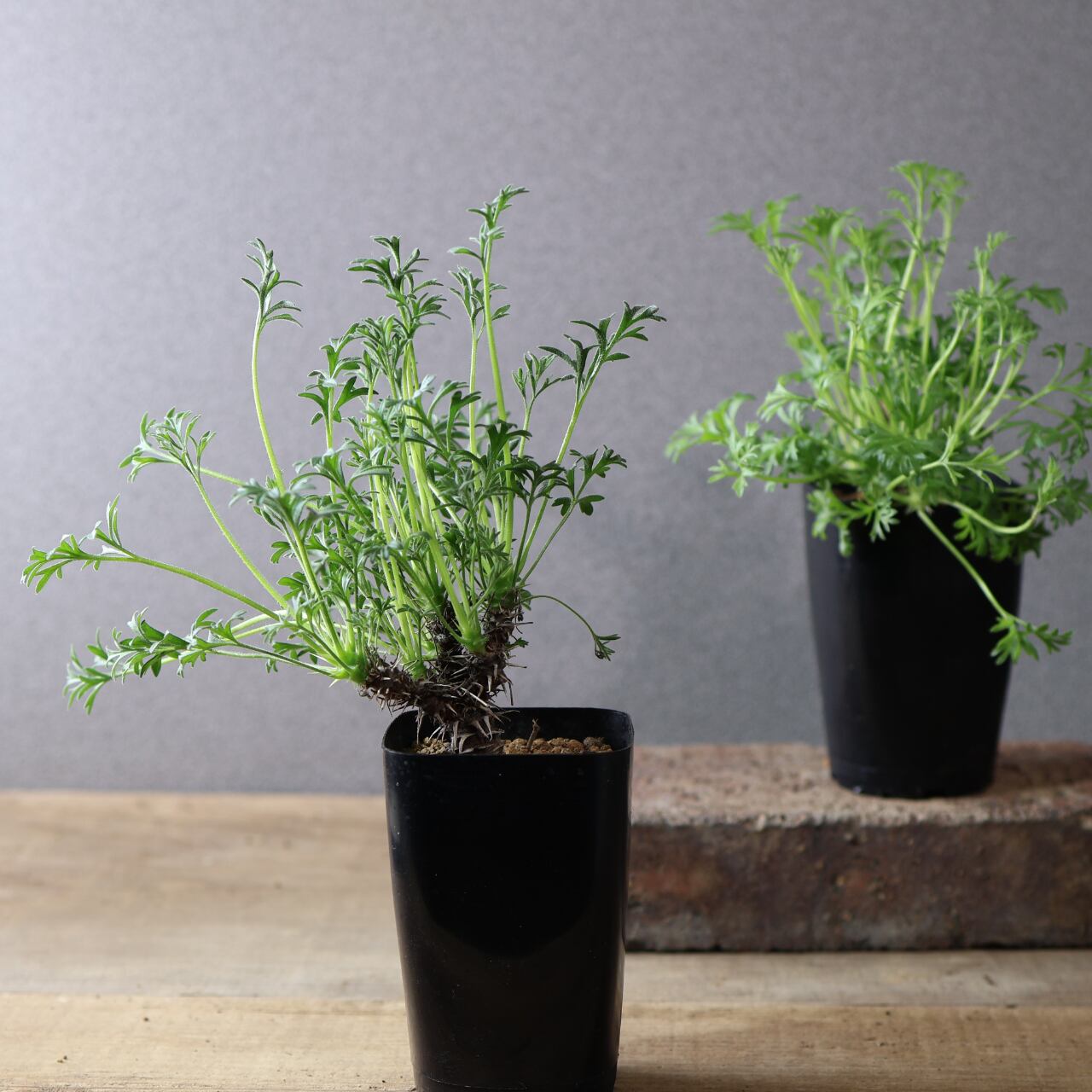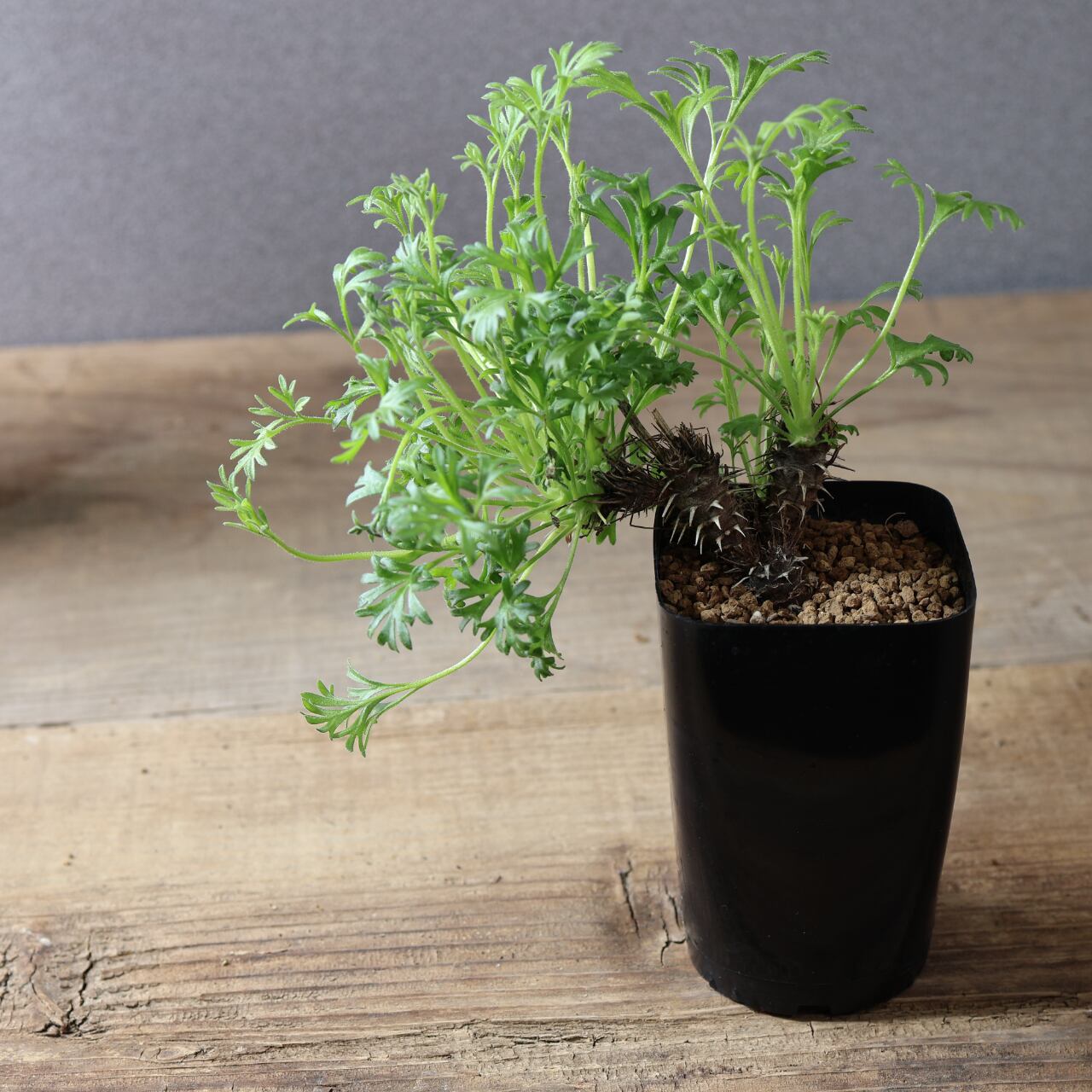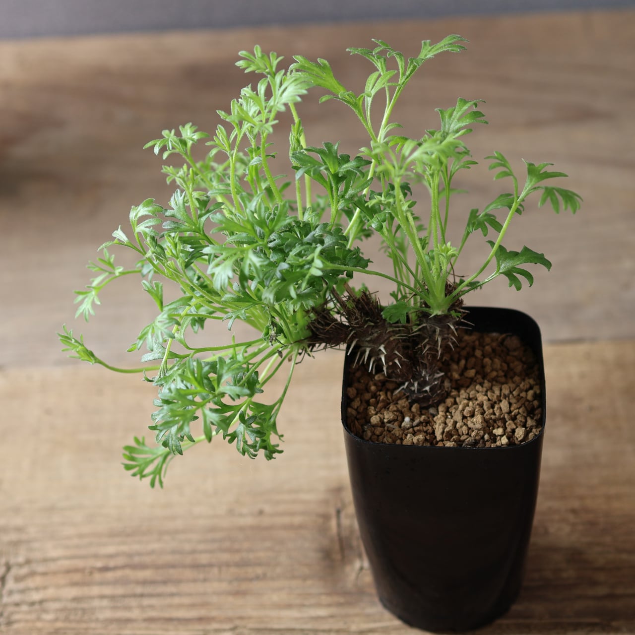秋以降に出てくるフワフワとした羽毛のある細かい切れ込みの入る葉がとても美しく、ユニークな姿で目を惹きます。小さな花も咲かせ、花には香りもあります。成長がとても遅い品種です。