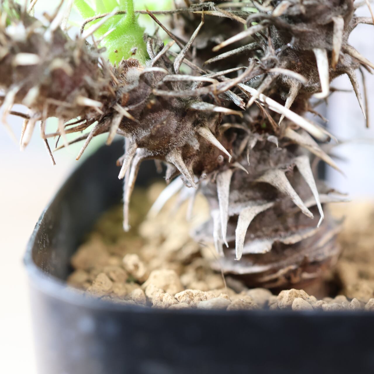 植え替えは8~11月ごろが適期です土は水はけの良いサボテン・多肉植物の専用用土を使います。深めの鉢を用意し、塊根部分の幹肌が鑑賞できるよう、根元数センチを用土に埋めしっかりと固定します。植え付け時に緩効性肥料を少量土に混ぜます。