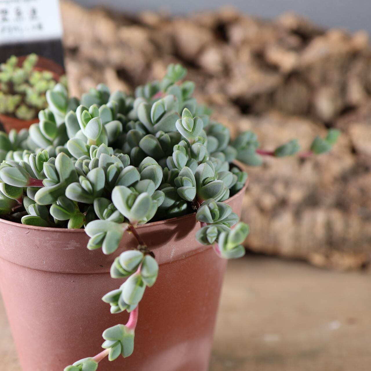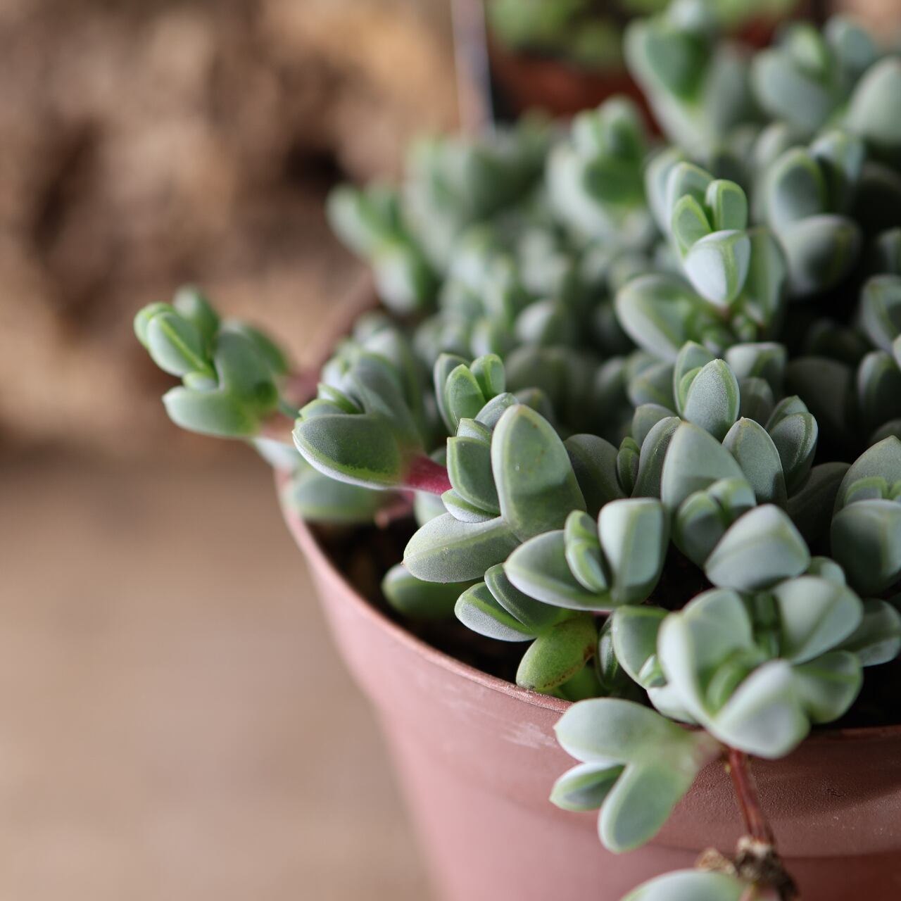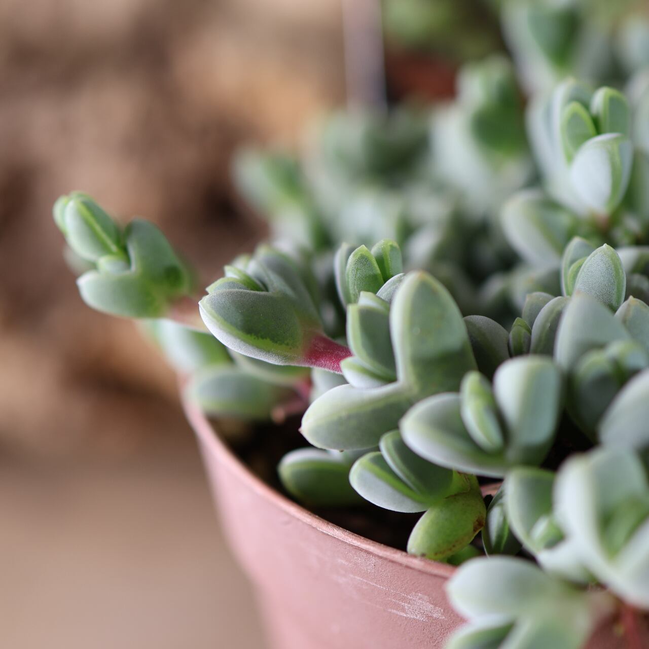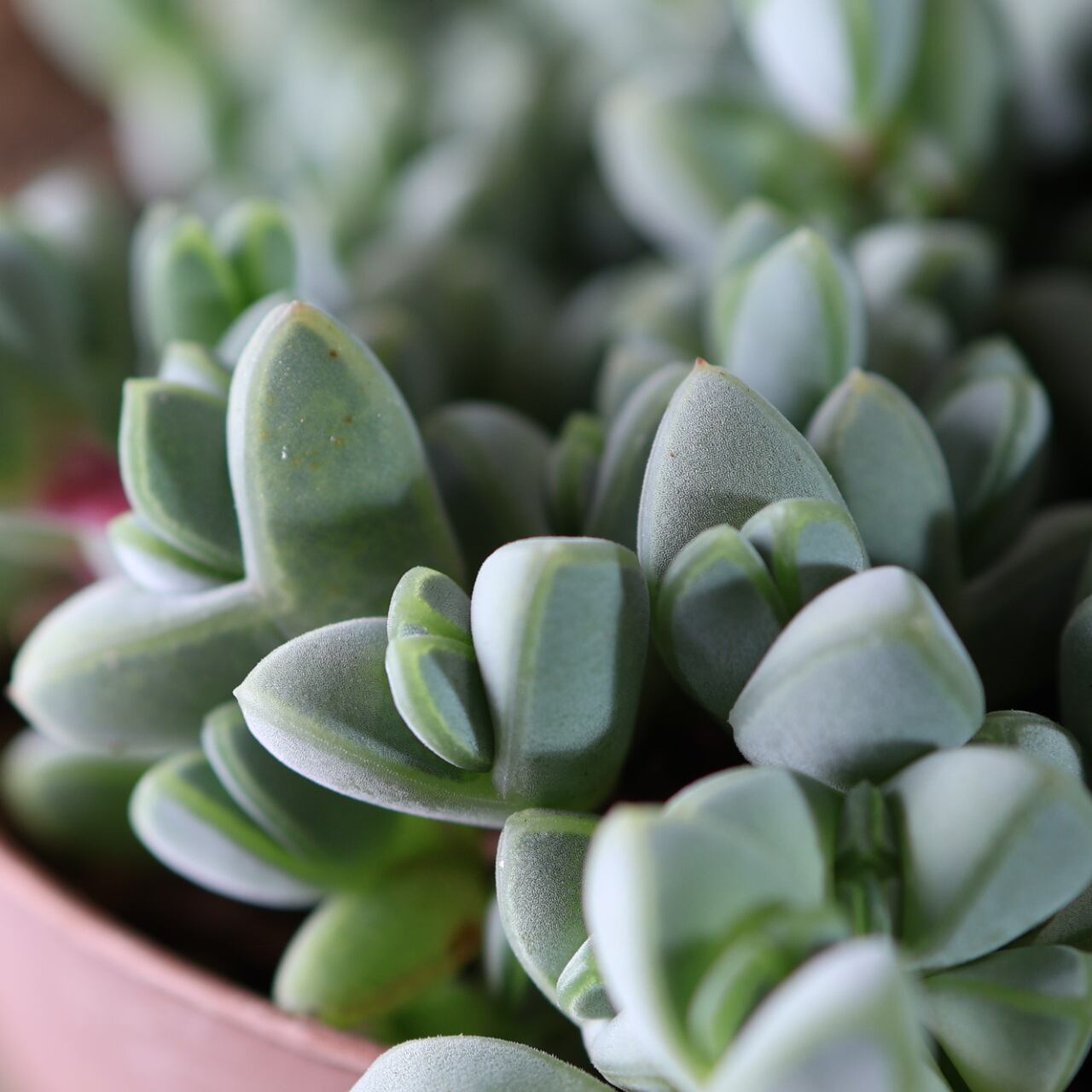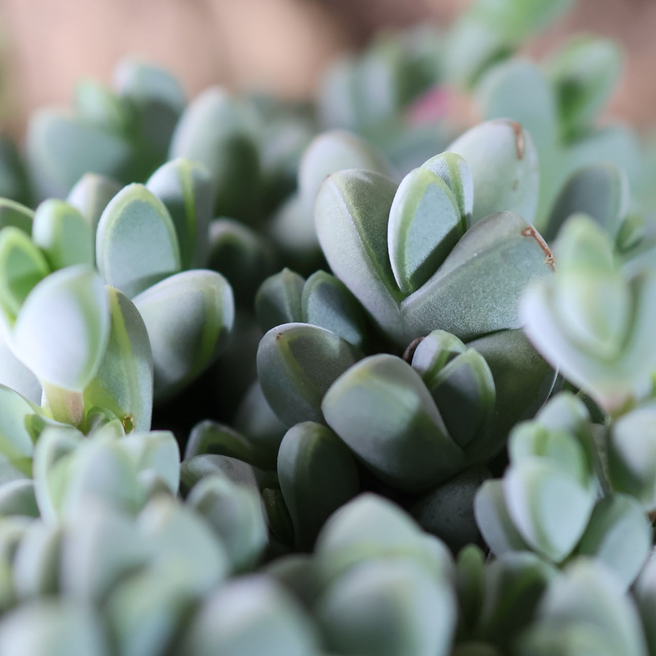 丸みのある葉が茎に沿って規則正しく並び、光の当たり方で青緑〜やや紫がかった色味に変化します。