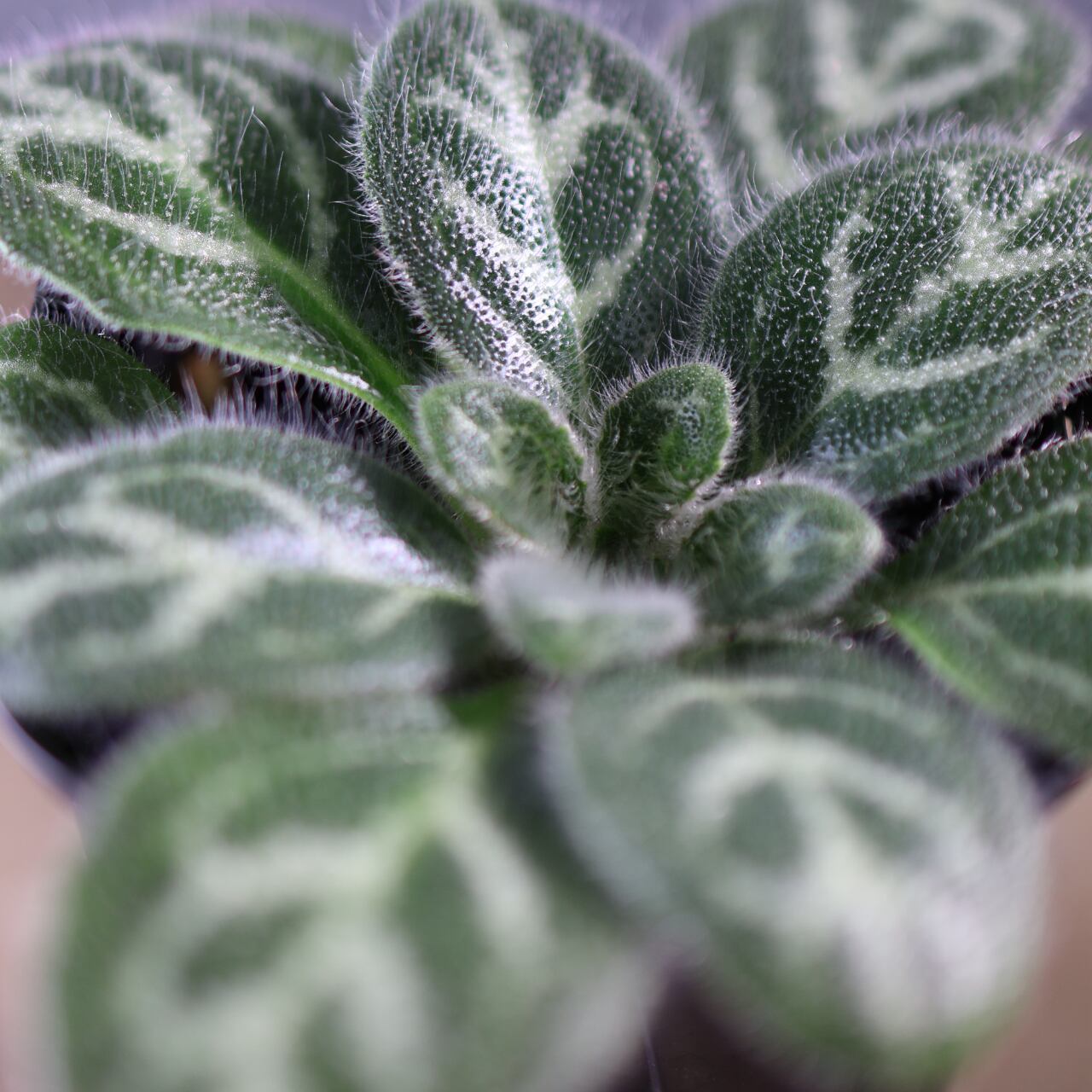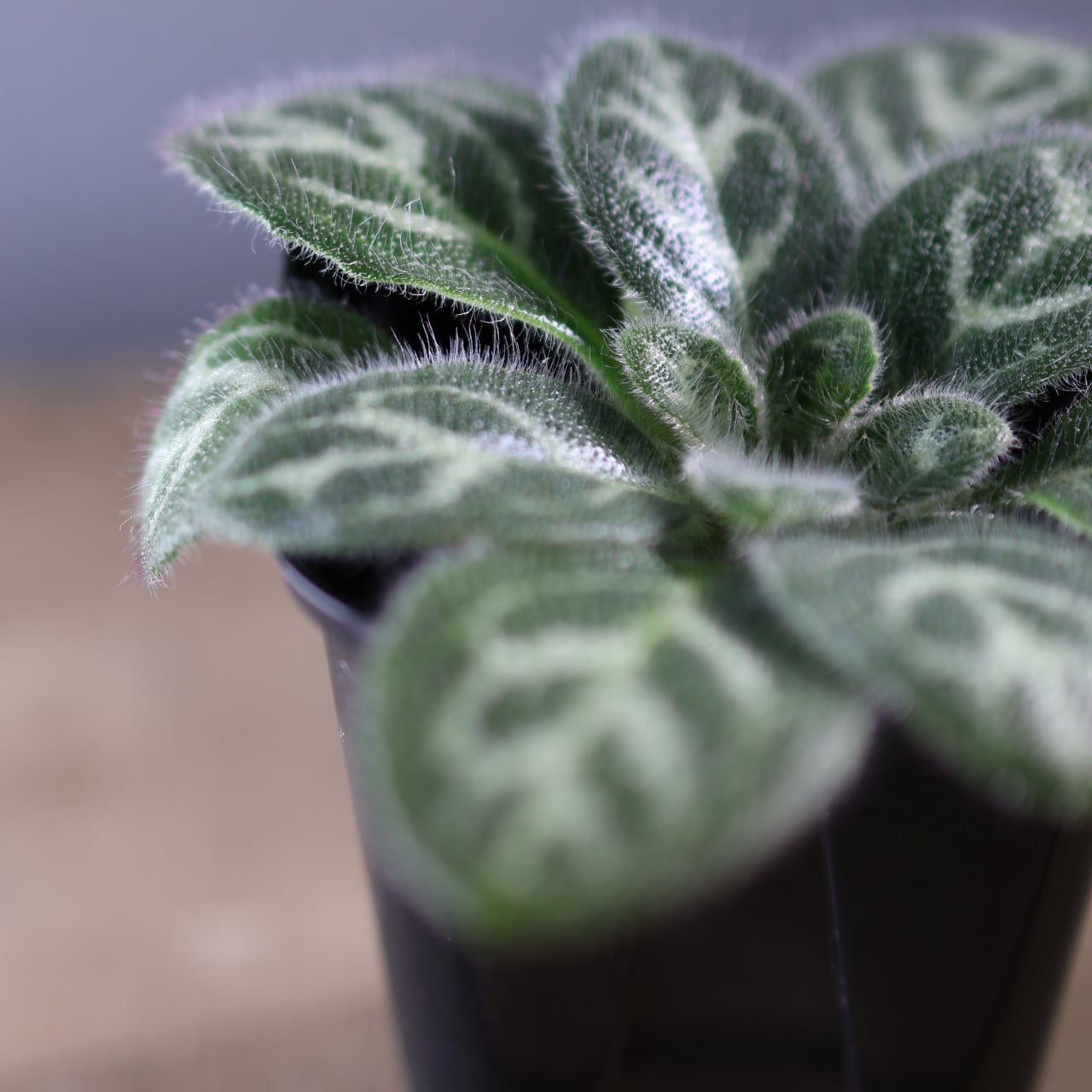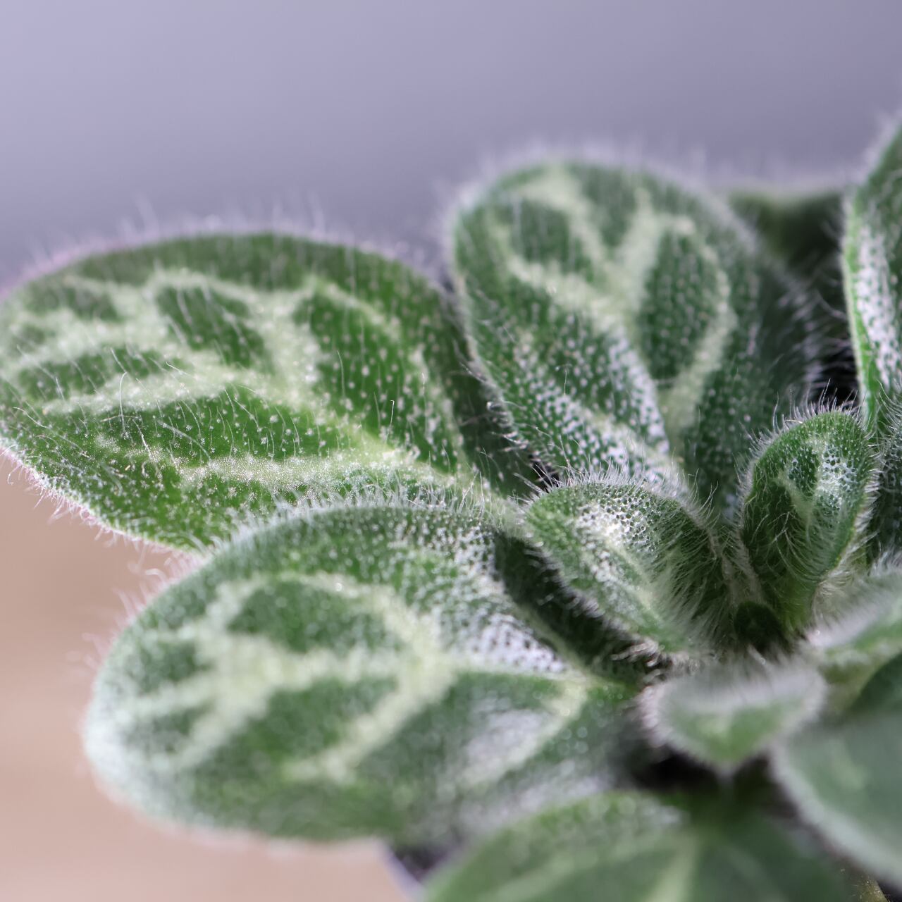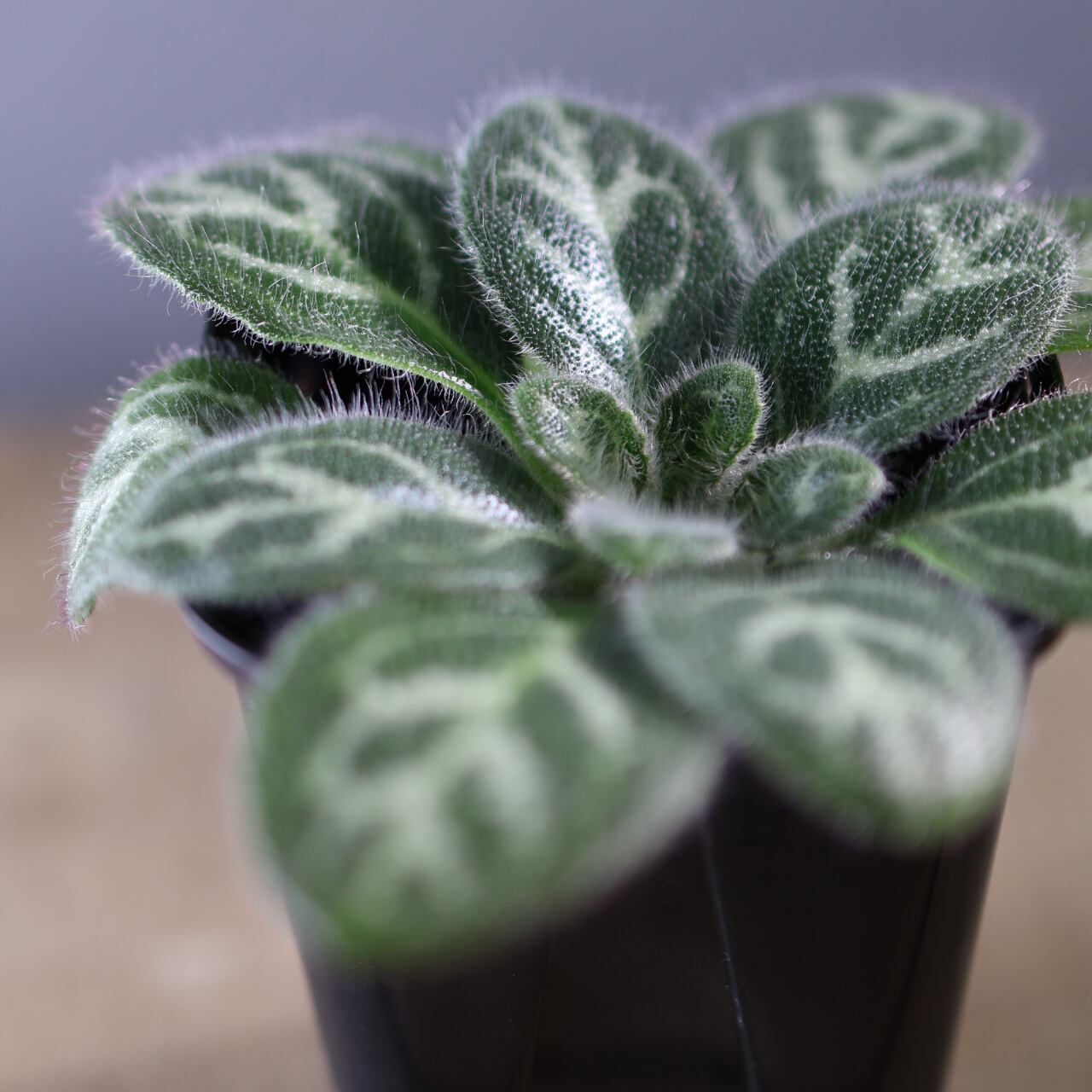 葉はビロード質で細かな毛に覆われ、立体感のあるロゼットを形成。