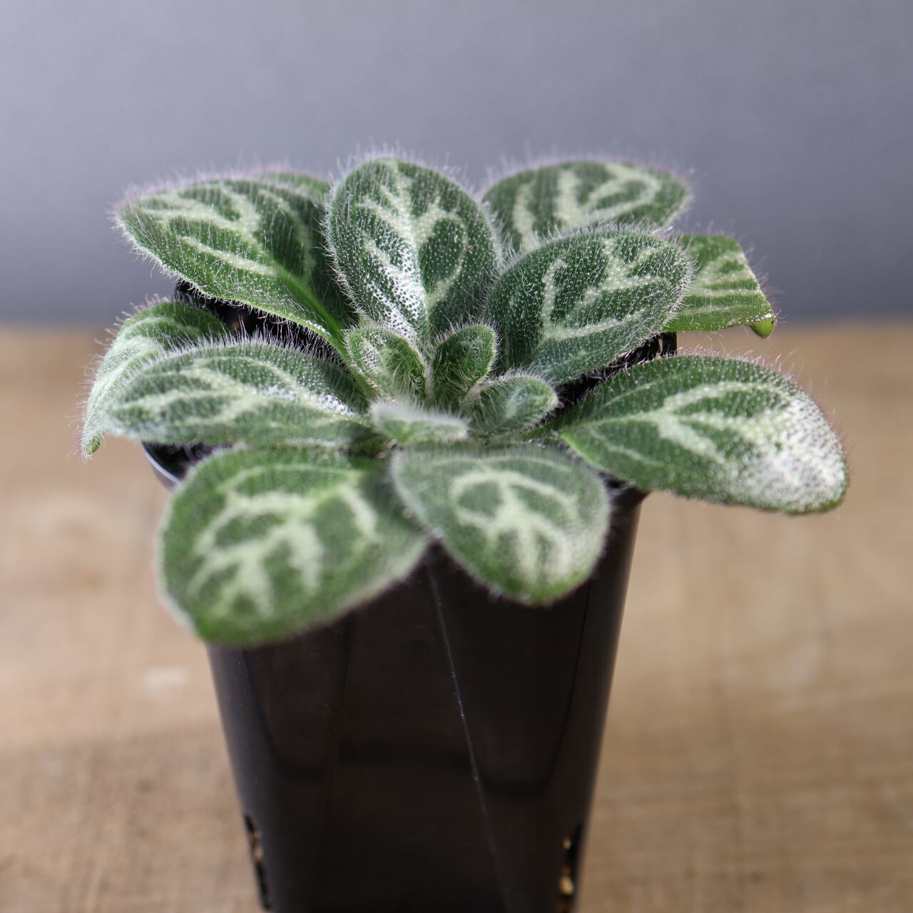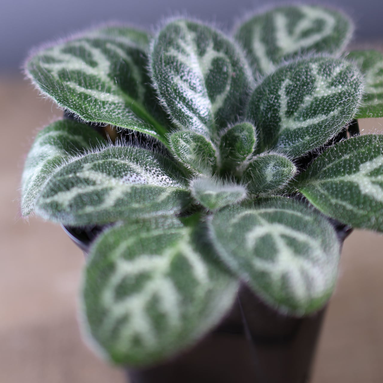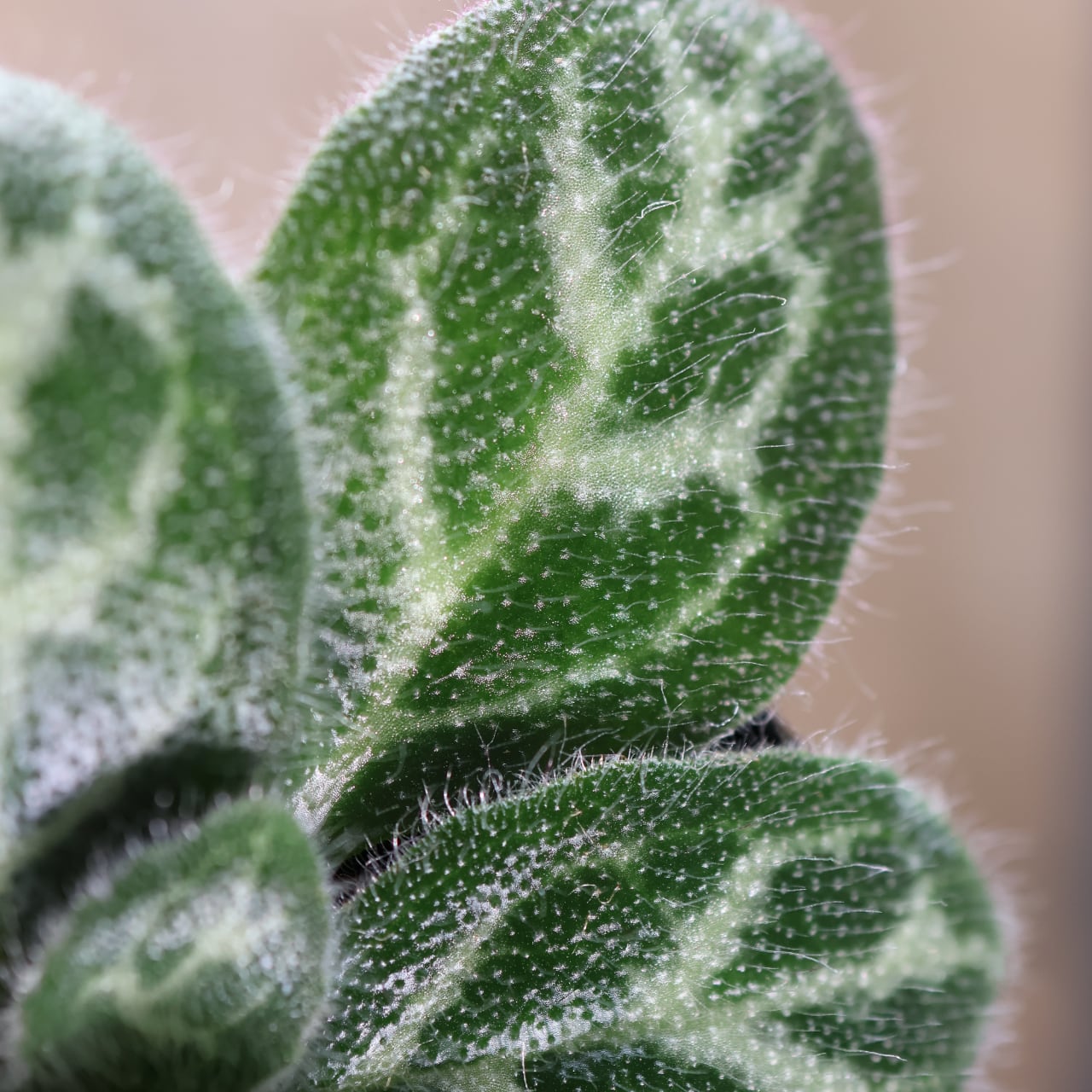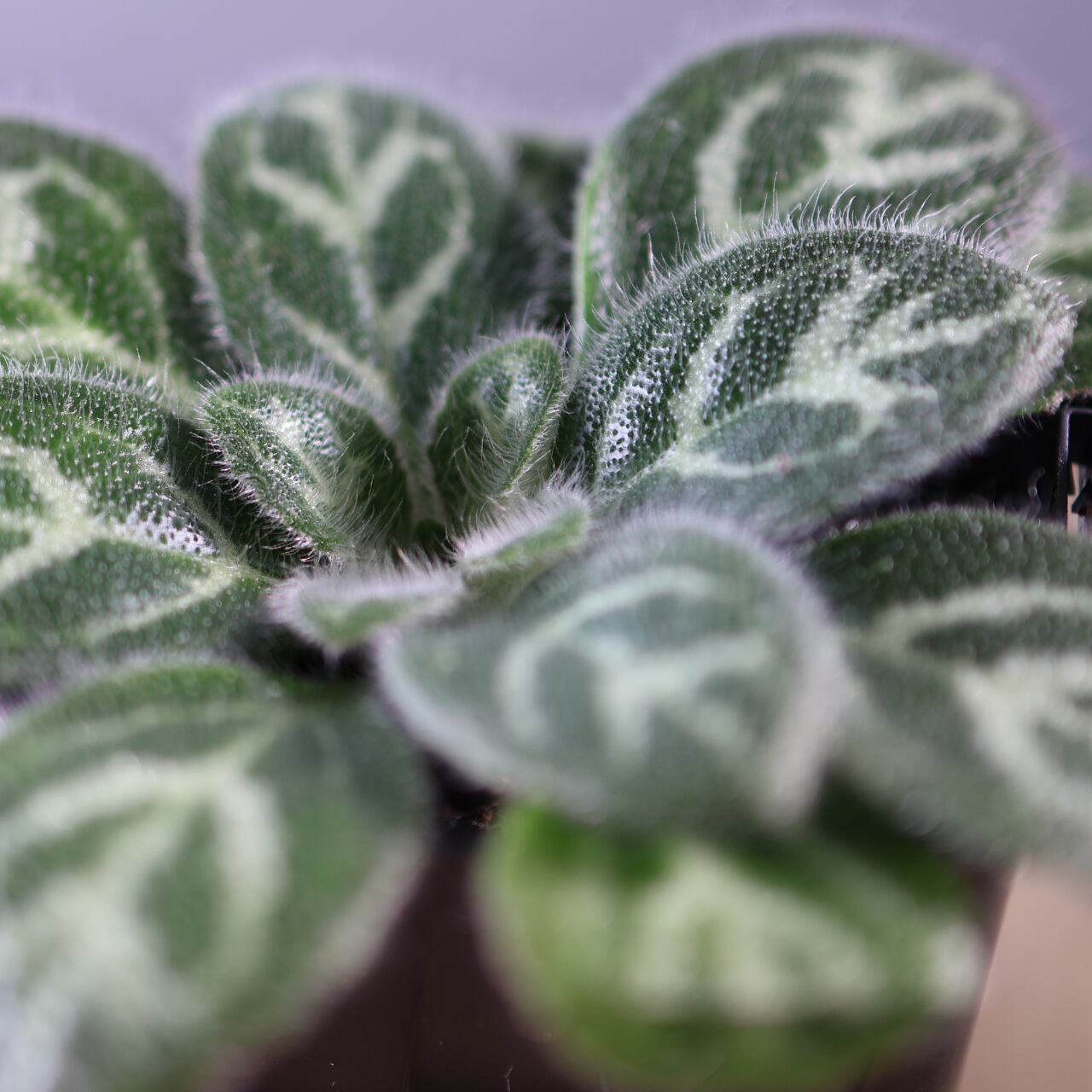 葉はビロード質で細かな毛に覆われ、立体感のあるロゼットを形成。