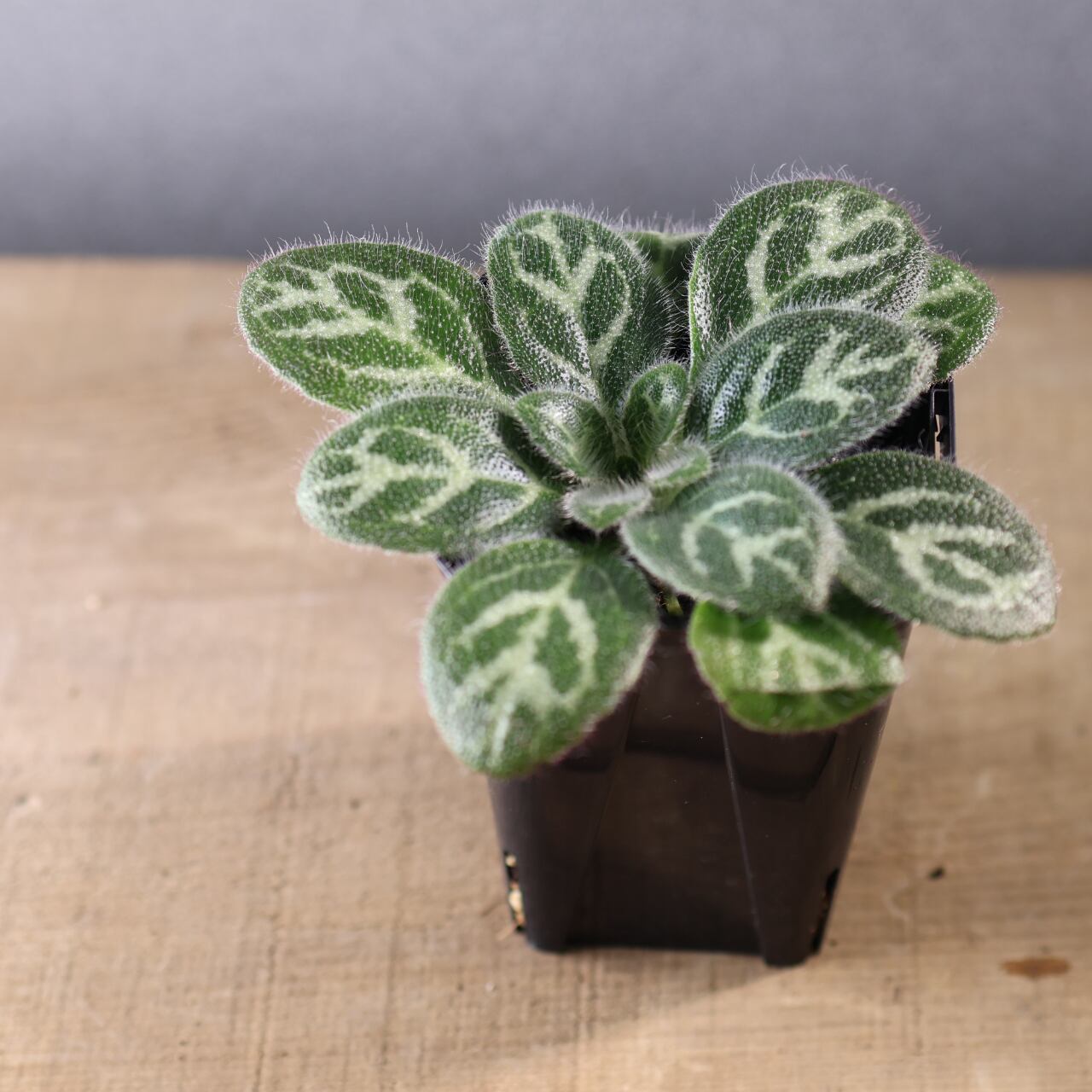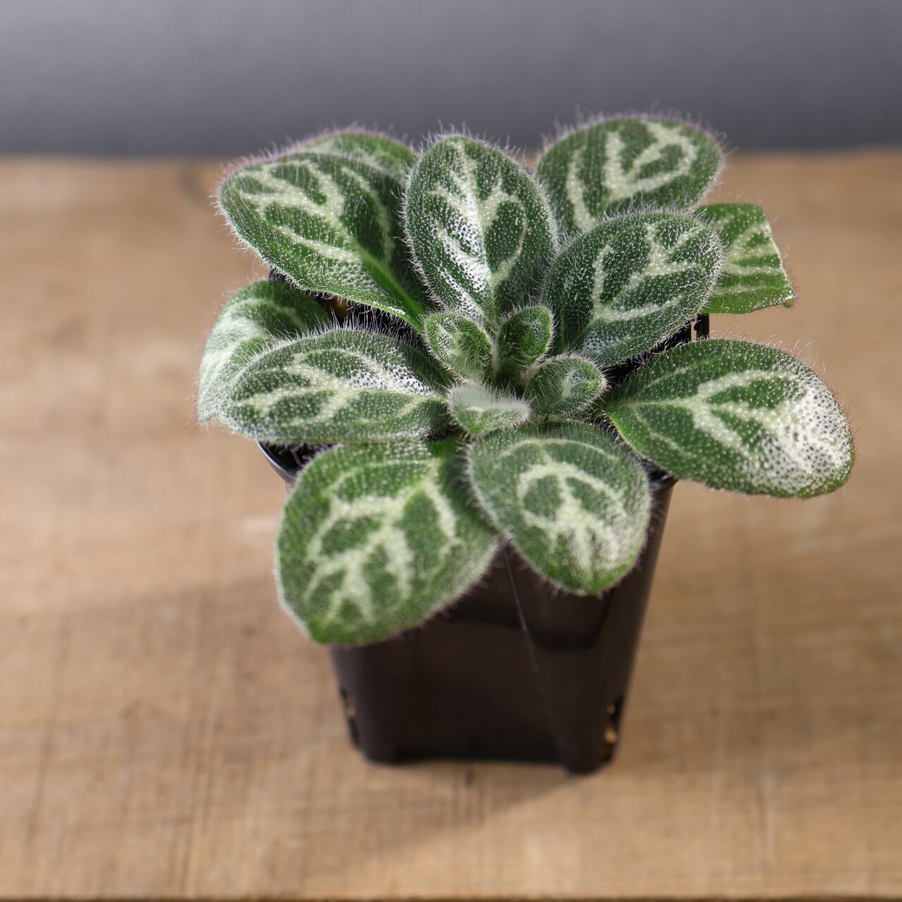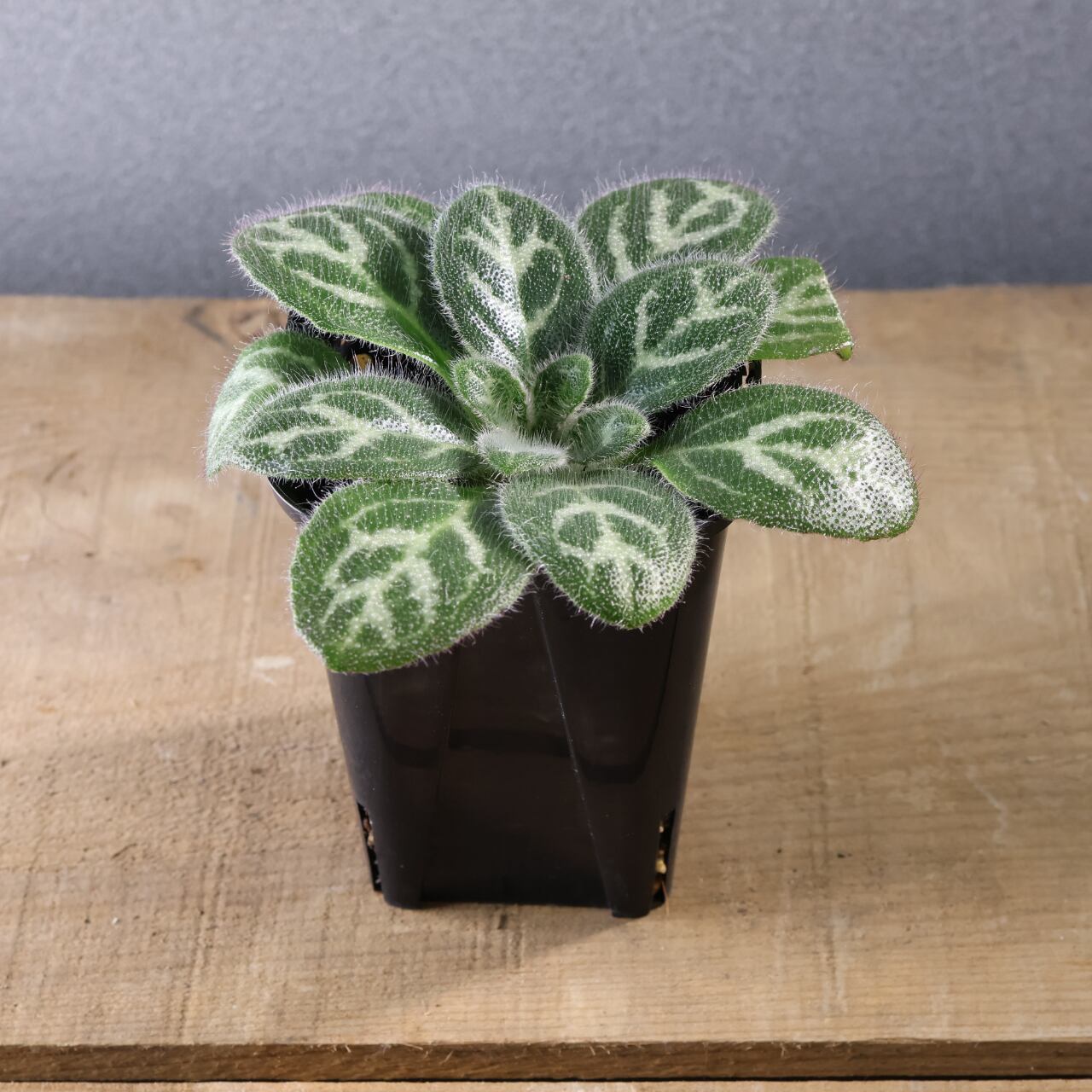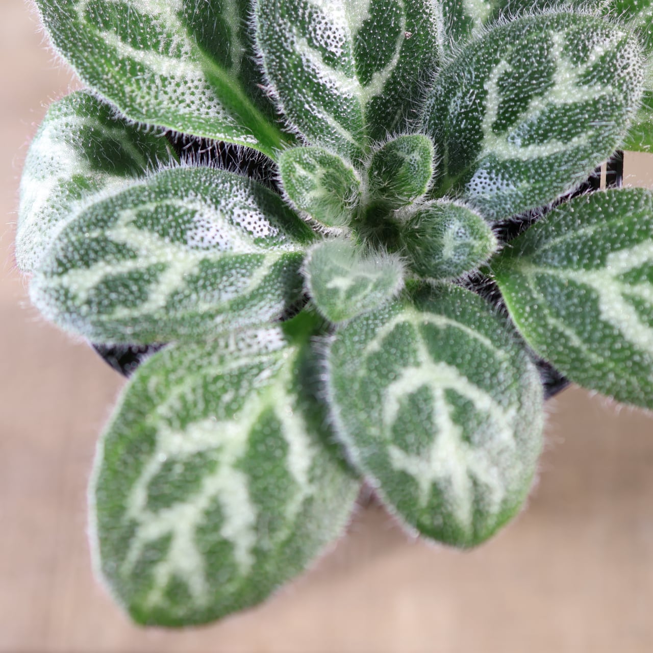 葉はビロード質で細かな毛に覆われ、立体感のあるロゼットを形成。
