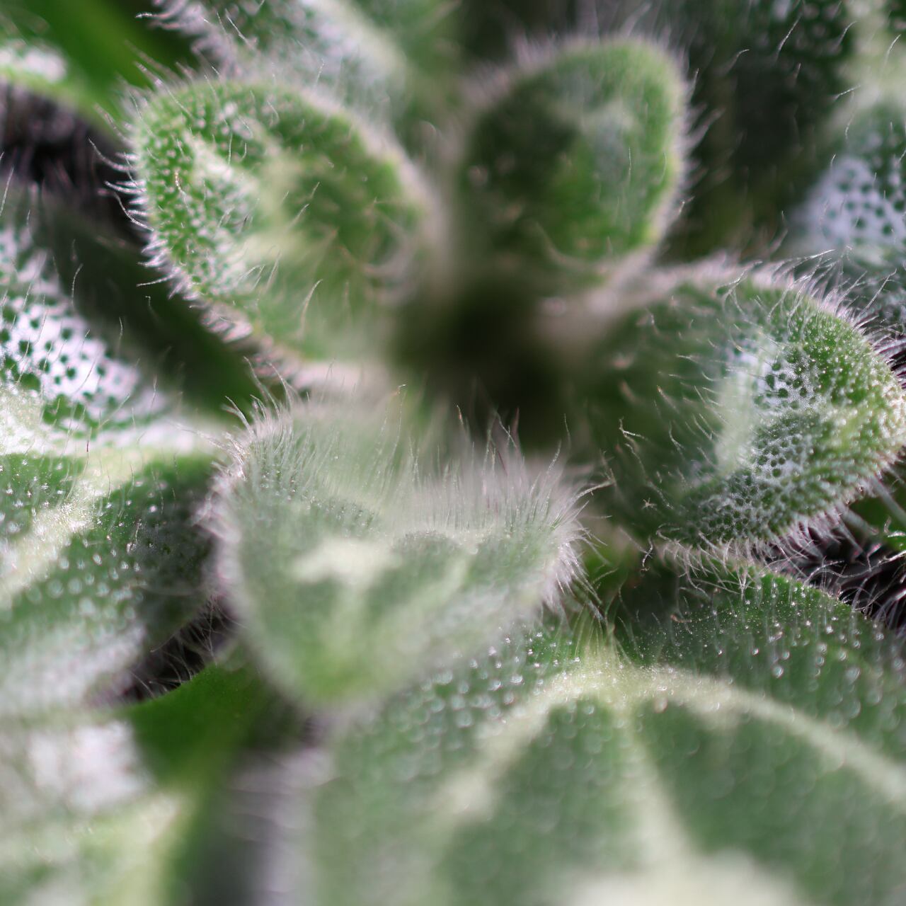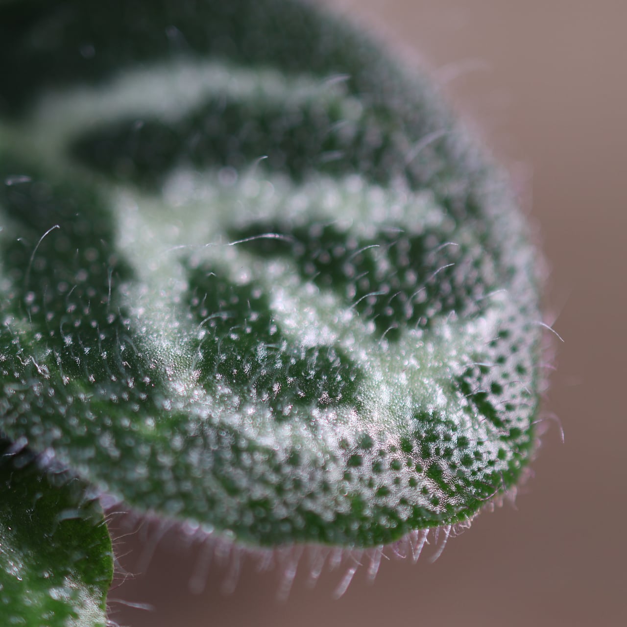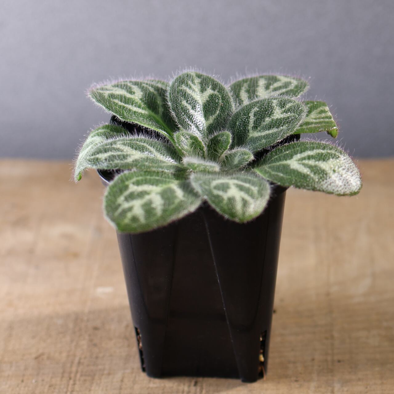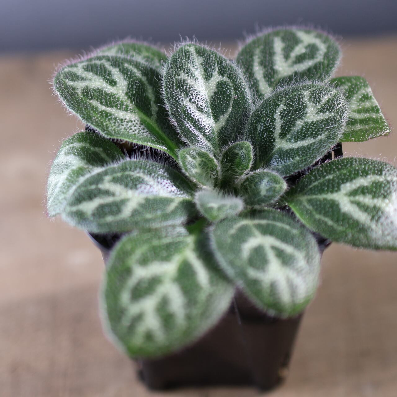 葉はビロード質で細かな毛に覆われ、立体感のあるロゼットを形成。