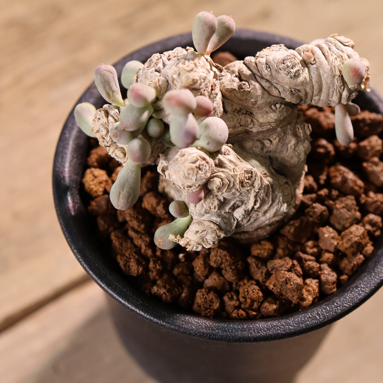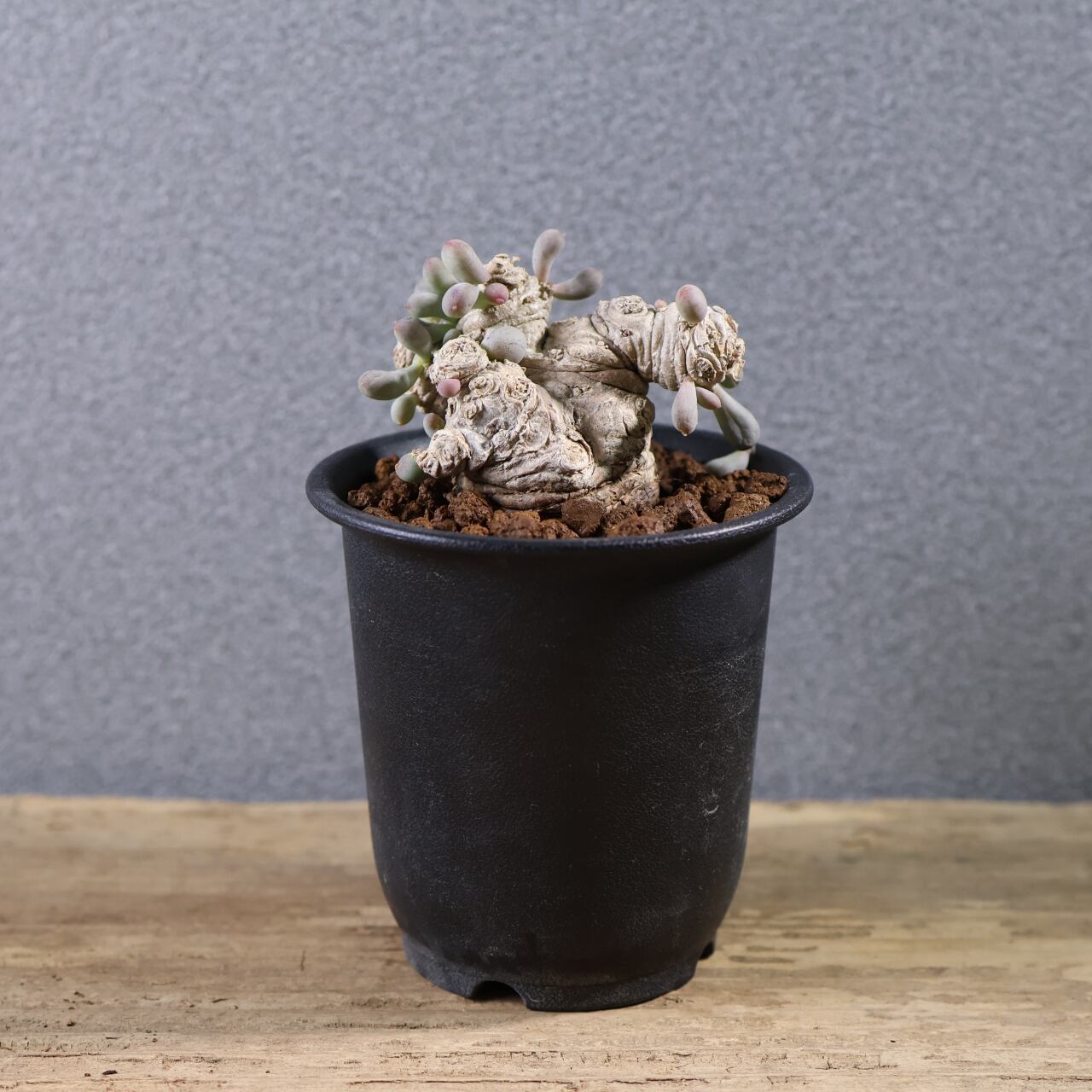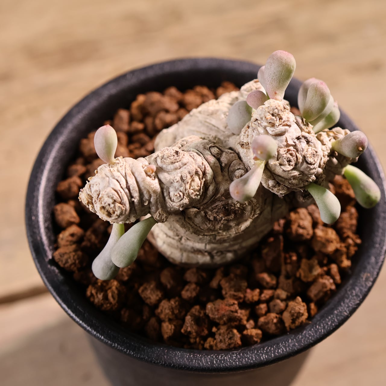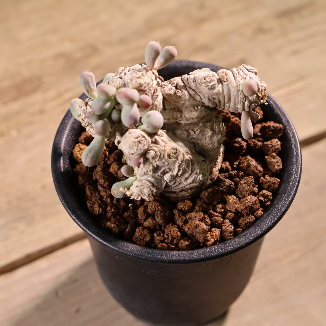 ぷりぷりとした葉をもつ太い塊茎から短い枝を伸ばす小型のコーデックスプランツで、大きく育っても直径20cmほどにしか育たない小型種です。