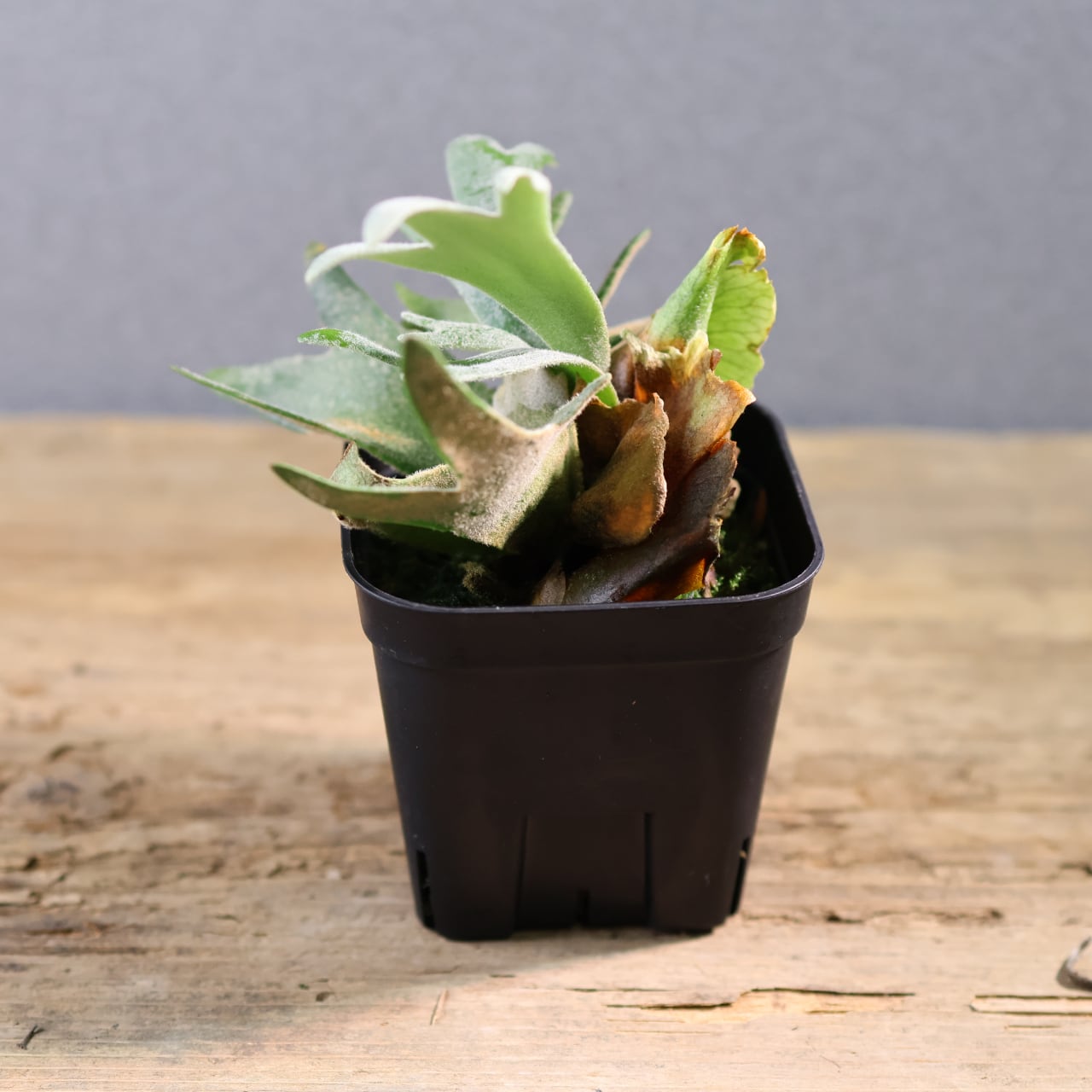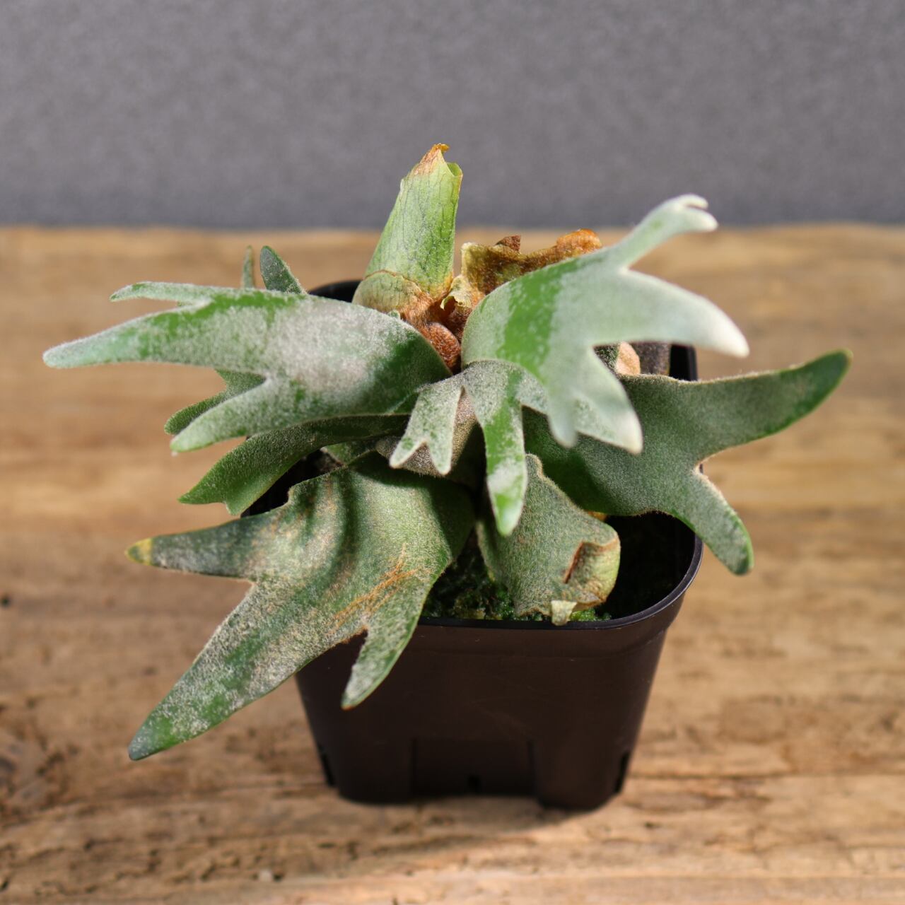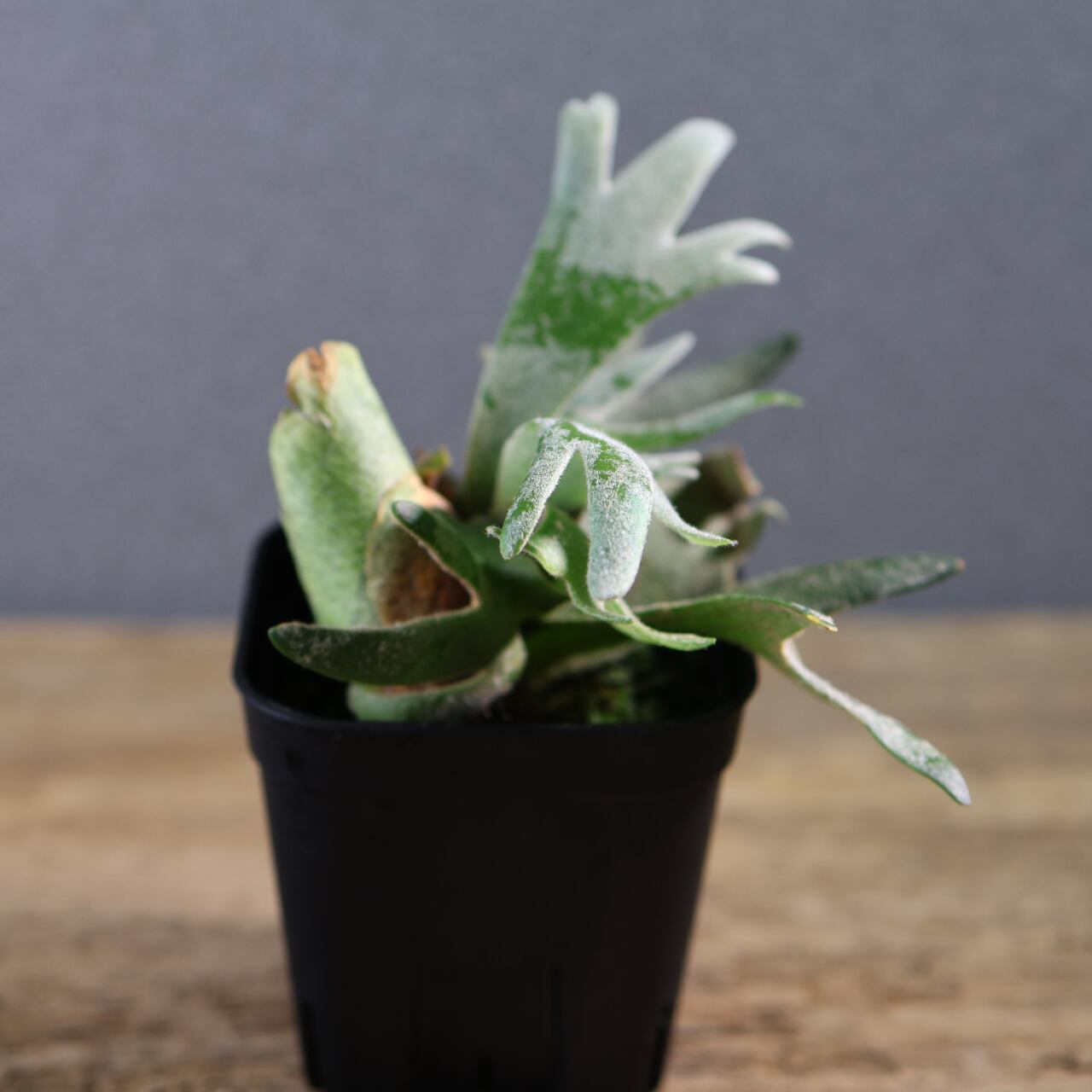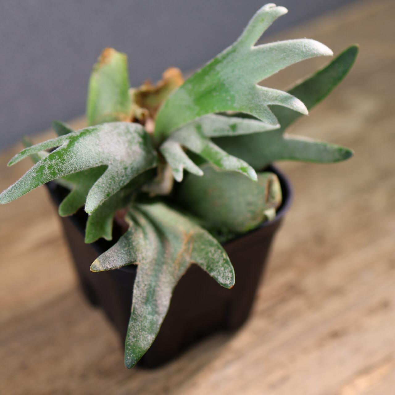 ジェイドガールは、丸みのある肉厚な葉と、やわらかく白みを帯びたグリーンが魅力のビカクシダの園芸品種です。